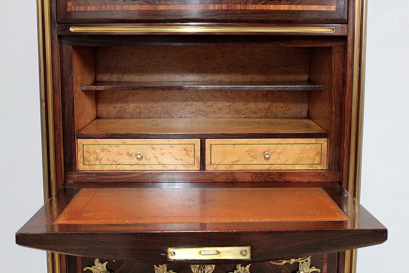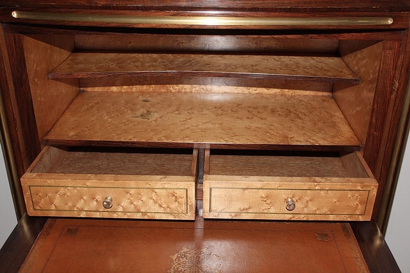 L’abattant découvre un intérieur en érable moucheté composé d’un casier avec étagère et de 2 tiroirs dont la façade est incrustée d’un filet de bois teinté vert. Il est recouvert d’un cuir de couleur fauve qui a été changé.