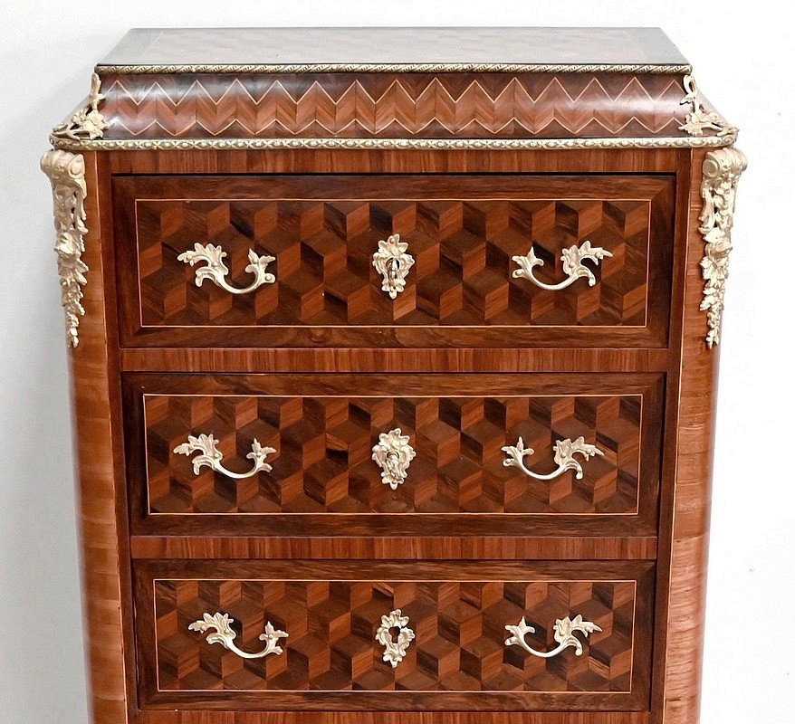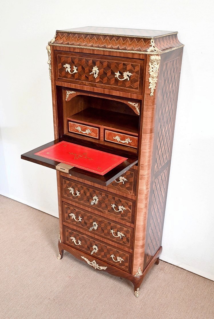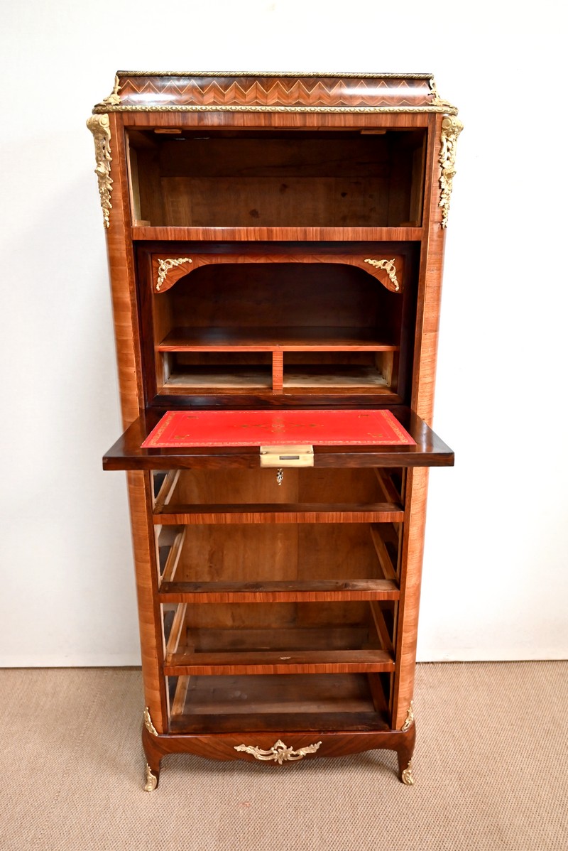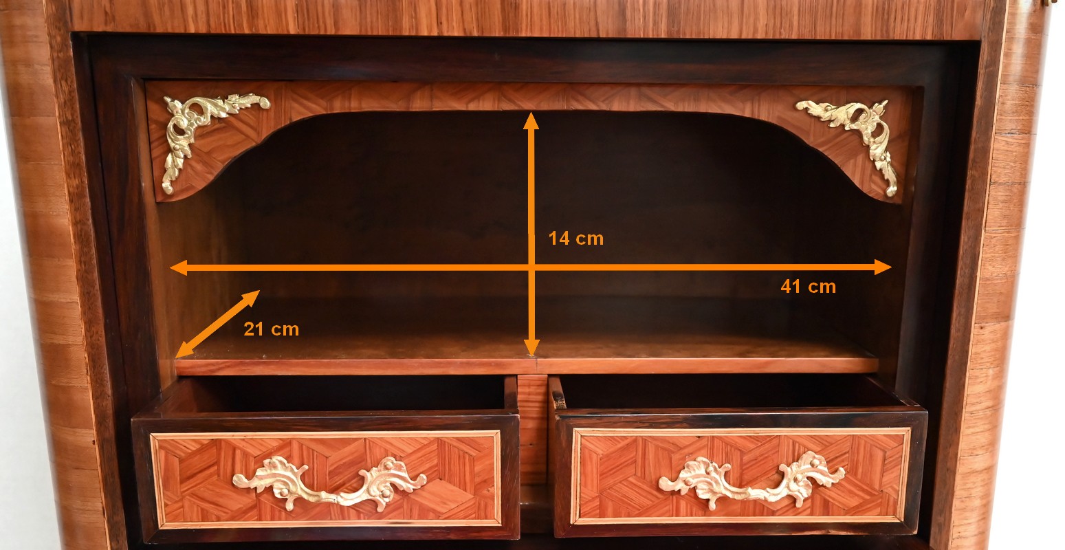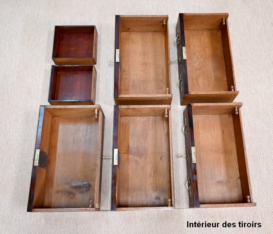 Deux d’entre eux forment un abattant dévoilant une partie écritoire. Une fois ouvert, on y découvre une niche avec chutes de bronze, au-dessus de deux petits tiroirs marquetés de bois de rose avec filet de bois clair et pourtour en palissandre. Une poignée en bronze permet le tirage. L’espace de travail en palissandre est garni d’un cuir rouge actuel avec vignette et motifs d’angle dorés.