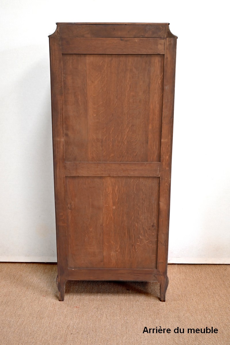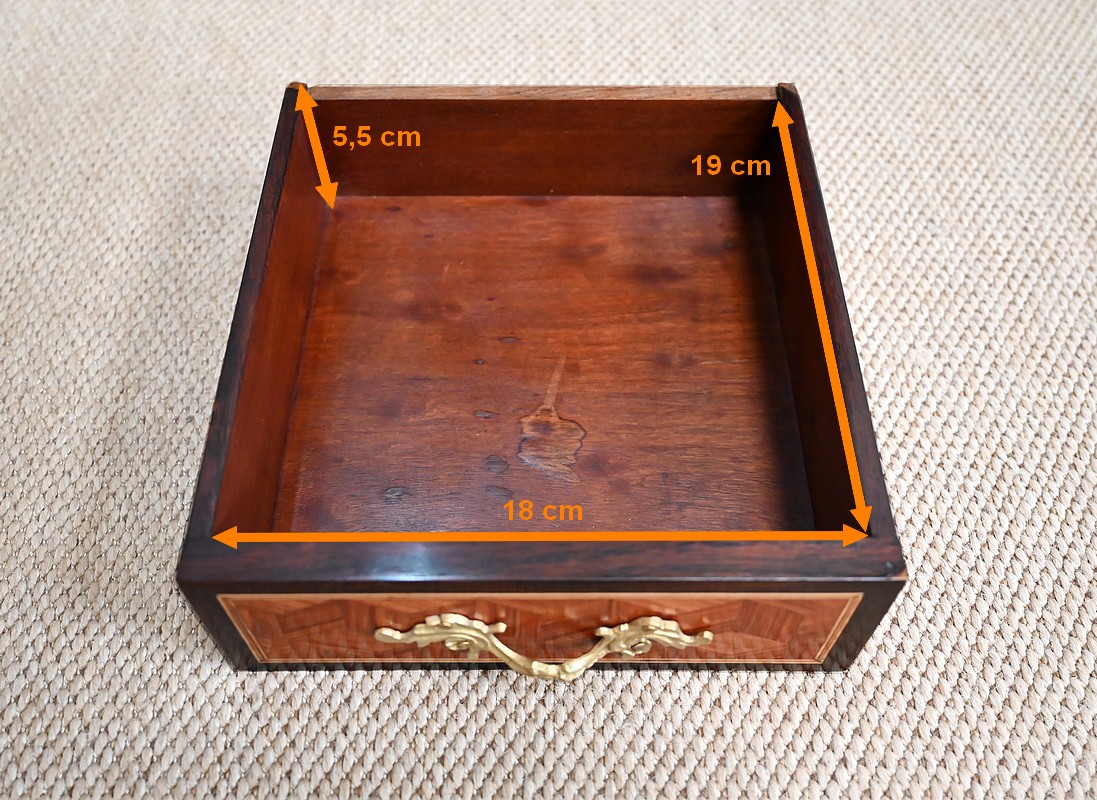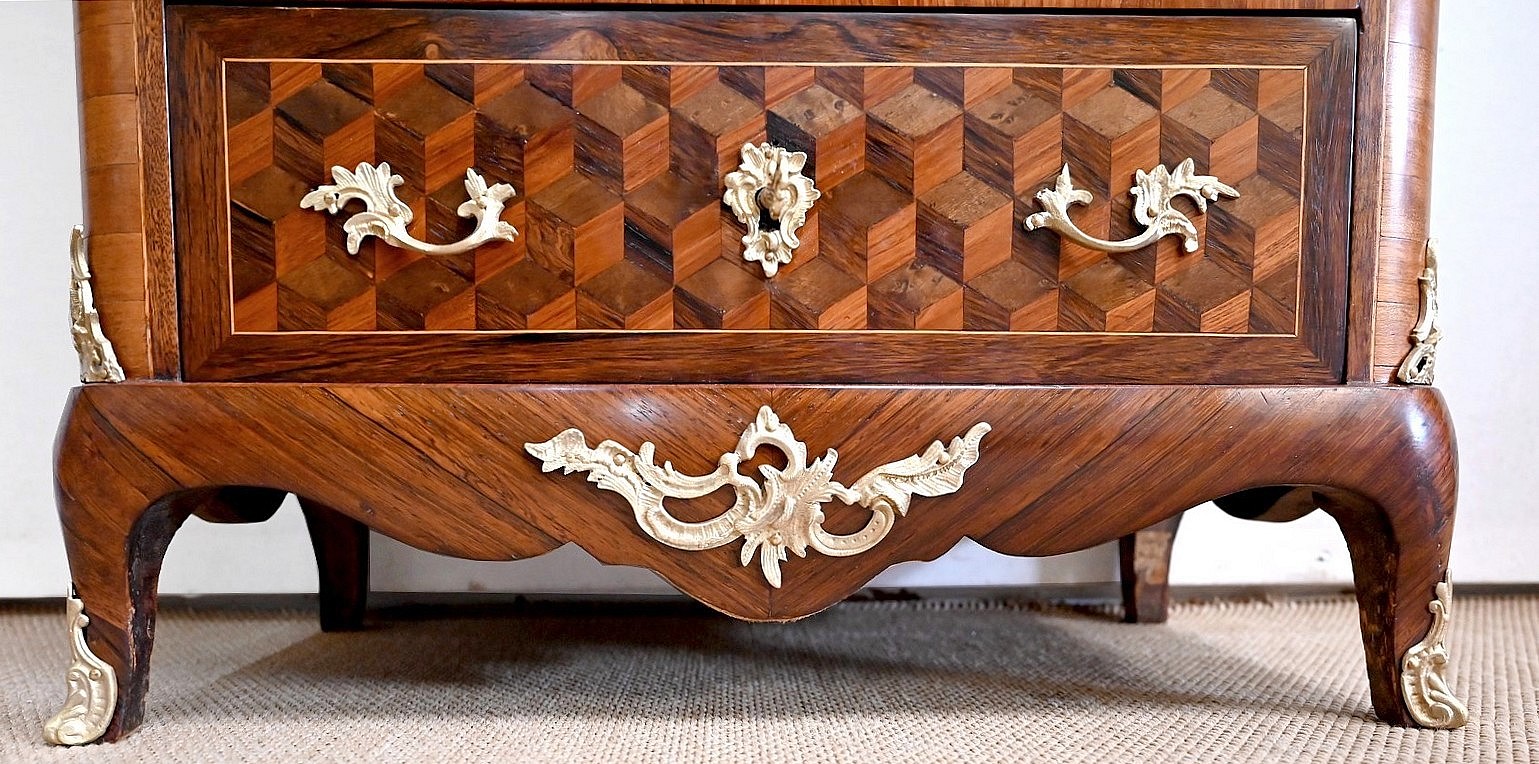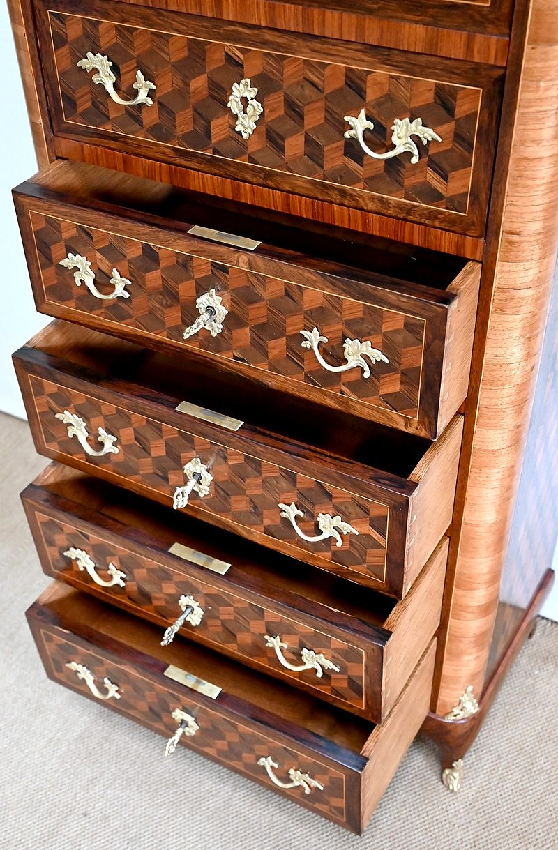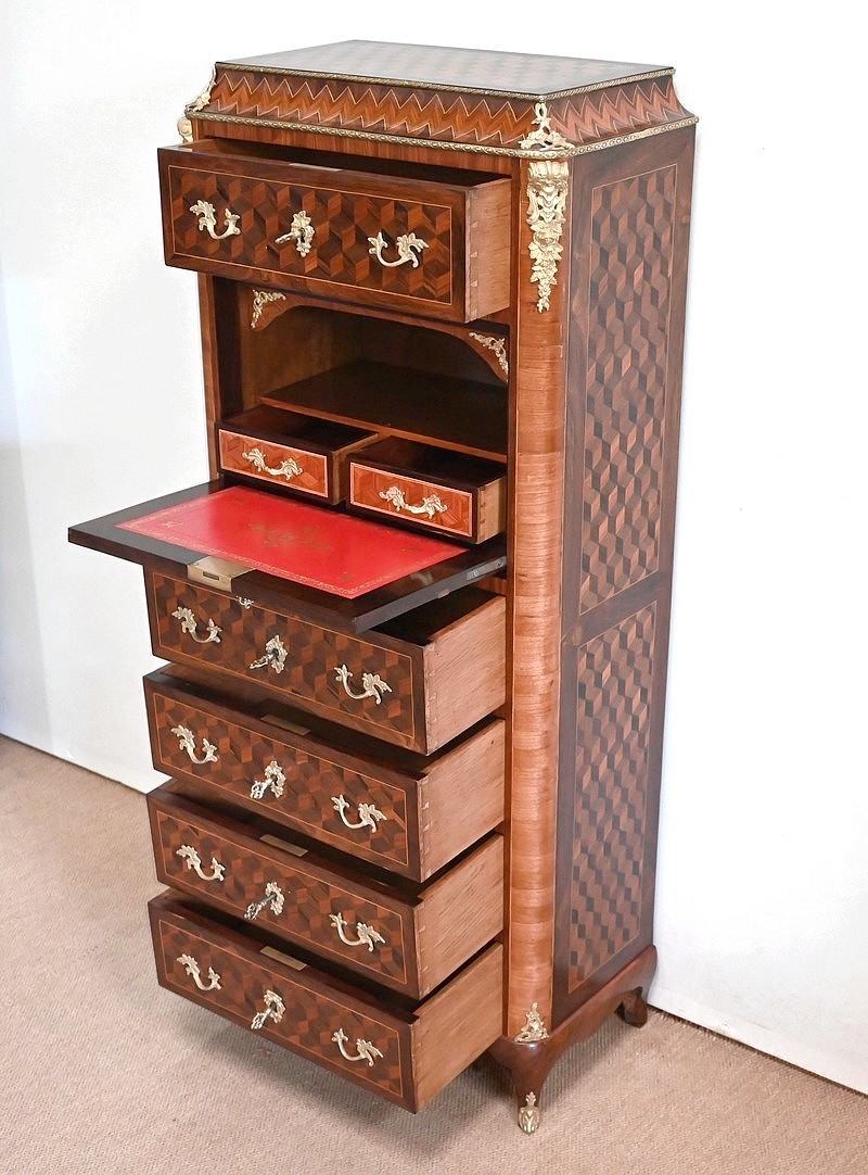 Deux d’entre eux forment un abattant dévoilant une partie écritoire. Une fois ouvert, on y découvre une niche avec chutes de bronze, au-dessus de deux petits tiroirs marquetés de bois de rose avec filet de bois clair et pourtour en palissandre. Une poignée en bronze permet le tirage. L’espace de travail en palissandre est garni d’un cuir rouge actuel avec vignette et motifs d’angle dorés.