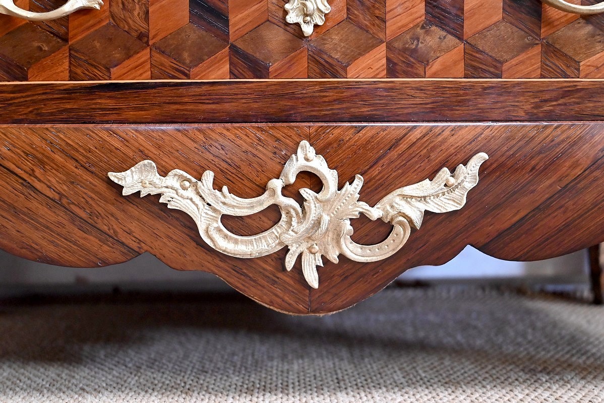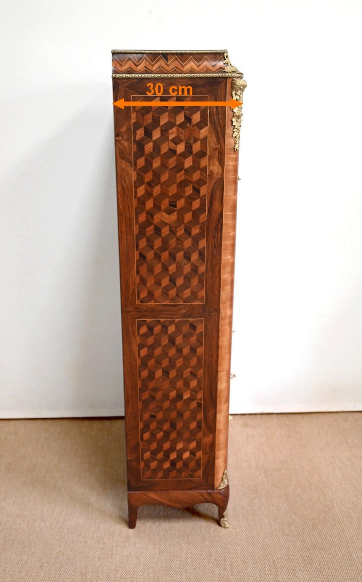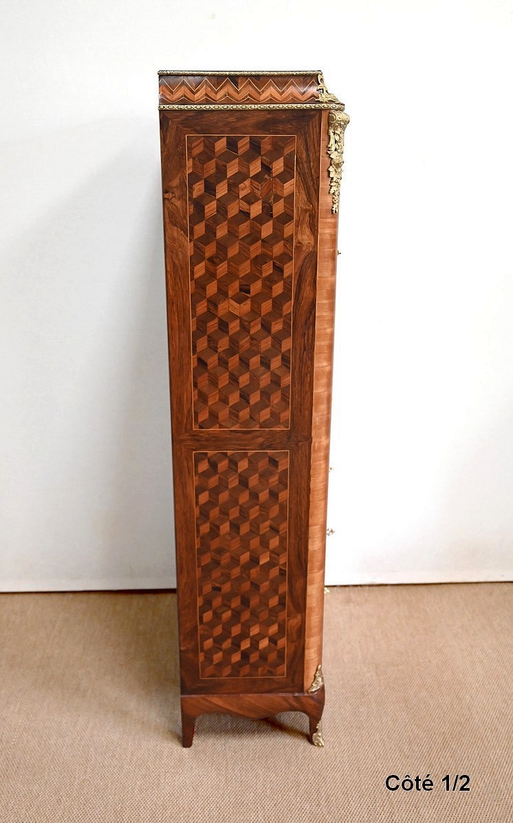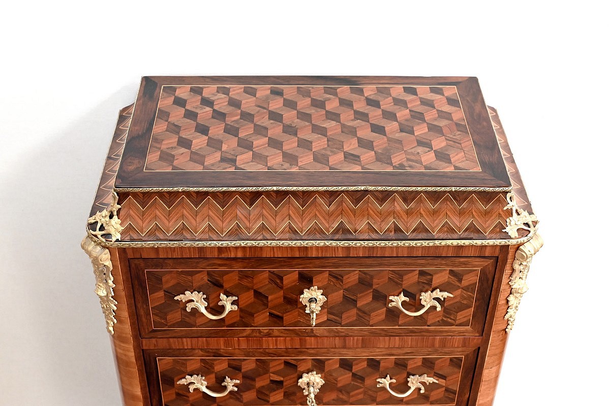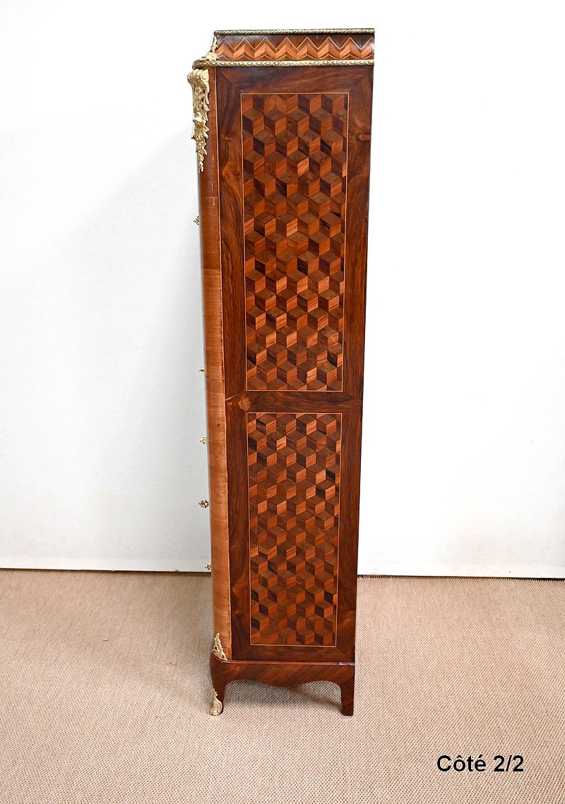 Ce meuble à hauteur d’appui en marqueterie de placage représentant des petits cubes est composé de palissandre, de bois de rose et de loupe de thuya.