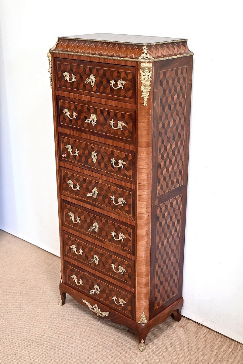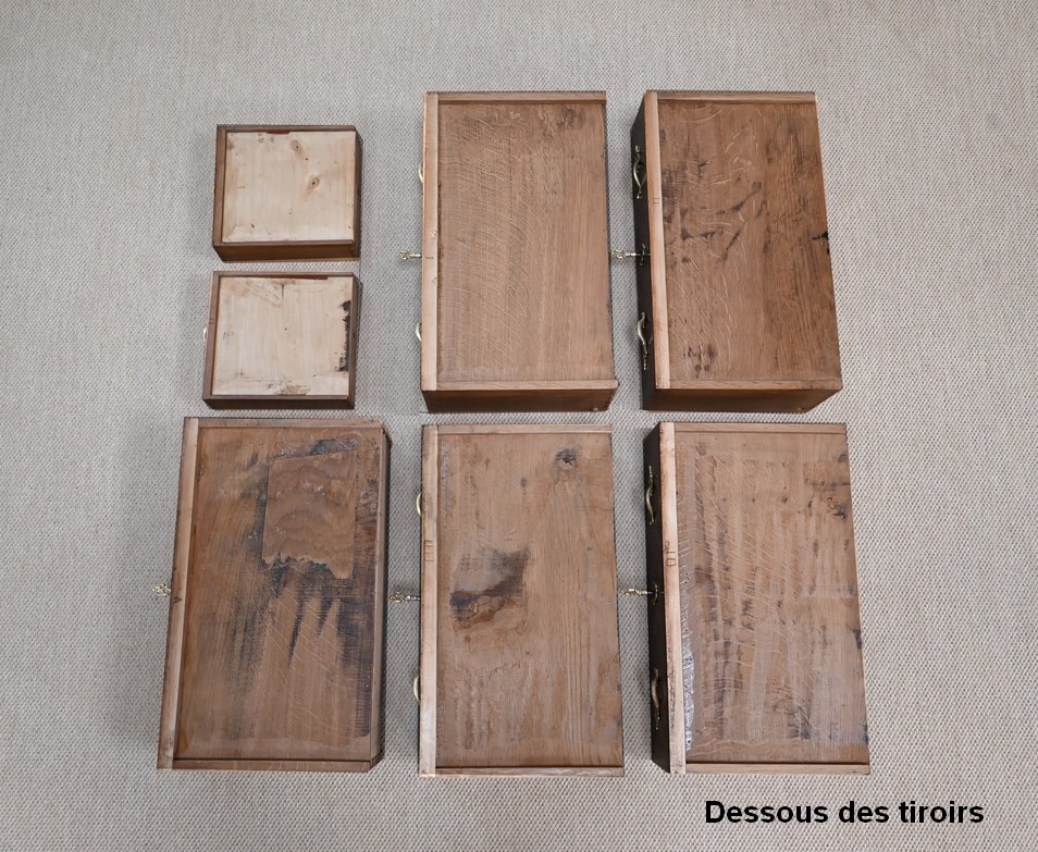 Il comporte sept tiroirs dont chacun est équipé de deux poignées en miroir, d’une entrée bronze et d’une serrure fonctionnelle, le tout d’origine.