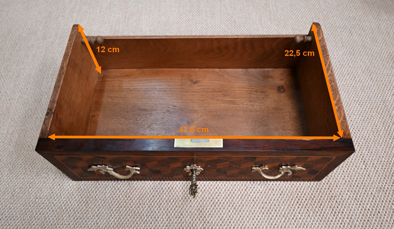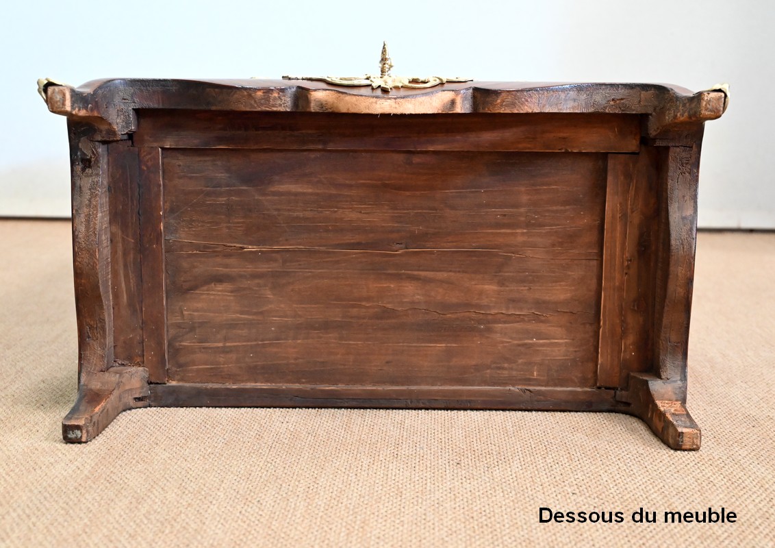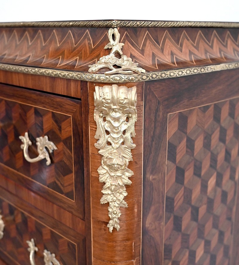 Le dessus de ce mobilier aux côtés concaves, en marqueterie de bois précieux disposée en chevrons, est agrémenté de deux baguettes laiton aux arêtes. Chaque angle est paré d’un motif en bronze représentant des fleurs.