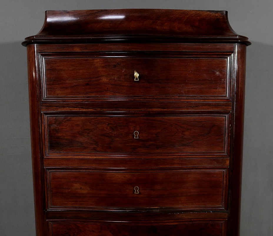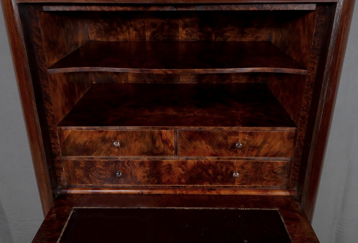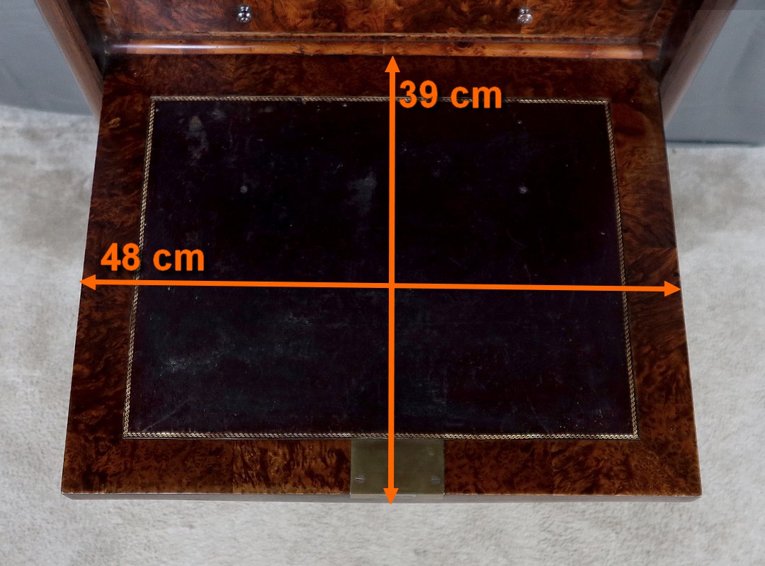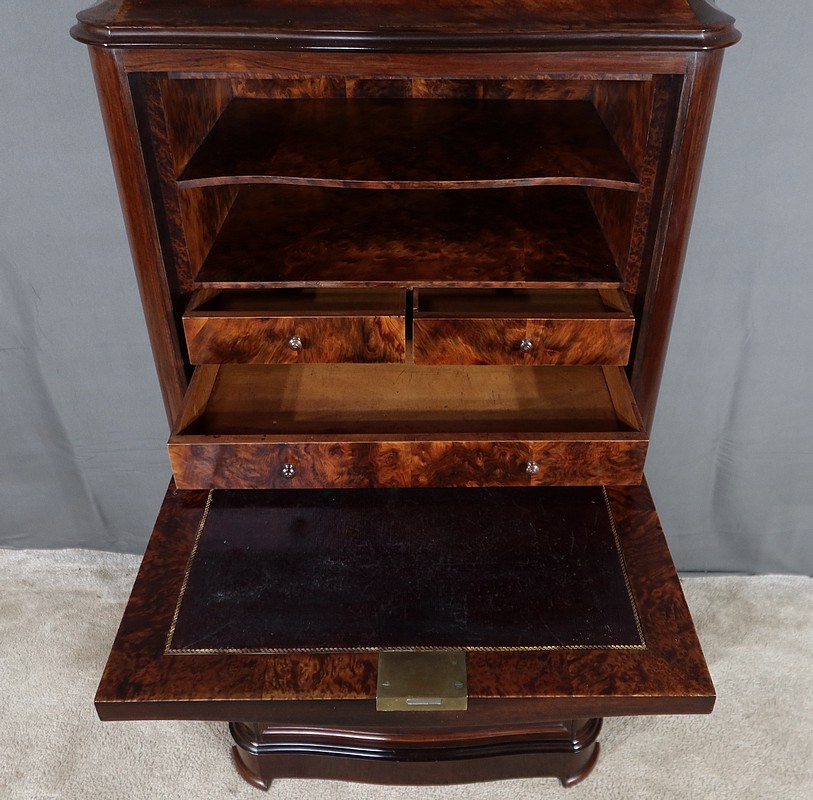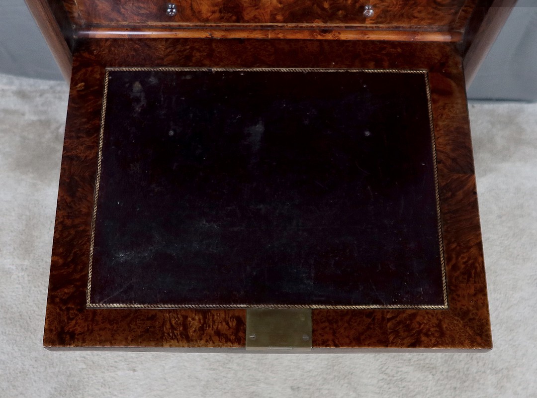 Meuble d’époque Napoléon III en palissandre et intérieur en loupe de thuya, composé en partie haute d’un abattant simulant 3 tiroirs et de quatre tiroirs de même dimensions en partie inférieure.