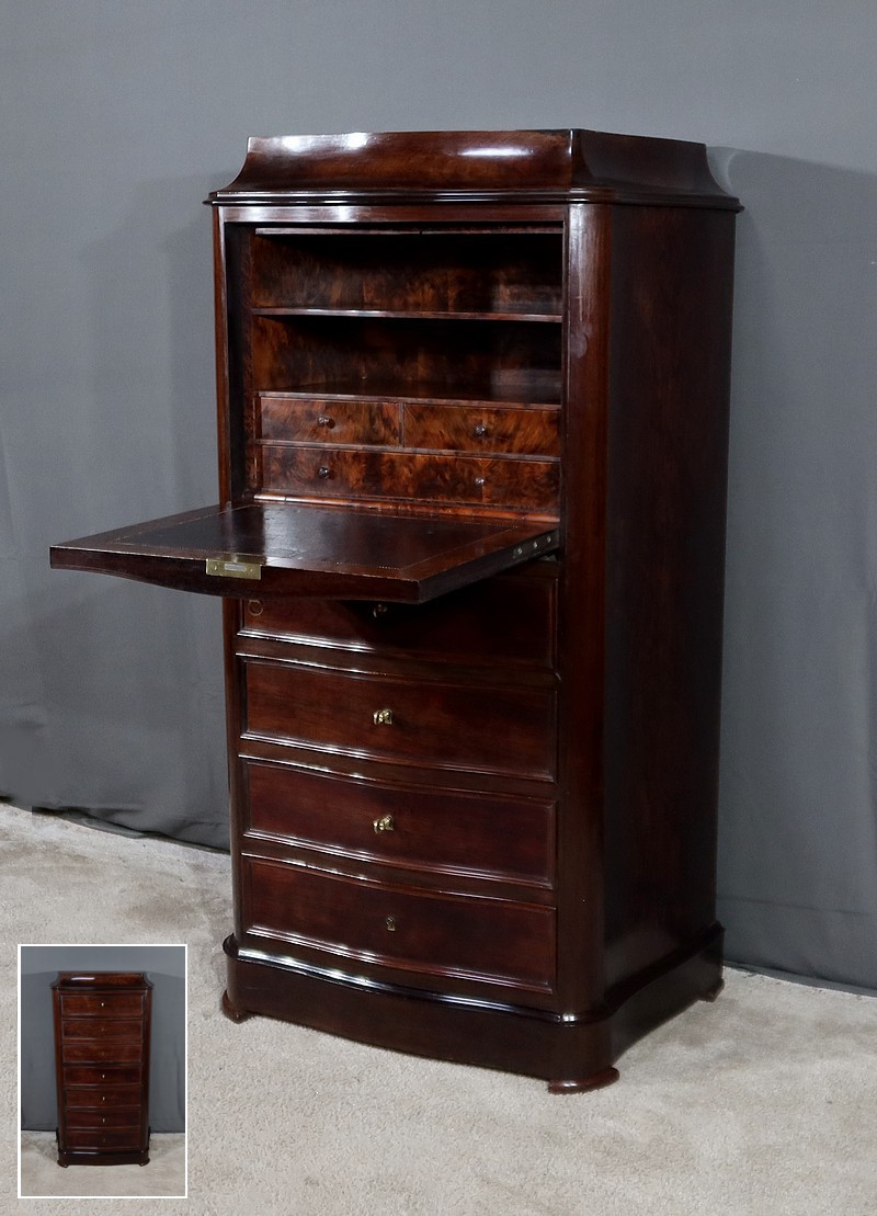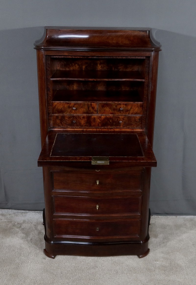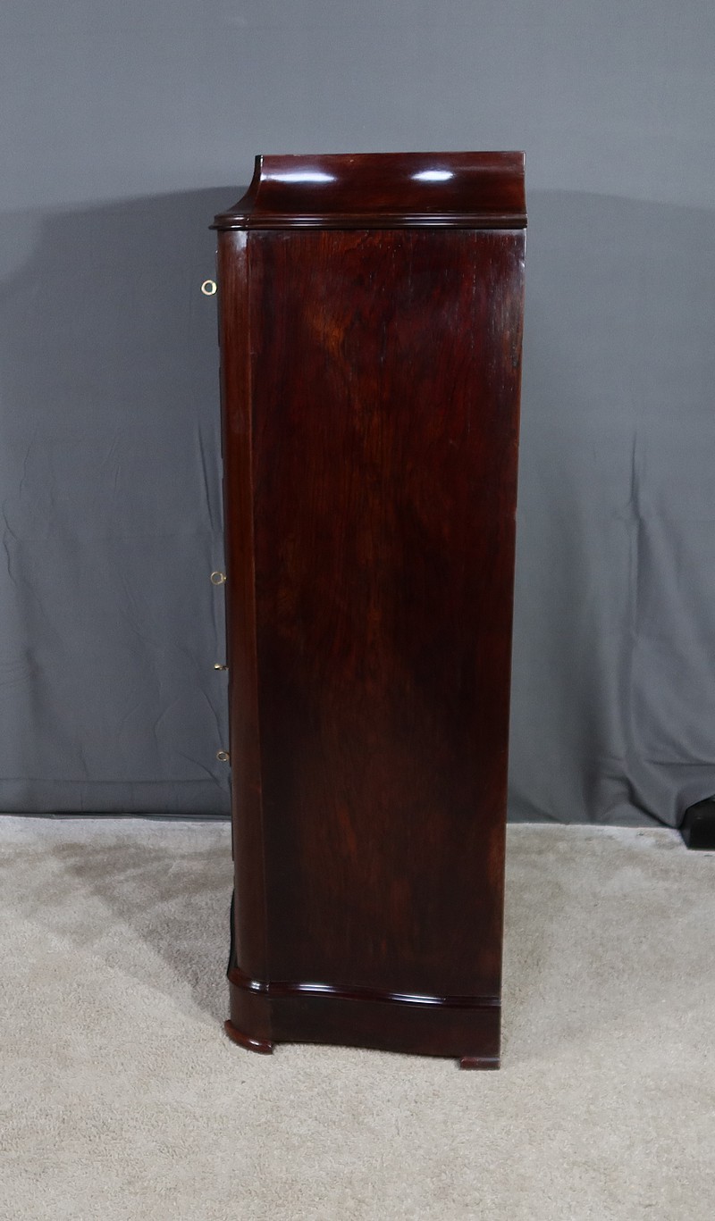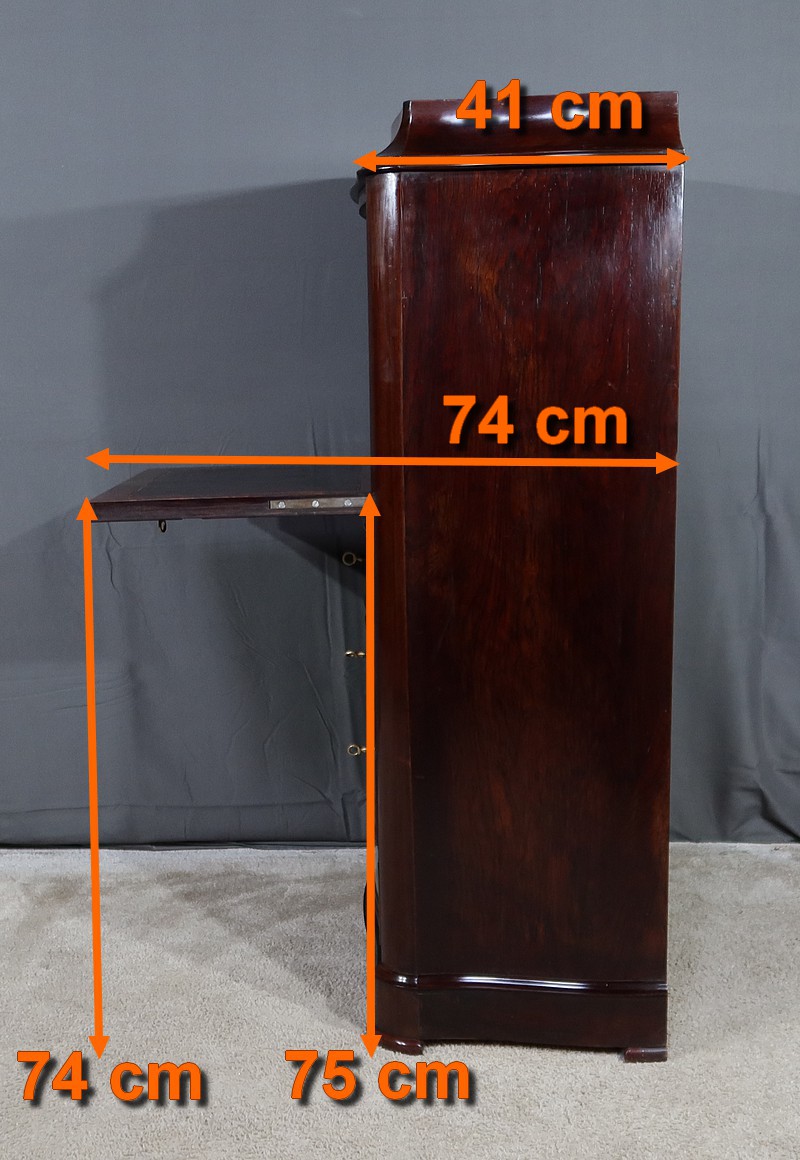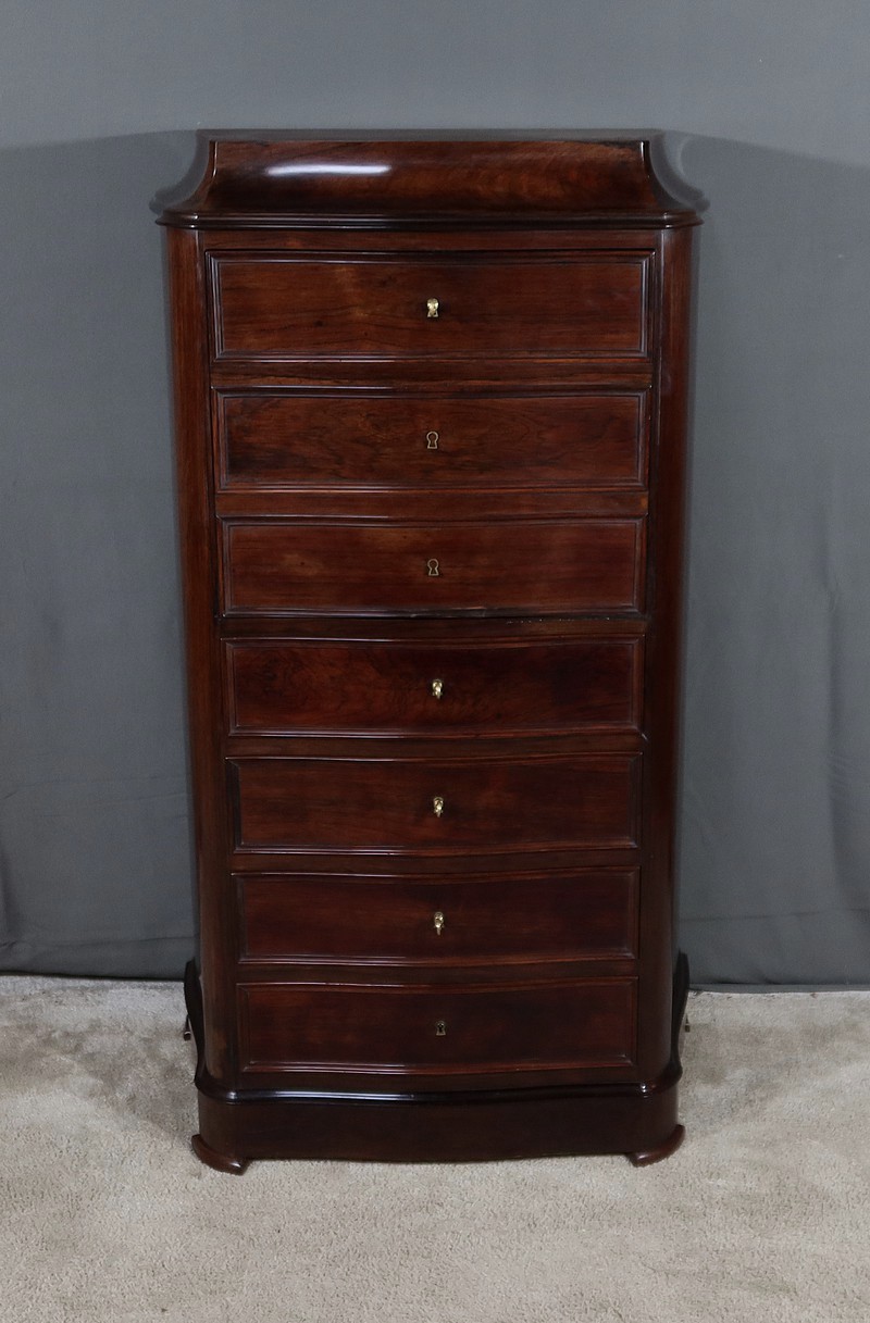 Meuble d’époque Napoléon III en palissandre et intérieur en loupe de thuya, composé en partie haute d’un abattant simulant 3 tiroirs et de quatre tiroirs de même dimensions en partie inférieure.