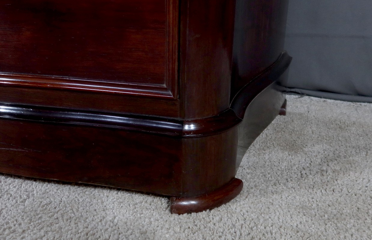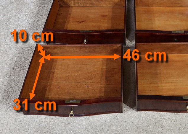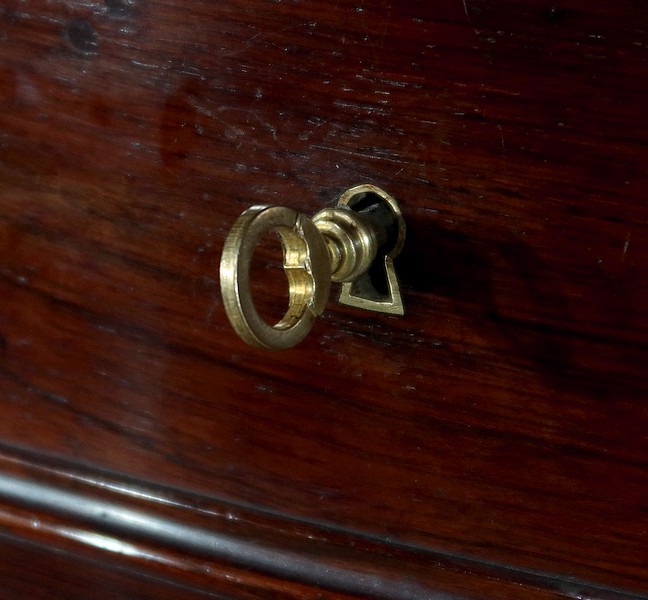 Les tiroirs sont légèrement galbés sur le devant et soulignés par des moulures en relief. Chaque tiroir est muni d’entrées filet et de serrures d’origine accompagnées de leur clé, en état de fonctionnement.