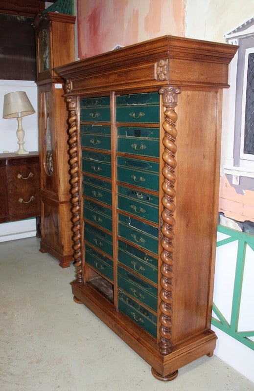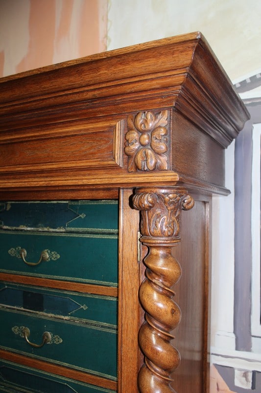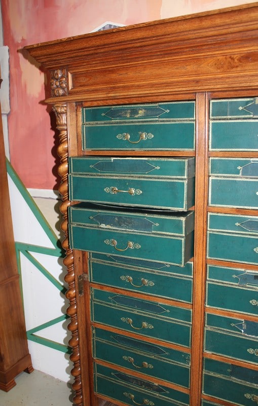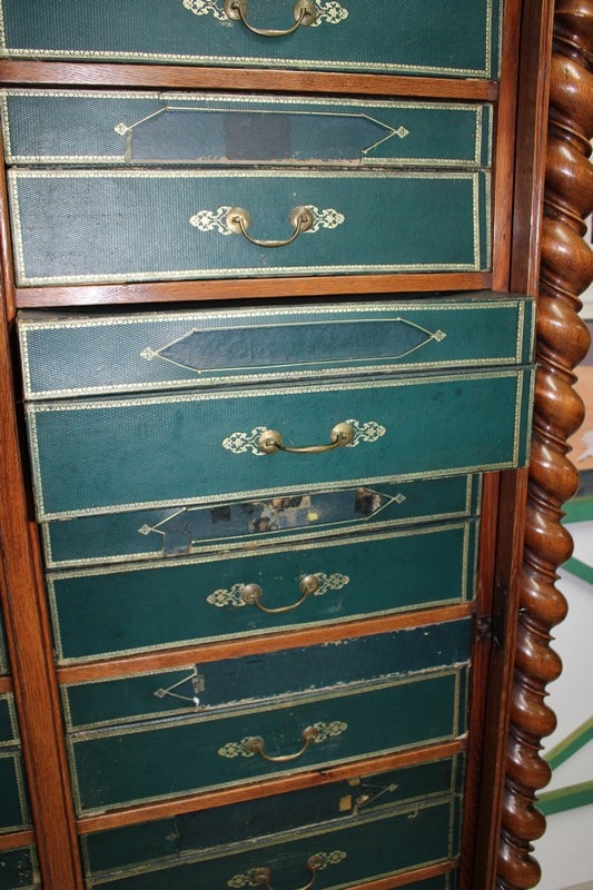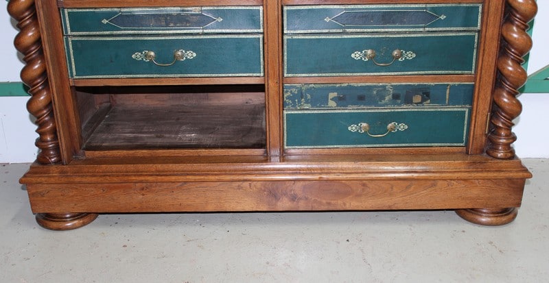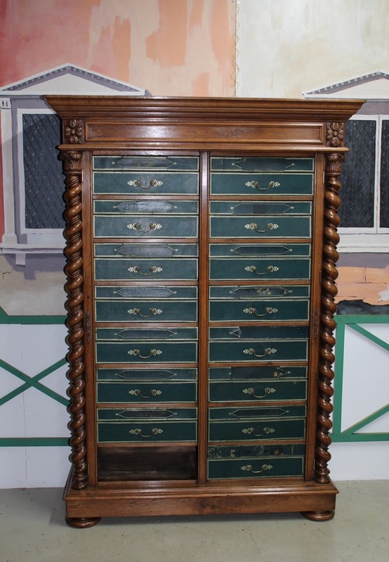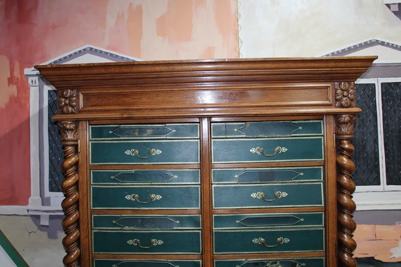 Cartonnier double en chêne avec colonnes torsadées dans le goût Louis XIII, de propriété. Il est garni de 16 boites (15 d’origine et 1 en réfection) dont l’ouverture est bloquée par 2 montants latéraux fermant à clé. Époque : début XXe