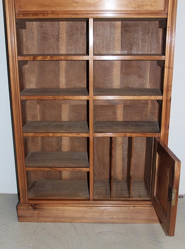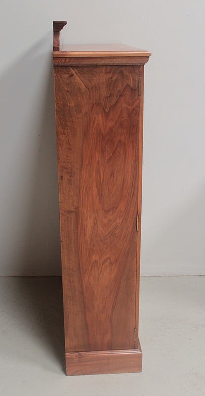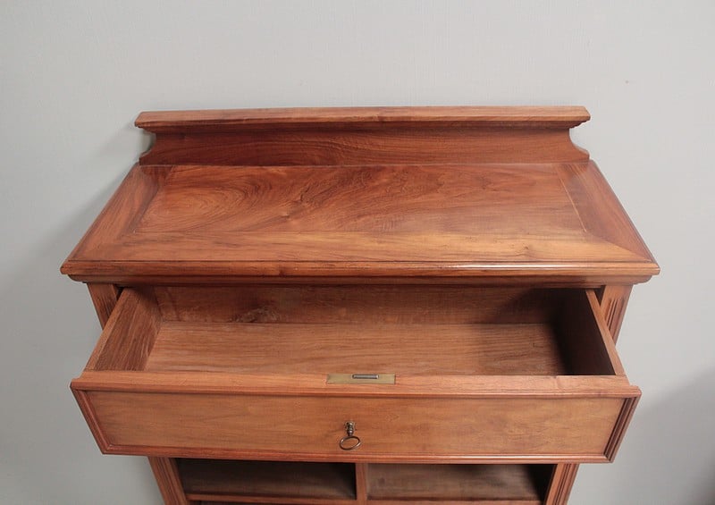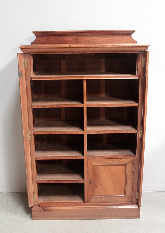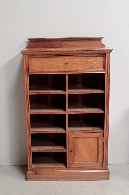 Cartonnier en noyer blond massif, ouvrant par un tiroir en ceinture, cinq casiers à gauche, trois casiers à droite et une porte en partie basse renfermant un classeur vertical.