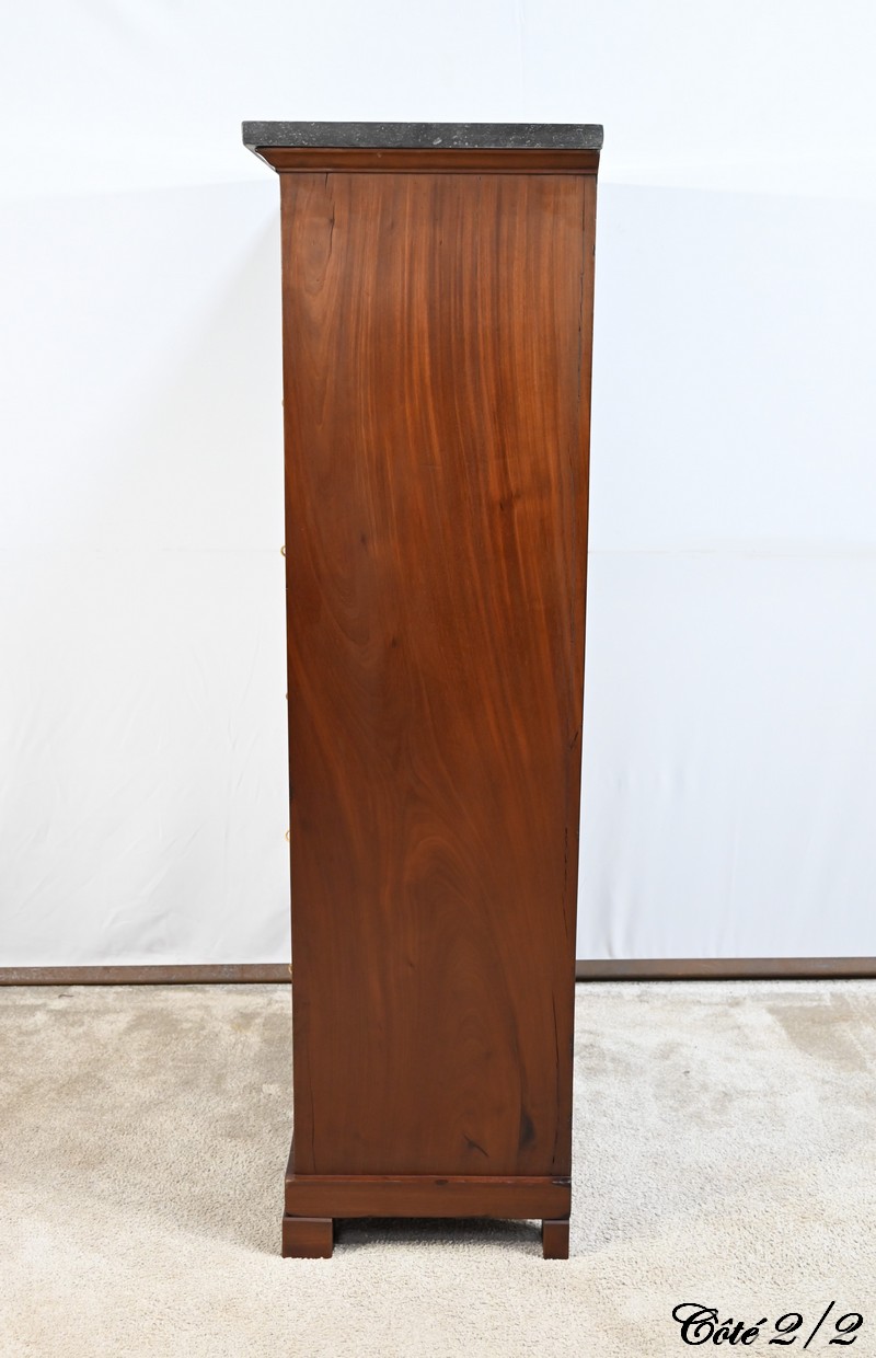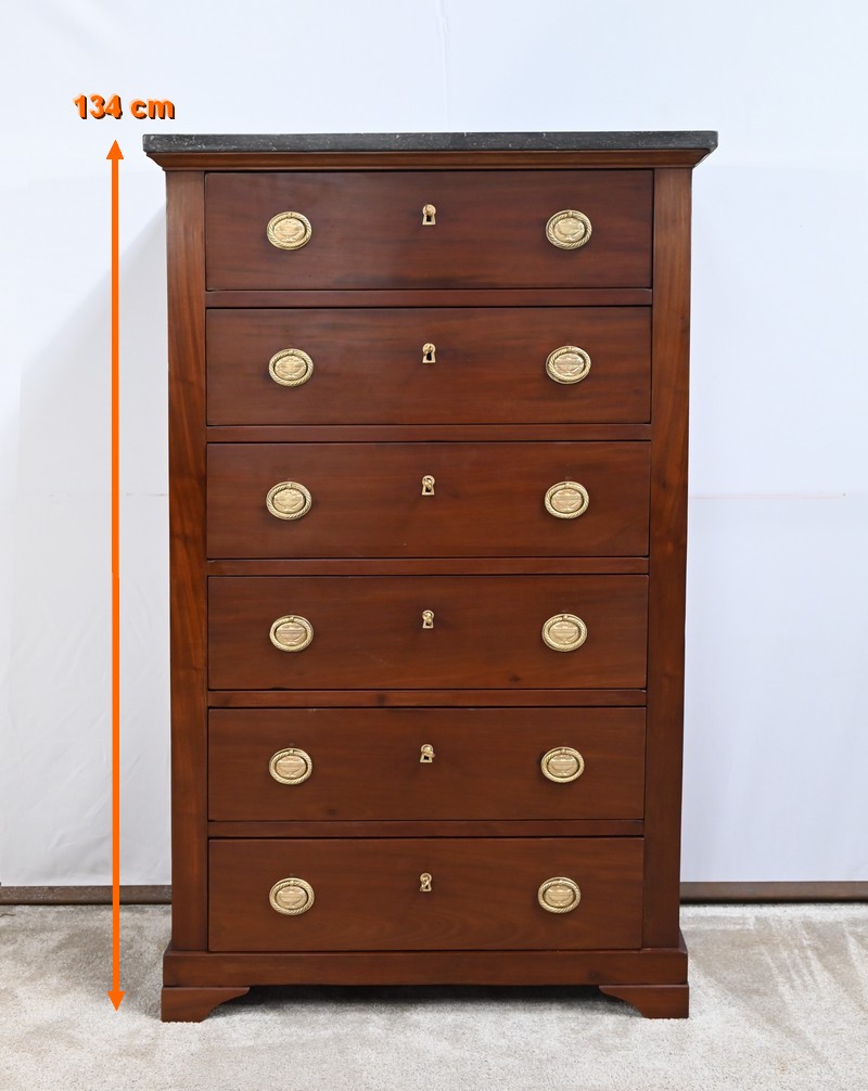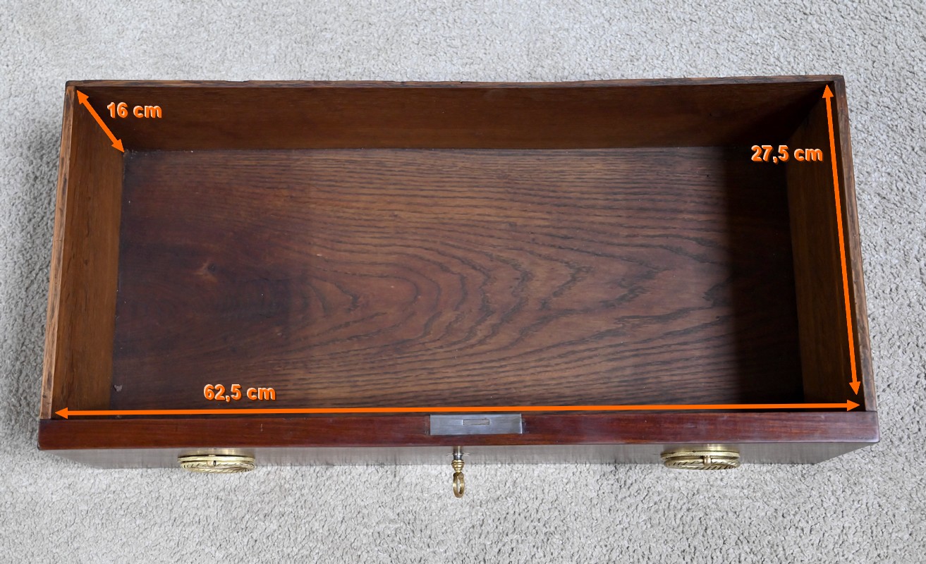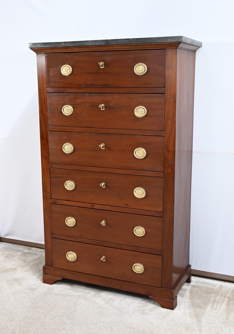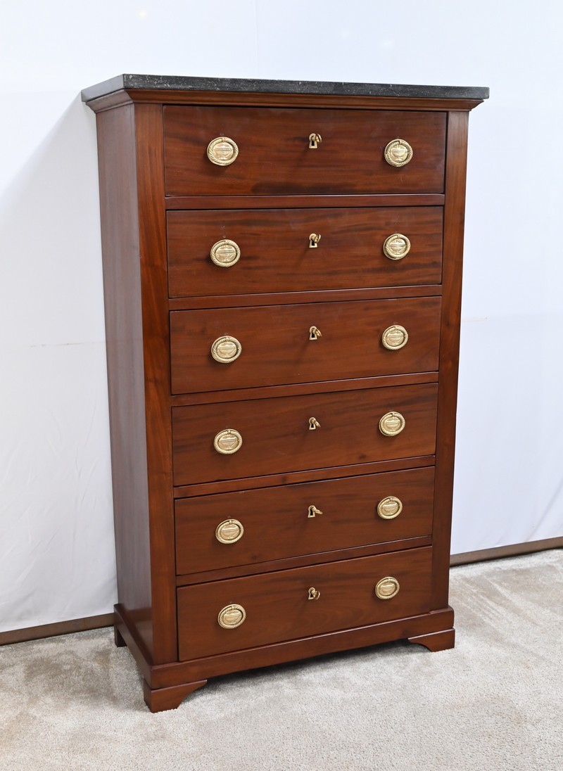 Ce chiffonnier en acajou plaira pour sa faible profondeur et ses lignes droites propres au courant directoire.