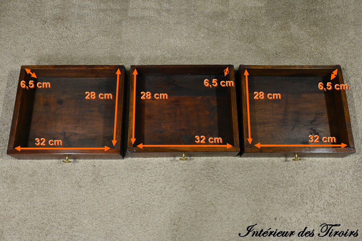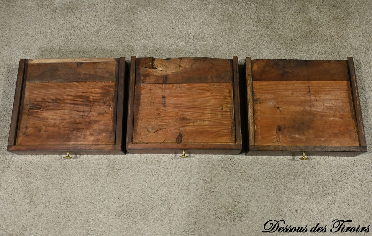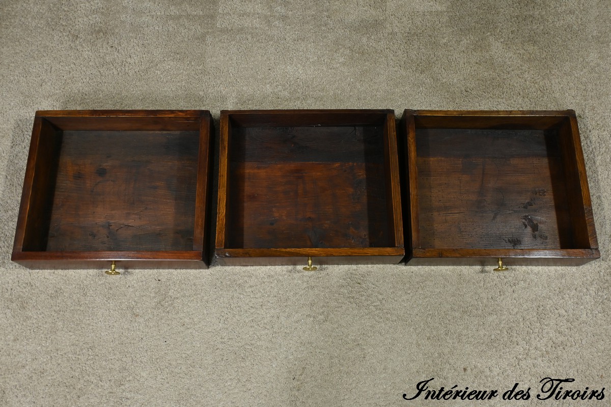 Le chiffonnier s’ouvre par trois tiroirs ornés de boutons en laiton ciselé, ajoutant une touche de sophistication et de raffinement.
