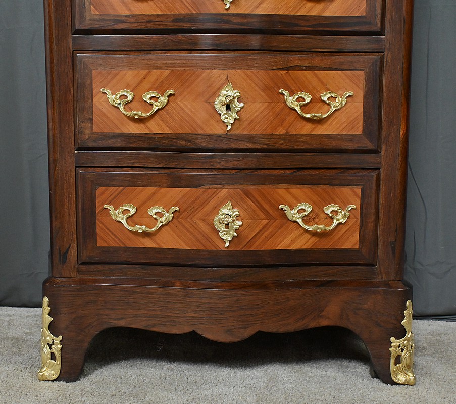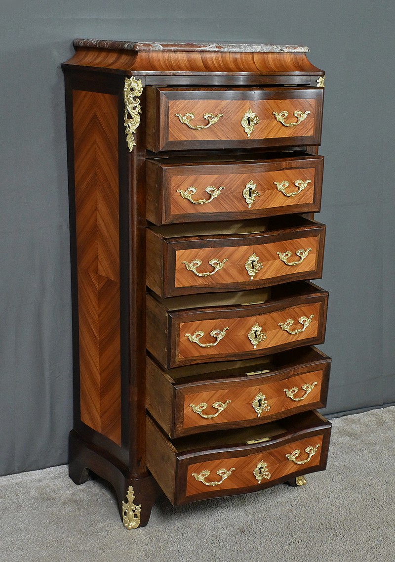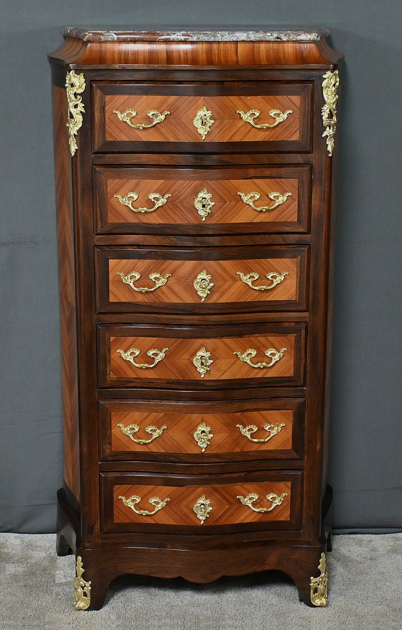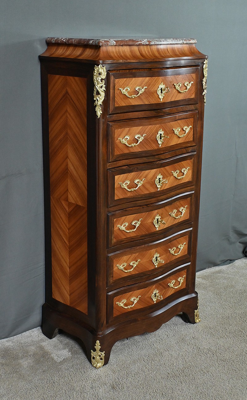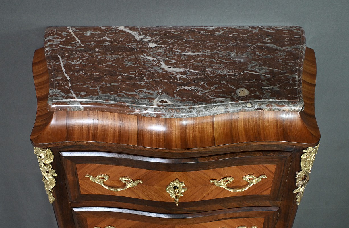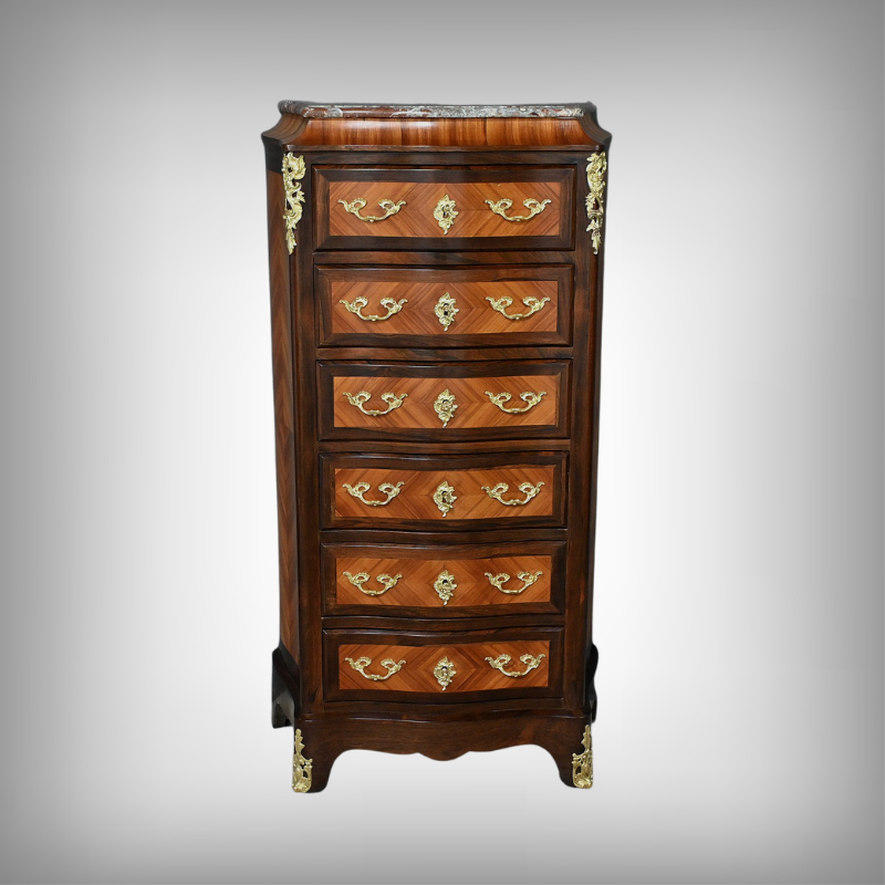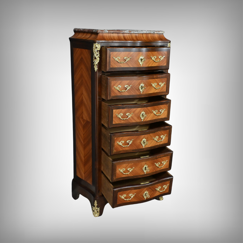 Somptueux chiffonnier de style Louis XV, présentant une façade marquetée en bois de rose disposé en aile de papillon, sublimée par un entourage en palissandre. Ses six tiroirs, dotés de poignées de tirage en bronze ciselé, offrent une capacité de rangement généreuse tout en conservant une finesse incomparable. Chaque détail respire l’excellence artisanale, de la serrure fonctionnelle avec clé sculptée à l’entrée raffinée typique du style Louis XV. Ce meuble élégamment conçu est couronné d’un superbe marbre rouge des Pyrénées, ajoutant une touche distinctive. Enfin, les montants enrichis de chutes en bronze ainsi que les garnitures de bronze sur les pieds parachèvent son allure noble et intemporelle. Les côtés sont constitués d’un placage de bois de rose disposé en ailes de papillon avec entourage en palissandre. Un magnifique meuble qui ravira par sa petite dimension et sa qualité.