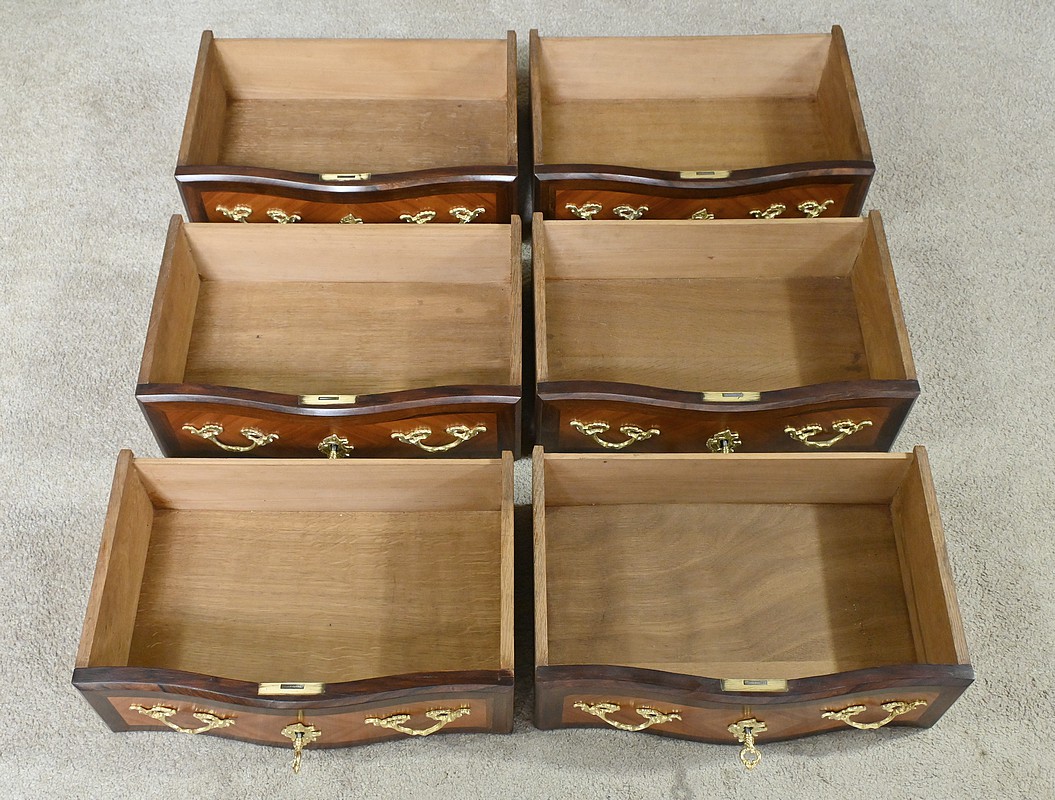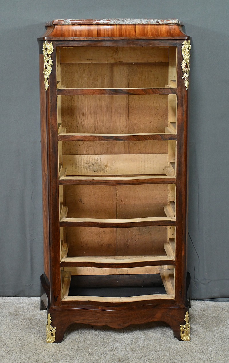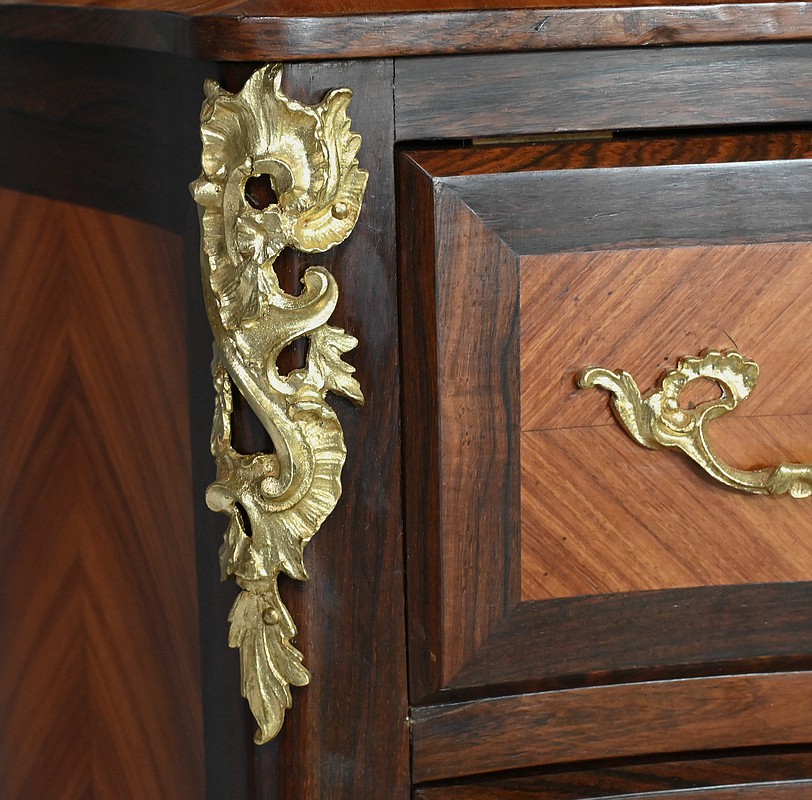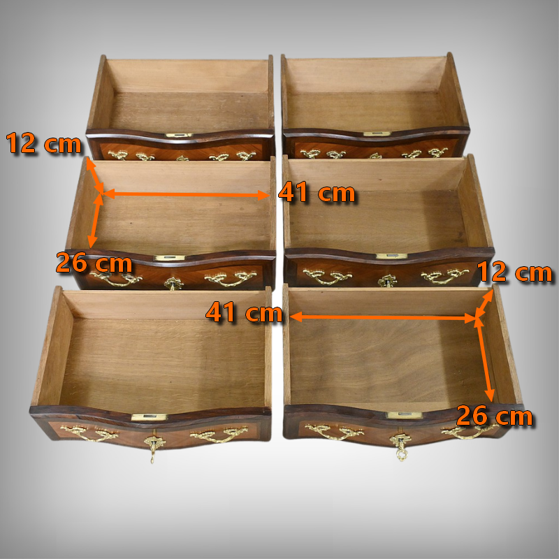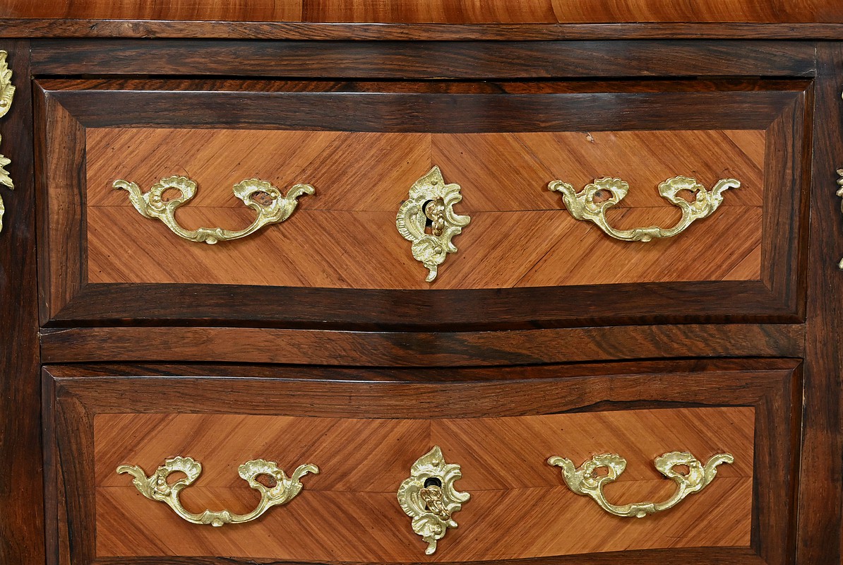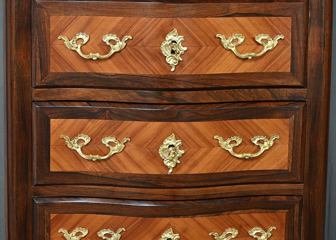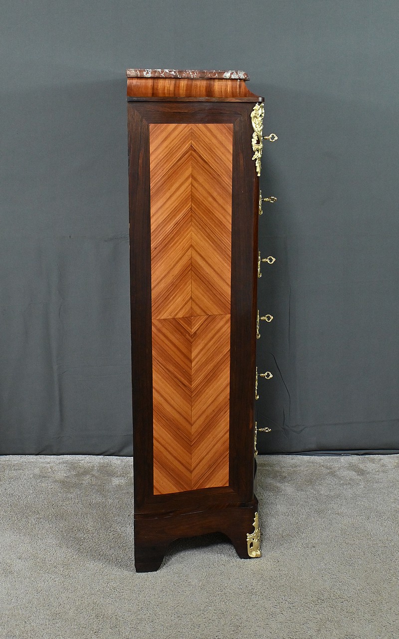 Somptueux chiffonnier de style Louis XV, présentant une façade marquetée en bois de rose disposé en aile de papillon, sublimée par un entourage en palissandre. Ses six tiroirs, dotés de poignées de tirage en bronze ciselé, offrent une capacité de rangement généreuse tout en conservant une finesse incomparable. Chaque détail respire l’excellence artisanale, de la serrure fonctionnelle avec clé sculptée à l’entrée raffinée typique du style Louis XV. Ce meuble élégamment conçu est couronné d’un superbe marbre rouge des Pyrénées, ajoutant une touche distinctive. Enfin, les montants enrichis de chutes en bronze ainsi que les garnitures de bronze sur les pieds parachèvent son allure noble et intemporelle. Les côtés sont constitués d’un placage de bois de rose disposé en ailes de papillon avec entourage en palissandre. Un magnifique meuble qui ravira par sa petite dimension et sa qualité.