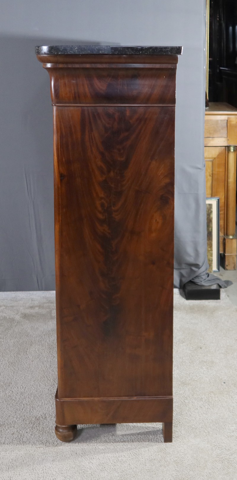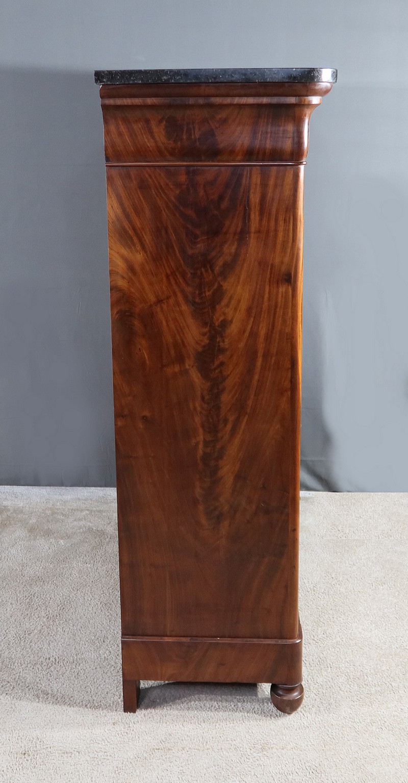 Ce meuble est sommé d’un marbre « petit granité belge » au contours arrondis sur l’avant.
