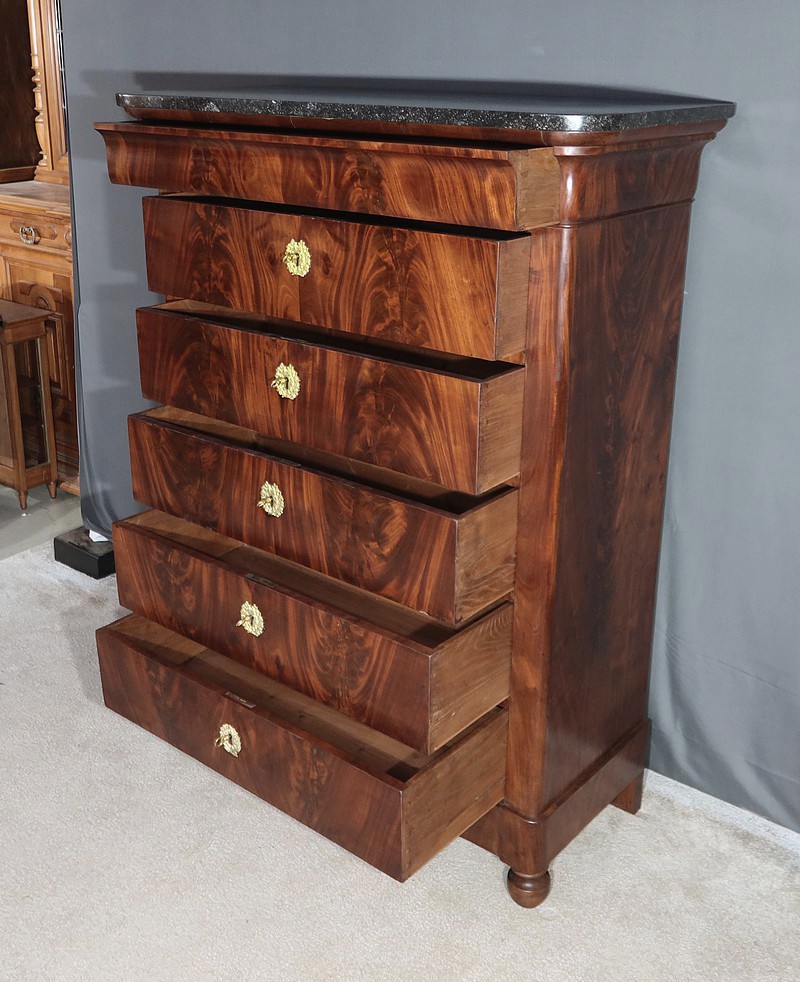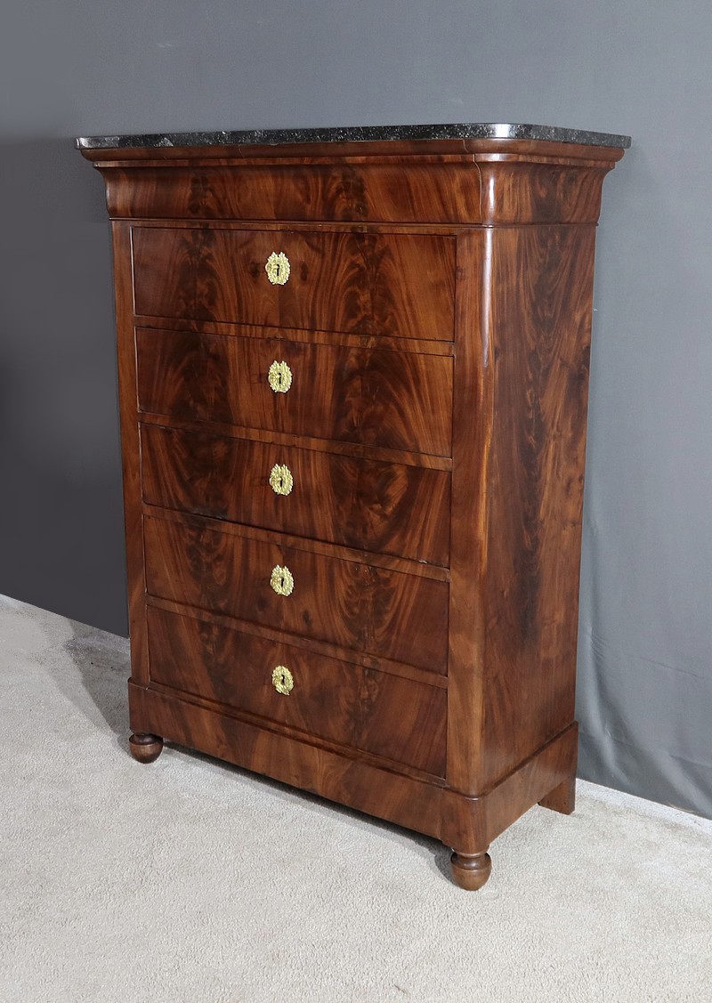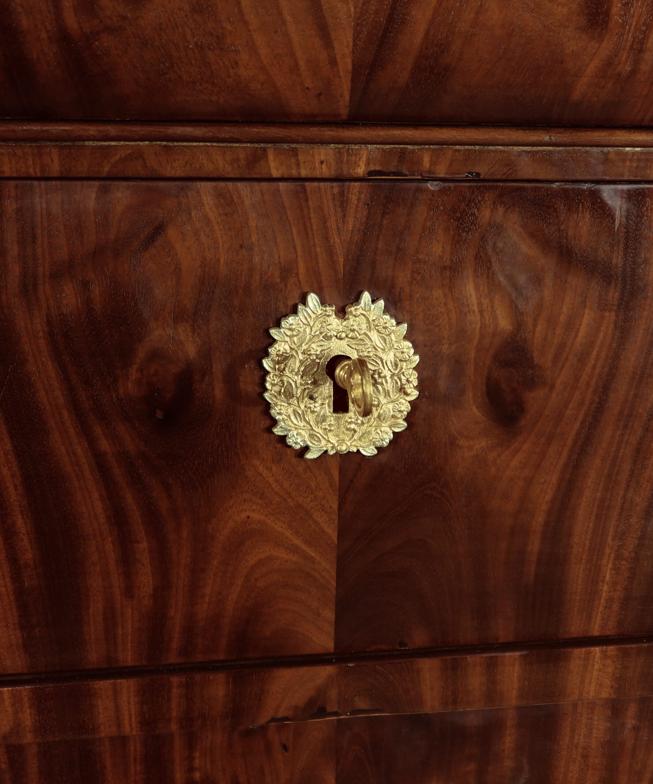Ce chiffonnier en ronce d’acajou de dimension idéale ouvre par 5 tiroirs identiques garnis de belles entrées en bronze doré représentant des couronnes de laurier fleuries.