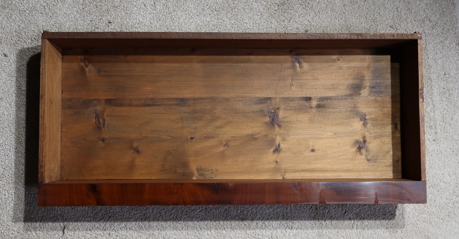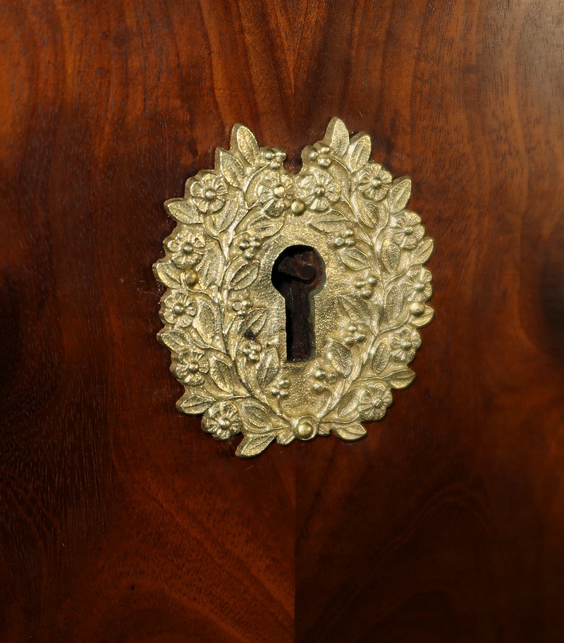 Ces tiroirs sont chacun muni d’une serrure avec clé en parfait état de fonctionnement. En partie haute du meuble, un tiroir secret est dissimulé dans la ceinture.