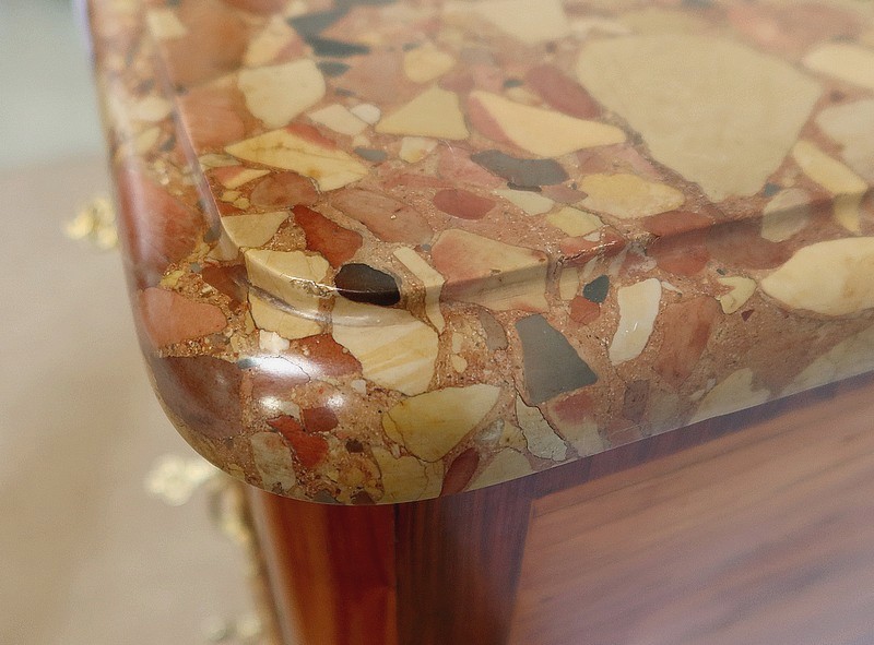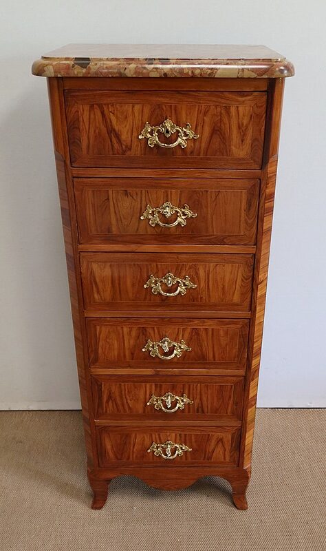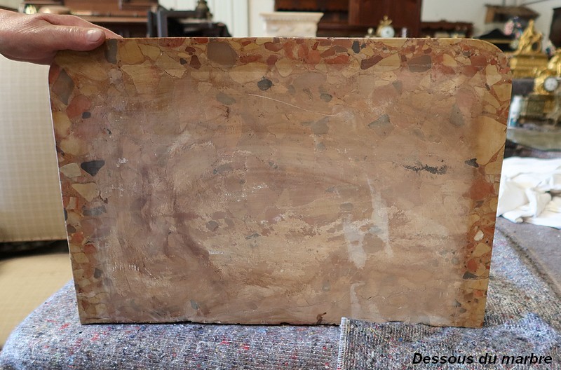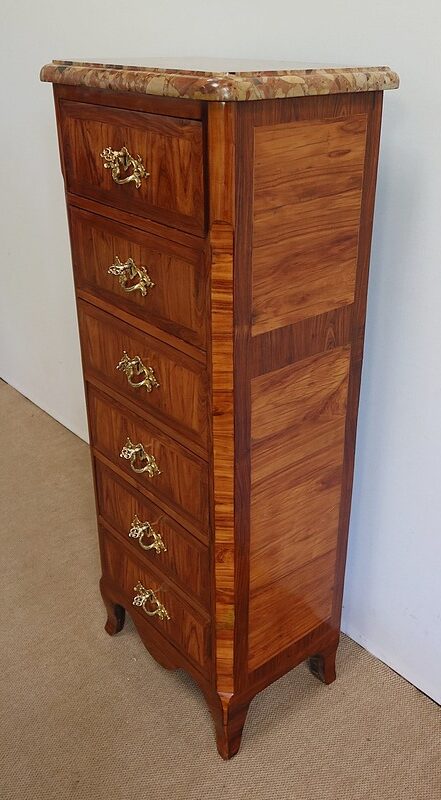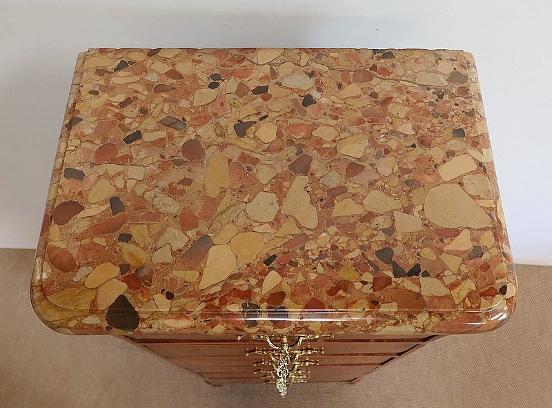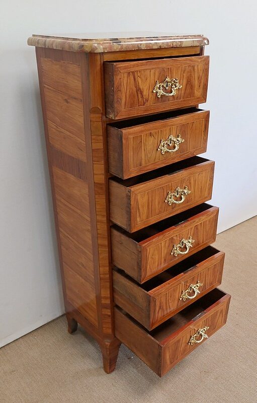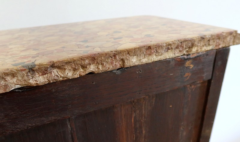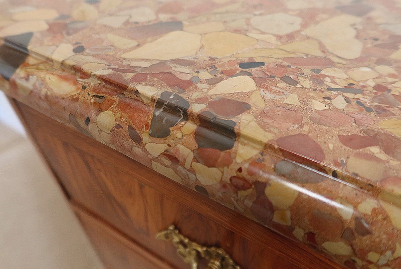 Un authentique marbre brèche d’Alep, épais de 3.3 cm, et mouluré en bec de corbin, recouvre le dessus de ce chiffonnier.
