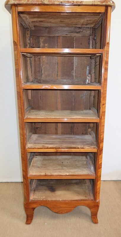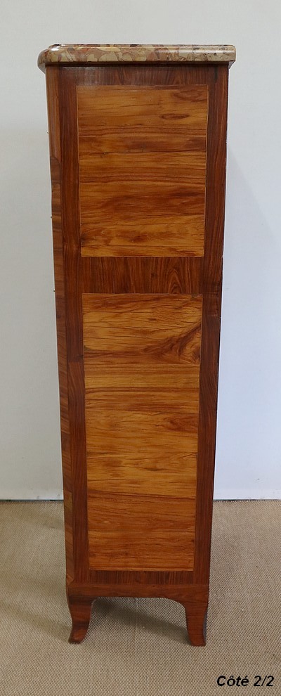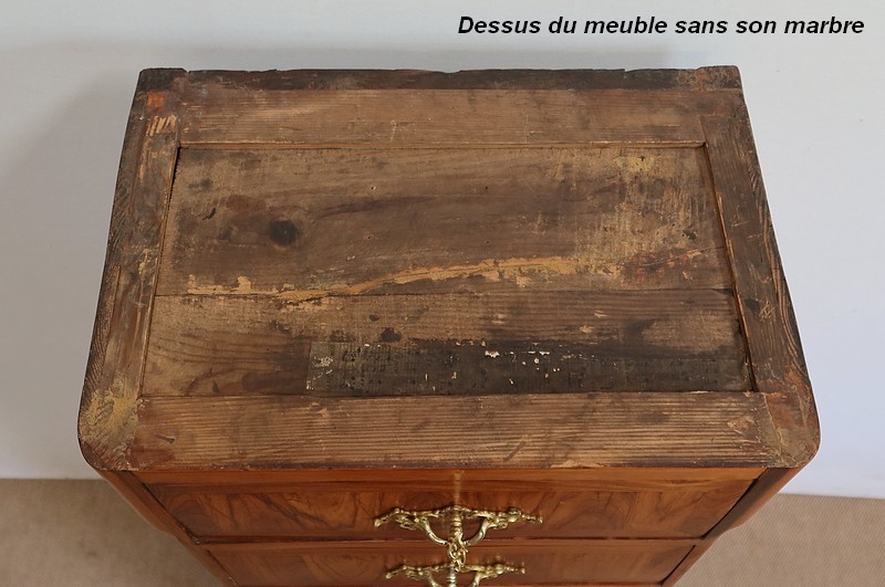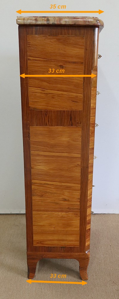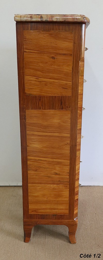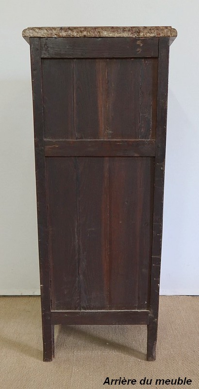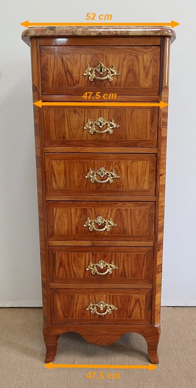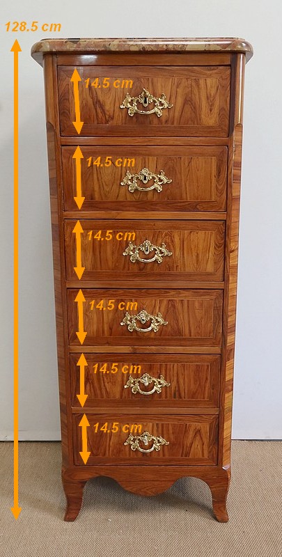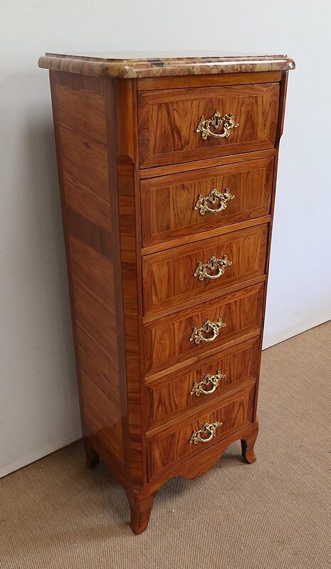 Un authentique marbre brèche d’Alep, épais de 3.3 cm, et mouluré en bec de corbin, recouvre le dessus de ce chiffonnier.