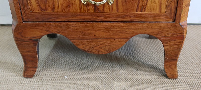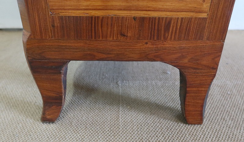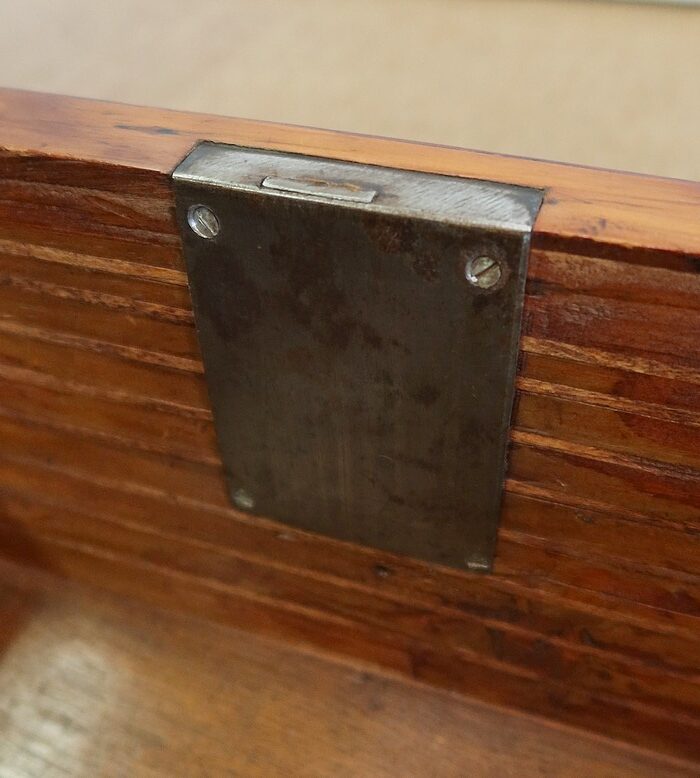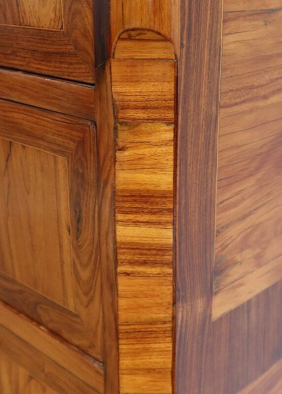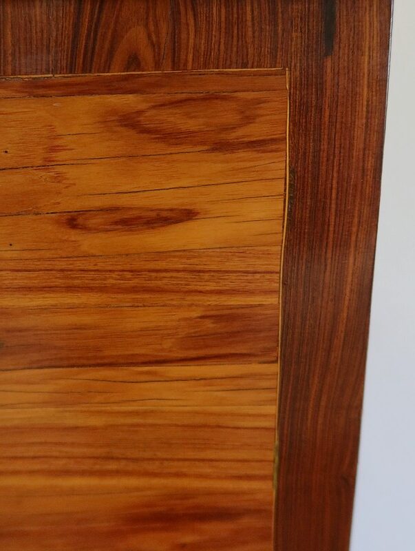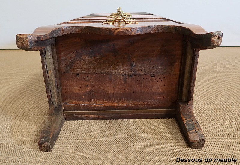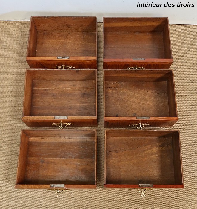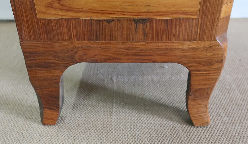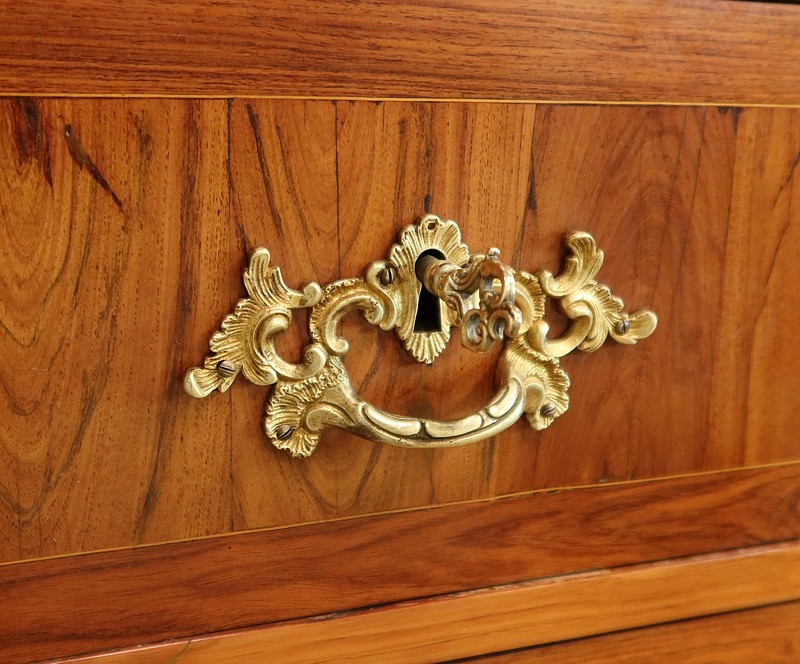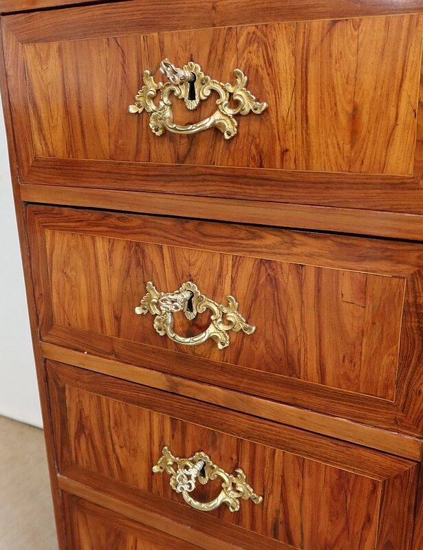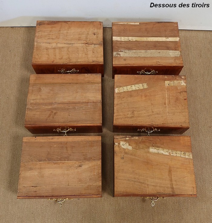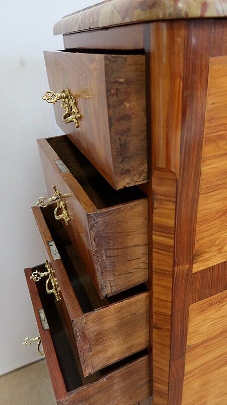 Ce meuble ouvre par six tiroirs de mêmes dimensions, séparés par des caches poussières. Chacun d’eux est pourvu d’une poignée rocaille en bronze, d’origine, avec entrée de serrure intégrée. Ces dernières, fonctionnelles, sont toutes accompagnées de leurs clés ajustées. Les façades de ces tiroirs sont constituées de marqueteries de bois de rose, de filets de citronnier et d’encadrements en bois de violette, disposition reprises sur les côtés et les montants à chanfreins de ce meuble.