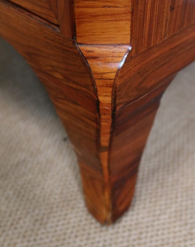 L’ensemble repose sur quatre petits pieds au galbe discret, avec arêtes en bois de rose pour ceux de l’avant.