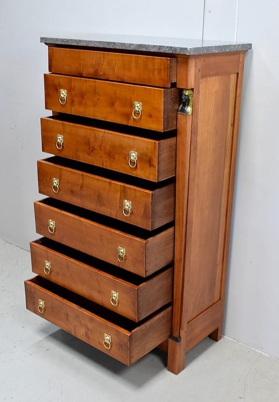 Petit Semainier Retour d’Égypte, en Merisier majoritairement, ouvrant par définition par sept tiroirs alignés verticalement. Leurs façades sont en Poirier et l’assemblage en Queues d’Arondes. Le premier, moins profond, que l’on pourrait par conséquent attribué au Dimanche, surplombe les six autres. Ces derniers sont pourvus pour chacun d’eux d’une paire de poignées de tirage actuelles, rondes, tenues dans la gueule de Lions.