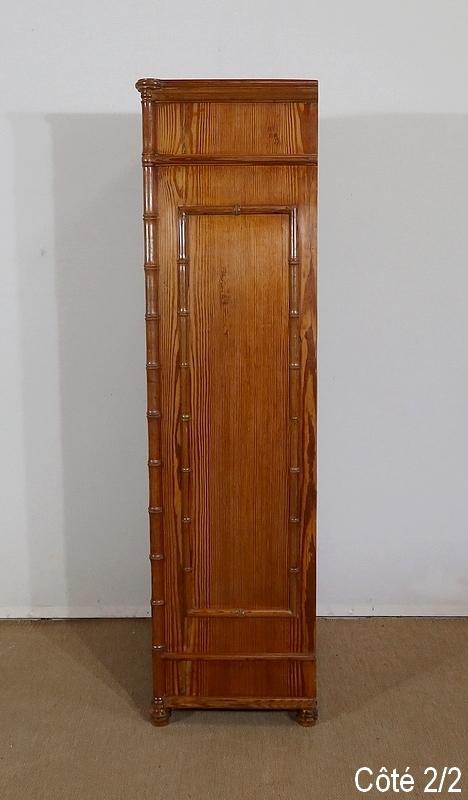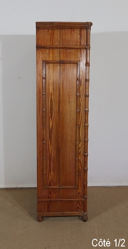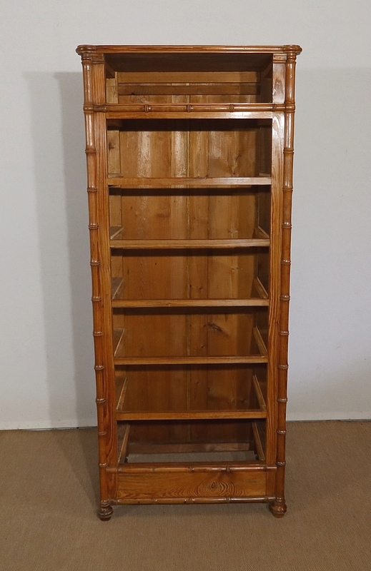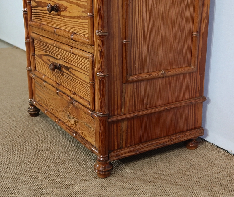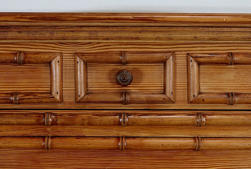 Aux angles, les montants du meuble sont constitués de pitchpin sculpté représentant une grande tige de bambou très réaliste. Chacun se termine par un petit pied tourné en façade.