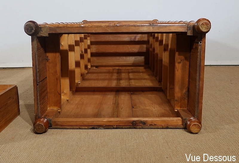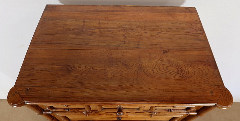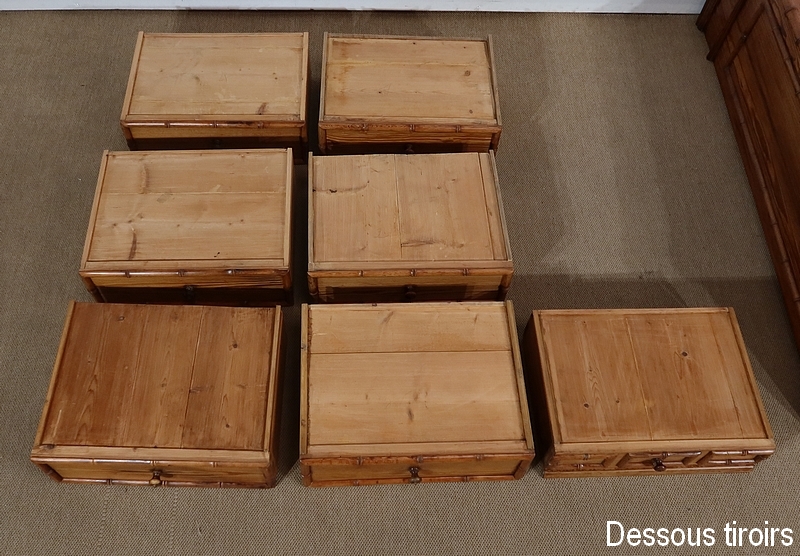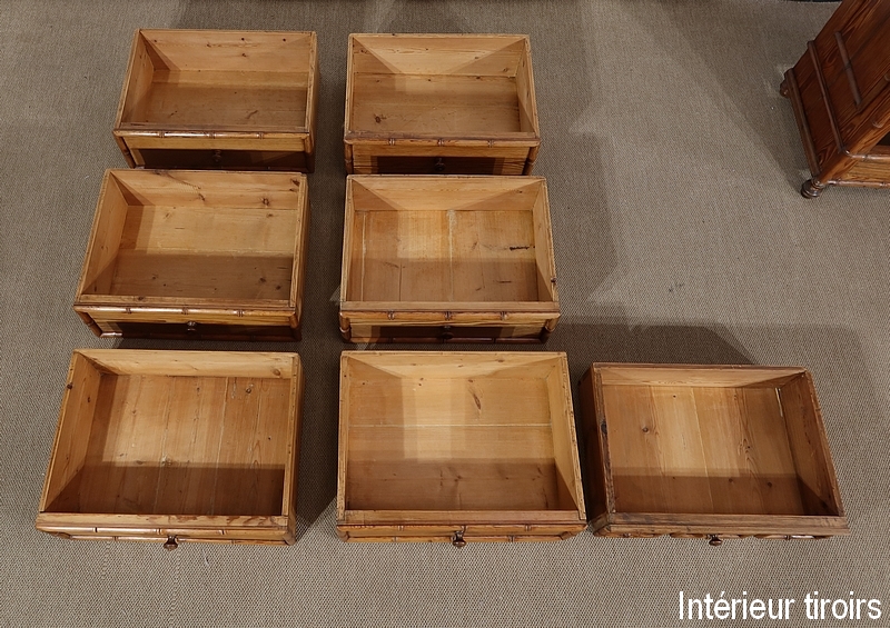 Ce meuble de rangement est doté de 7 tiroirs dont 6 de même hauteur et un plus petit en partie haute. Ceux-ci sont entourés de demi-ronds sculptés à coupe d’onglet dans les angles. Au centre, un bouton en pitchpin permet le tirage de chaque tiroir, monté à queue d’aronde, dont les fonds et les côtés sont réalisés dans la même essence de bois que le reste du meuble.