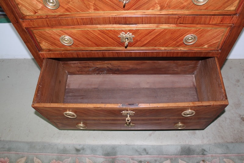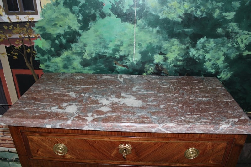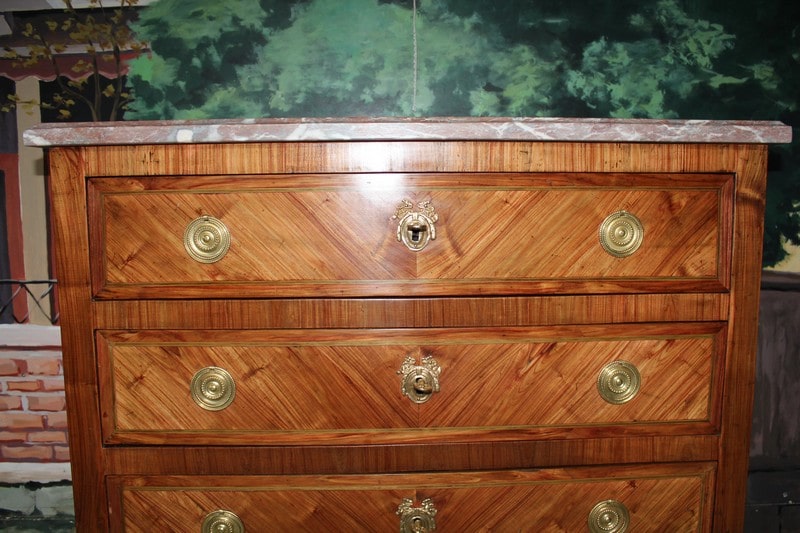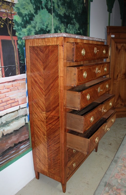 Très beau semainier Louis XVI en placage de bois de rose ouvrant par 5 tiroirs + 1 tiroir double en partie basse, garnis d’entrées de serrure et de poignées Louis XVI en bronze. Il repose sur 4 pieds gainés, Son dessus est en marbre. Époque : XVIIIe siècle.