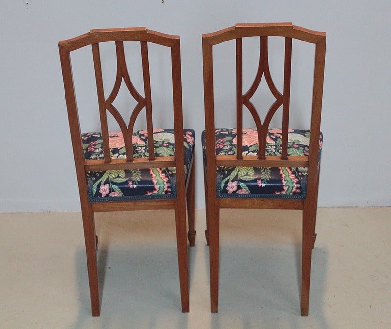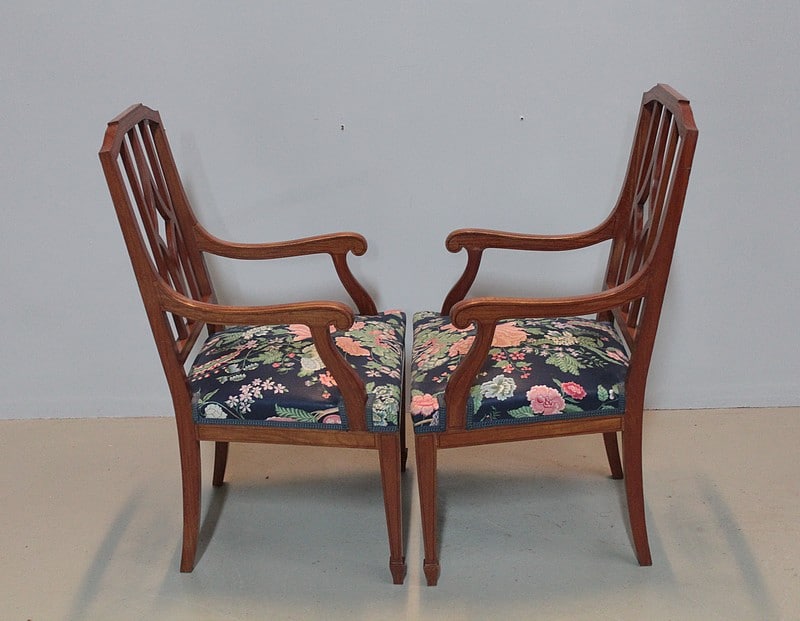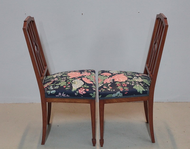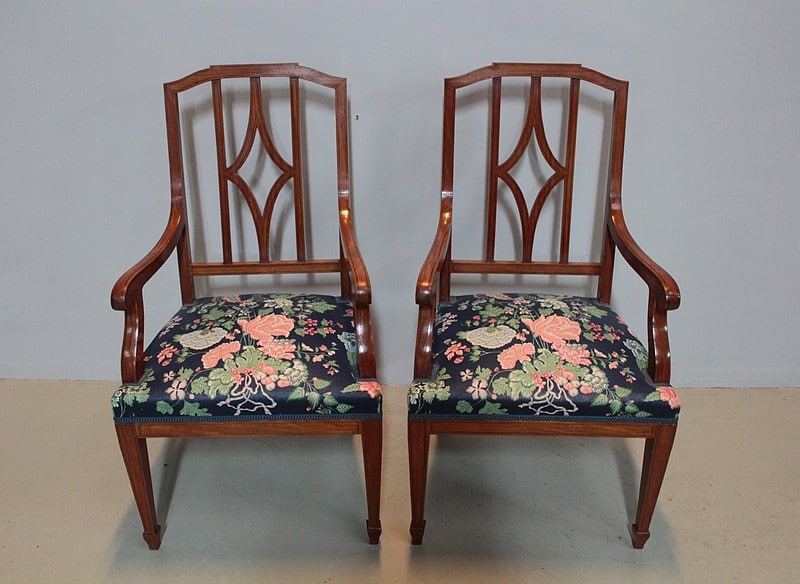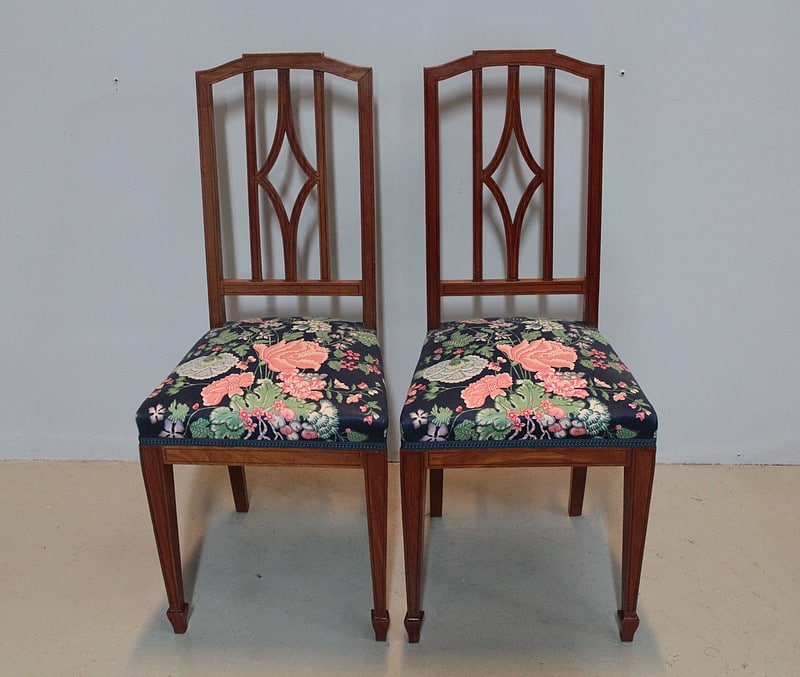 Suite de 4 sièges – 2 fauteuils et 2 chaises – en acajou clair avec incrustation de filets d’acajou plus foncé.