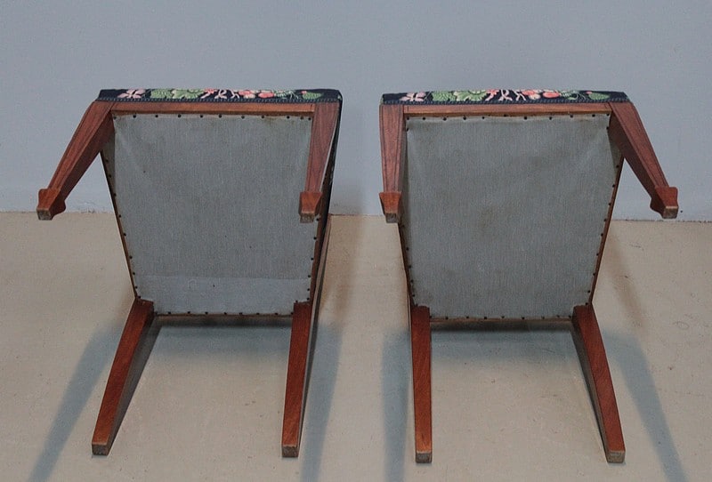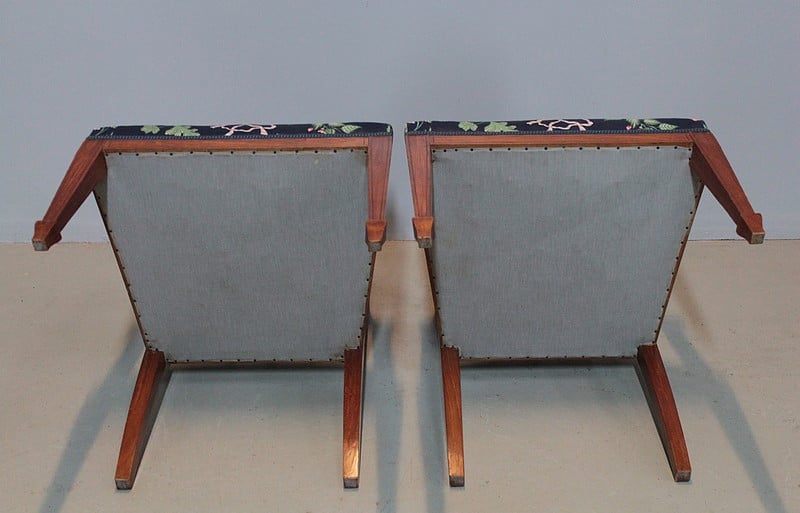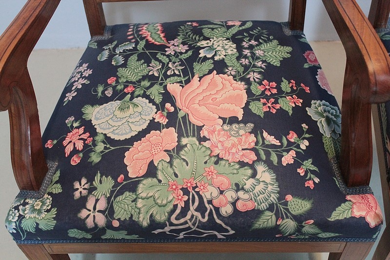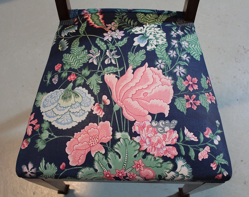 Les assises sont recouvertes d’un tissu à décor floral japonisant sur fond bleu marine.