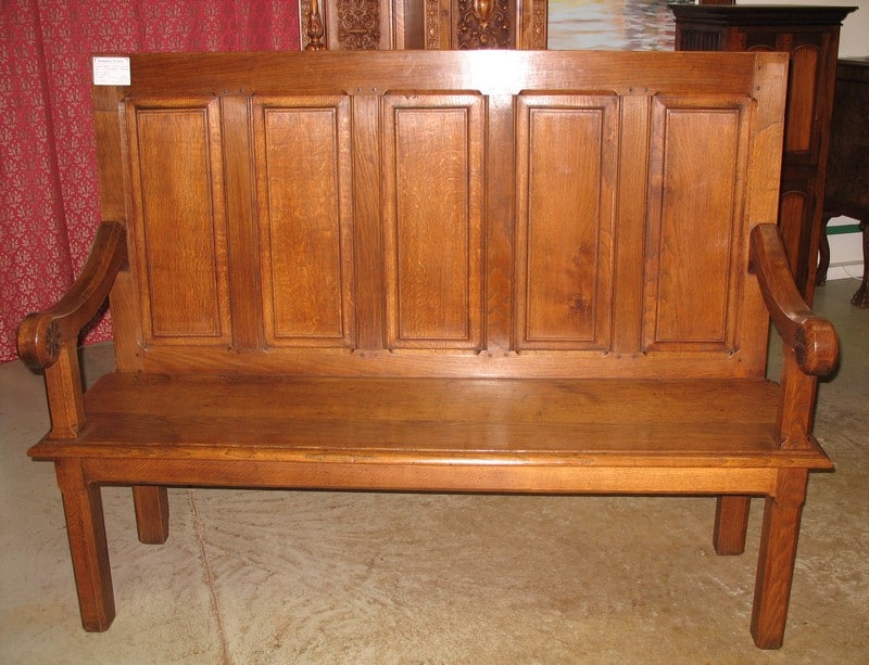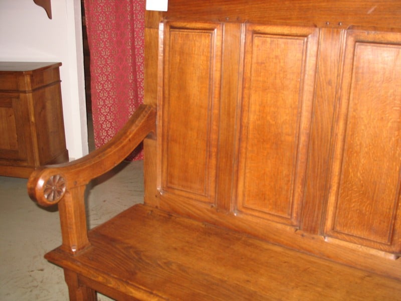 Banc à haut dossier à 5 panneaux et 2 accoudoirs, en chêne.