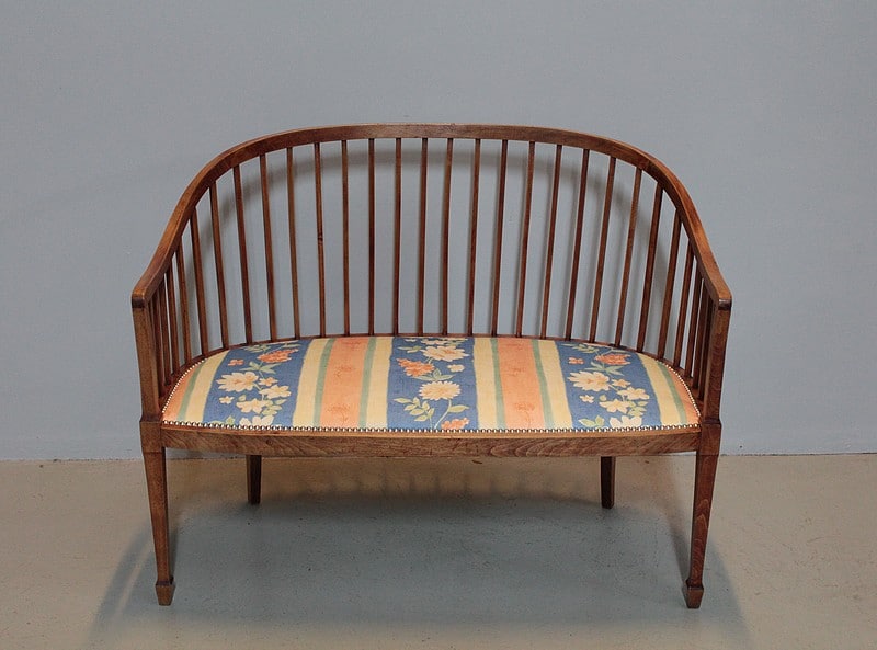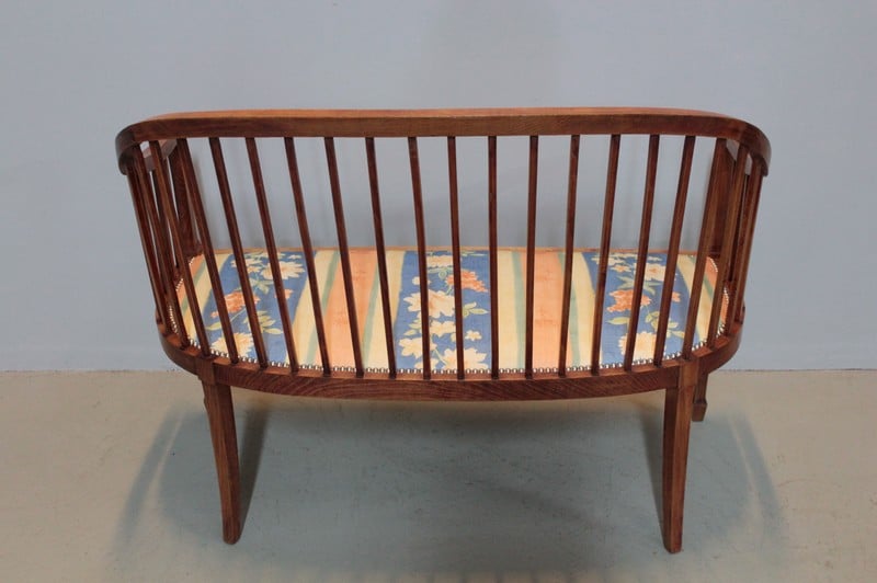 Petite banquette Art Déco en hêtre teinté. L’assise a été refaite après équerrage du fût et recouverte d’un tissu fleuri.