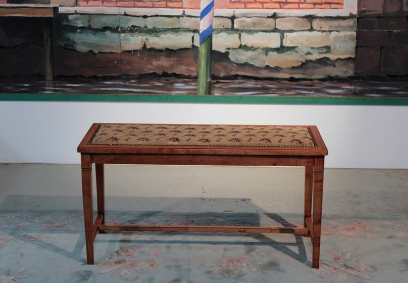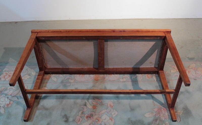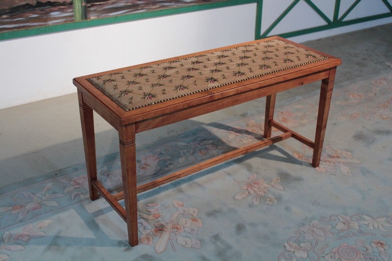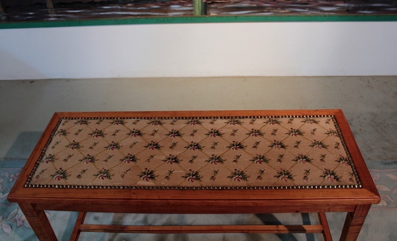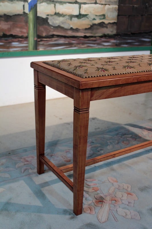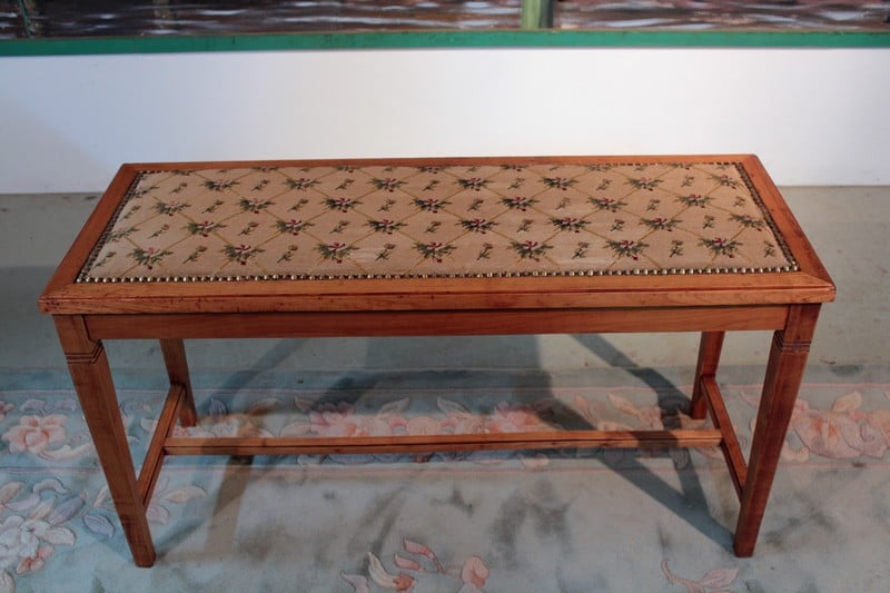 Petite banquette en merisier dans le goût Directoire reposant sur 4 pieds gainés reliés par une entretoise. Elle est recouverte d’une tapisserie à motifs de fleurs et de feuilles. Époque 1930.