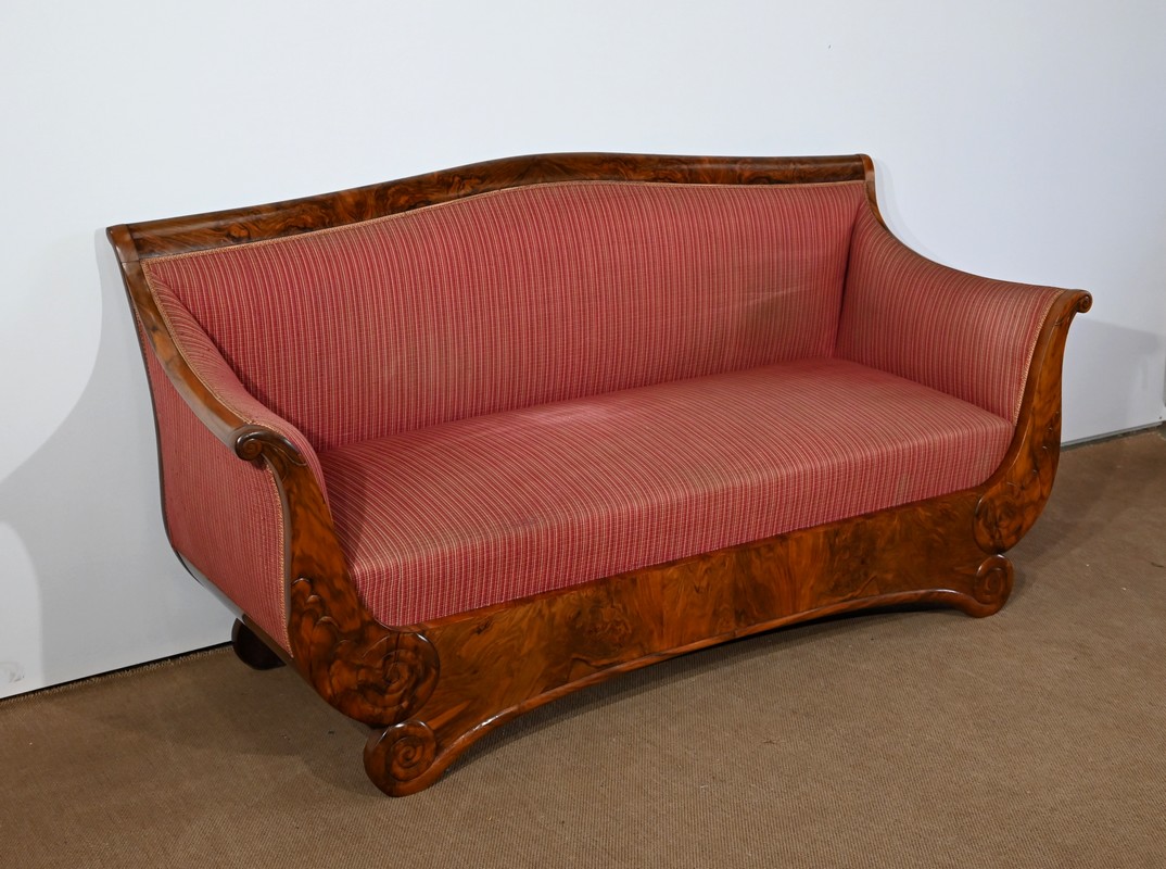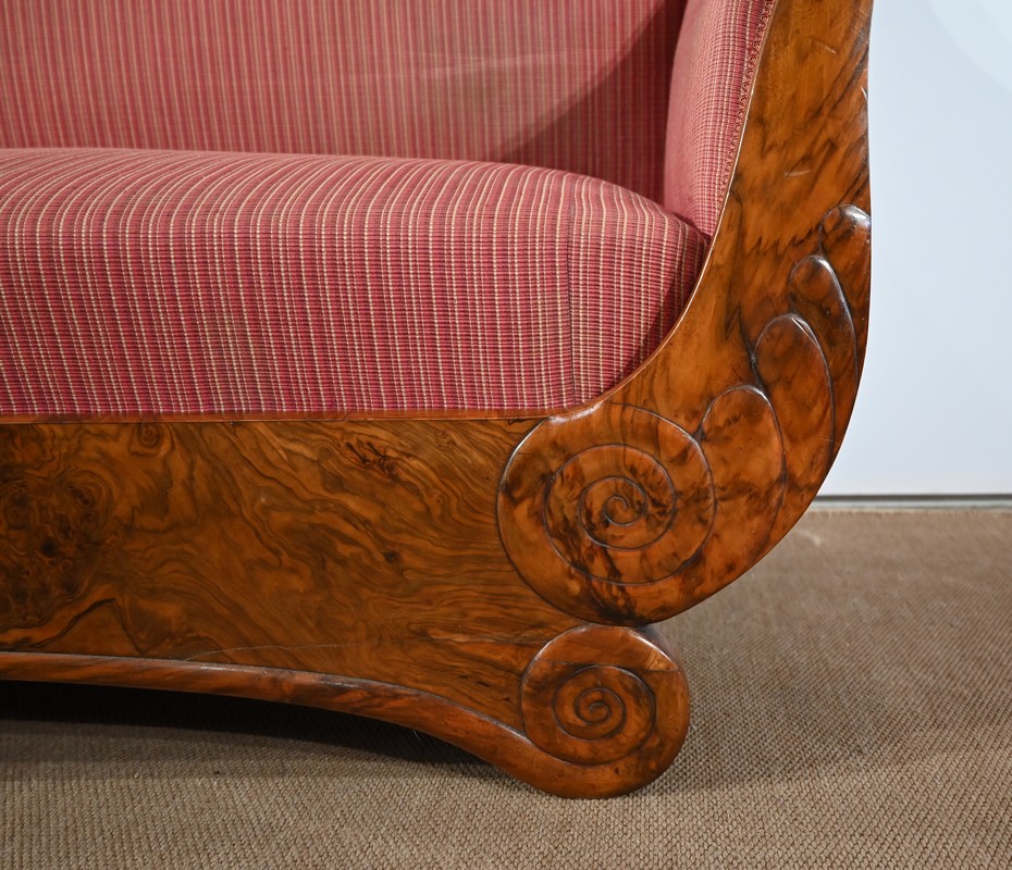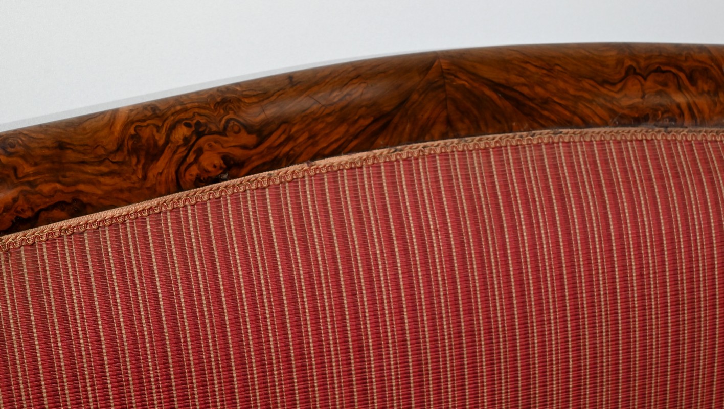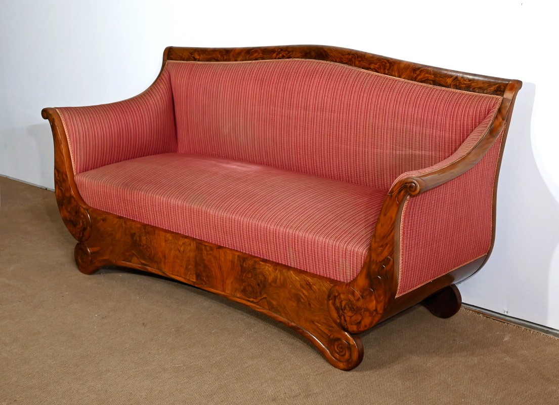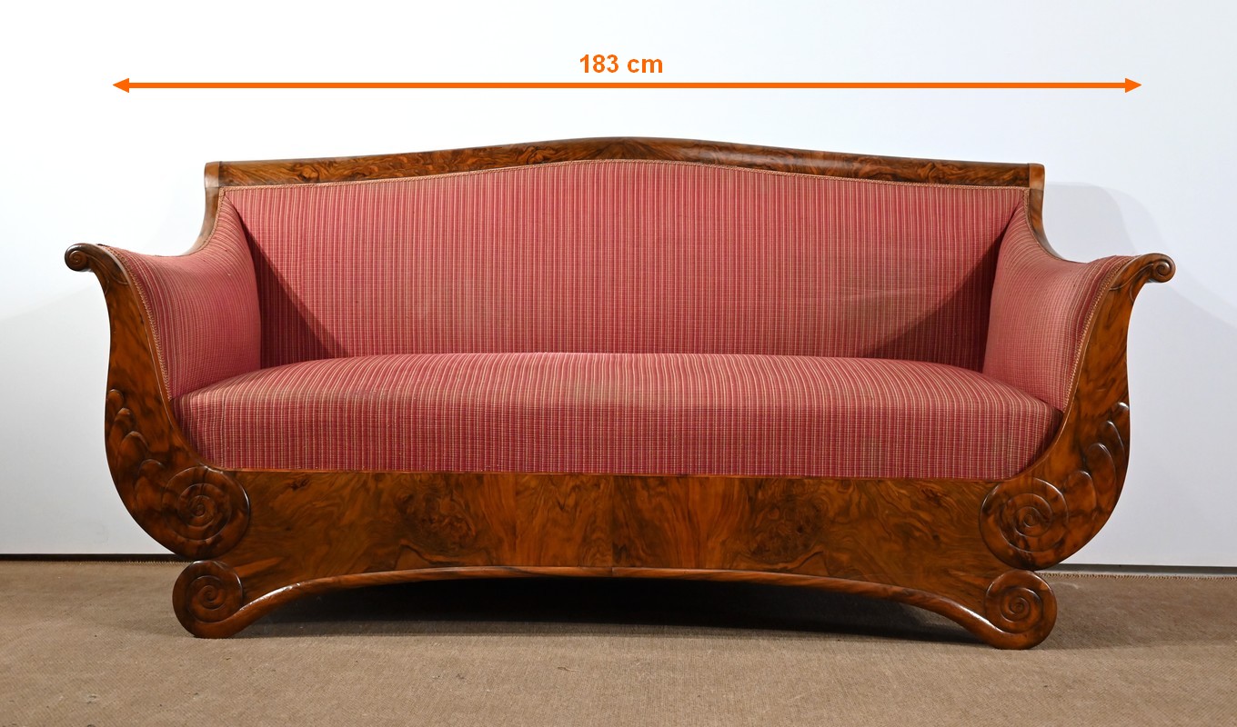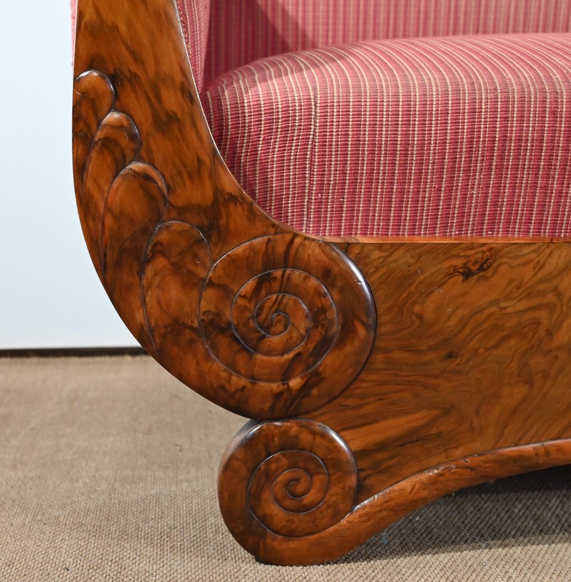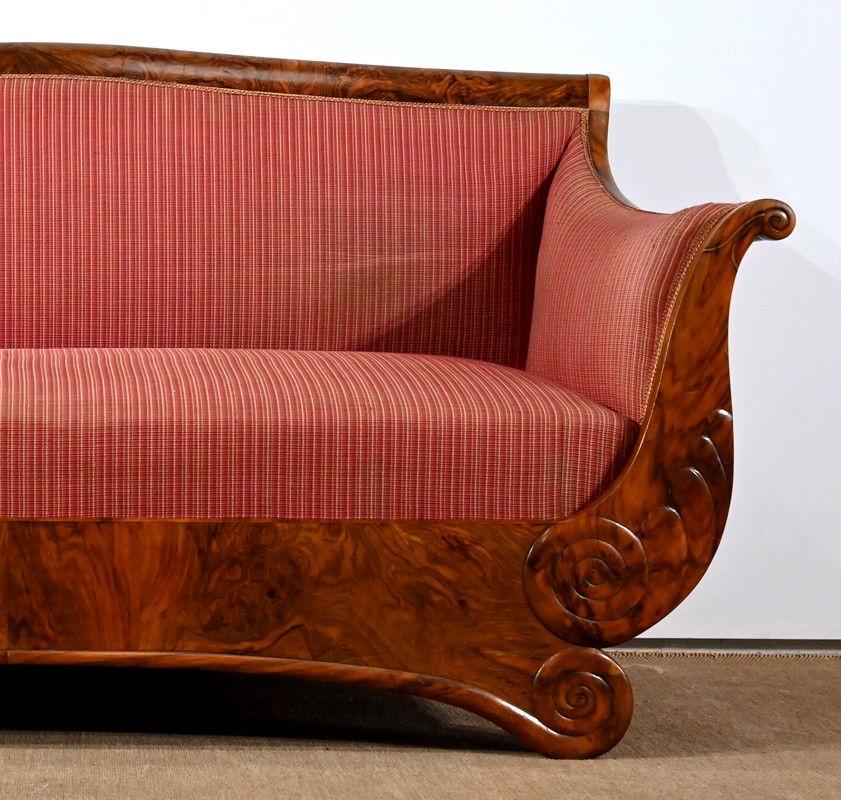 Canapé trois places en ronce de noyer, à structure en forme bateau, dans le goût Restauration.