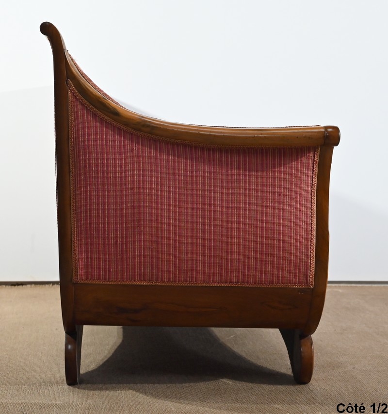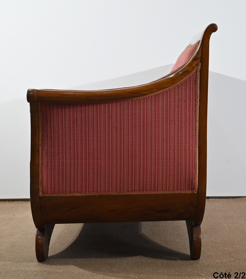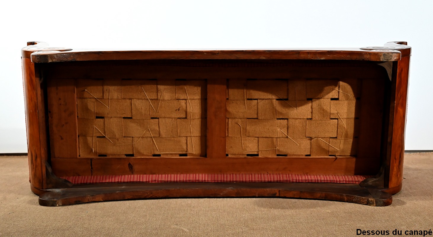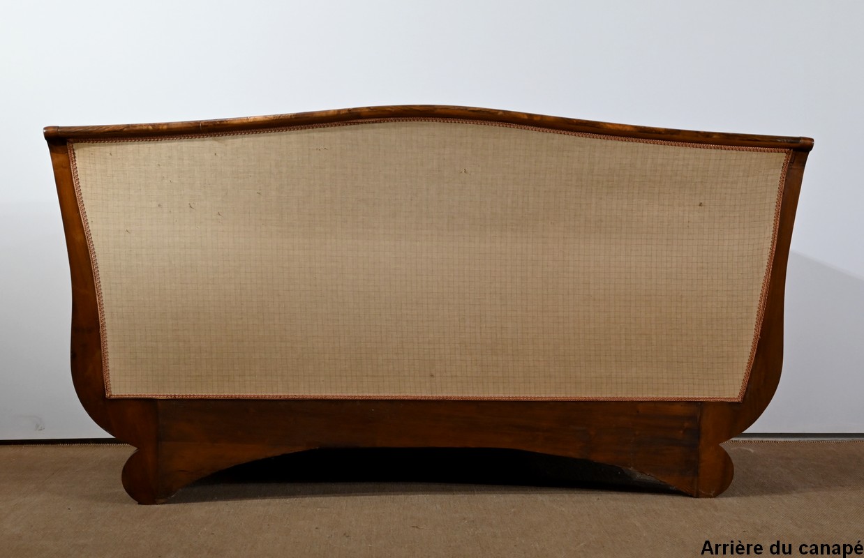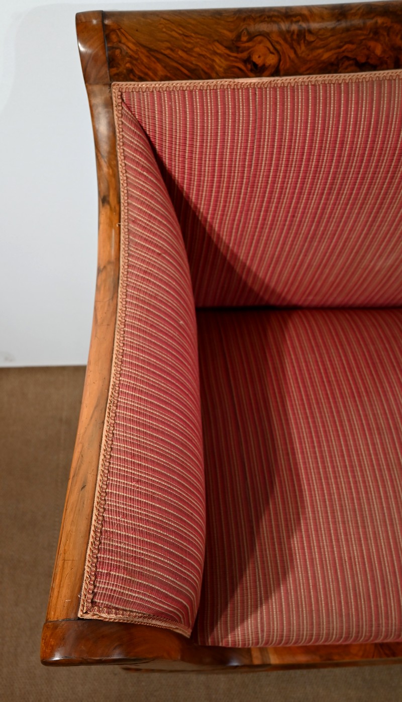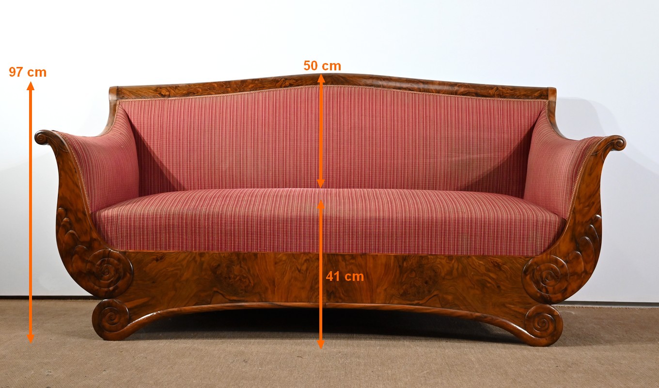 Canapé trois places en ronce de noyer, à structure en forme bateau, dans le goût Restauration.