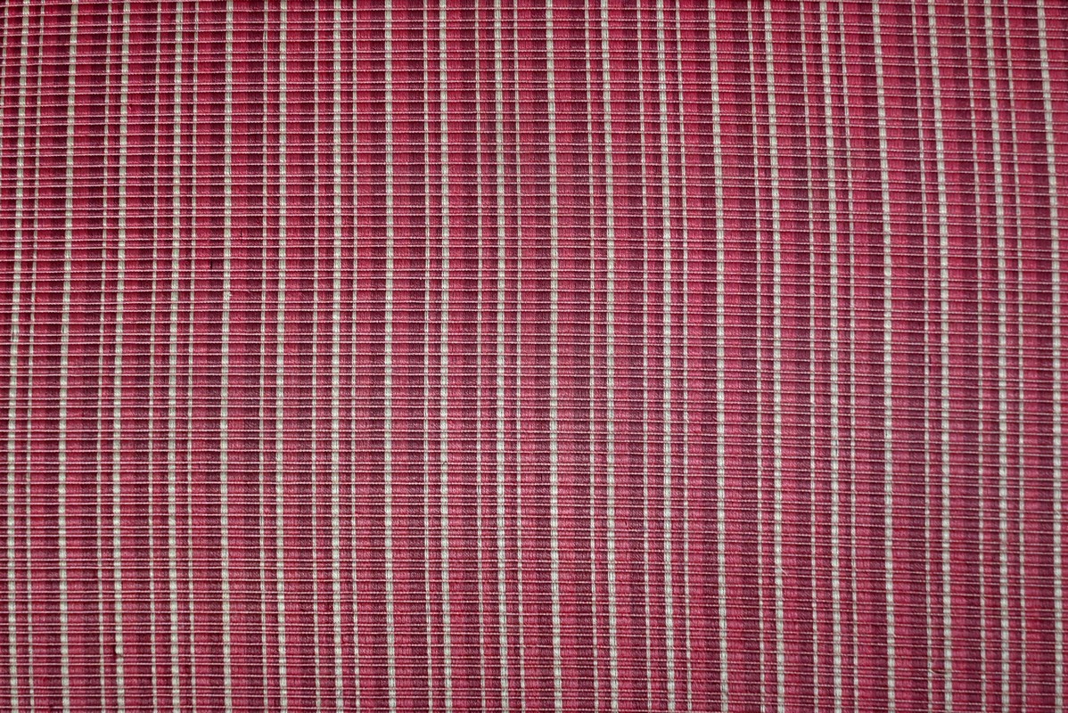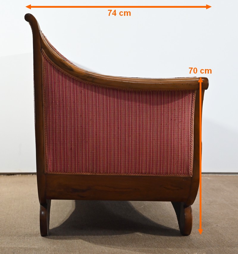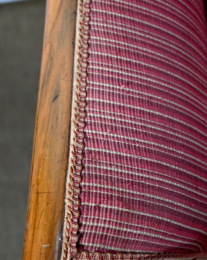 L’assise à sangles, ressorts et crin animal, le dossier et les côtés intérieurs et extérieurs, sont habillés d’un tissu à rayures lie de vin et à liserés dorés, souligné de galons.