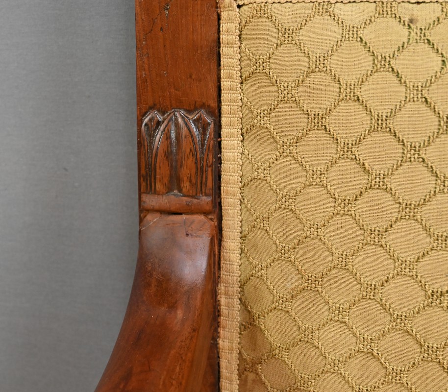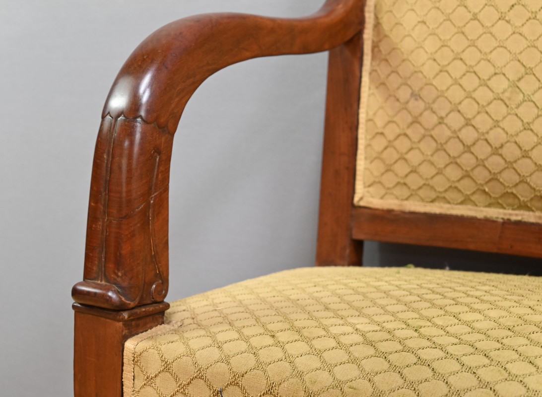 Ce Canapé de Palier en acajou, datant de la première partie du XIXᵉ siècle, s’inscrit pleinement dans l’esthétique de la Restauration, au cœur du courant romantique.