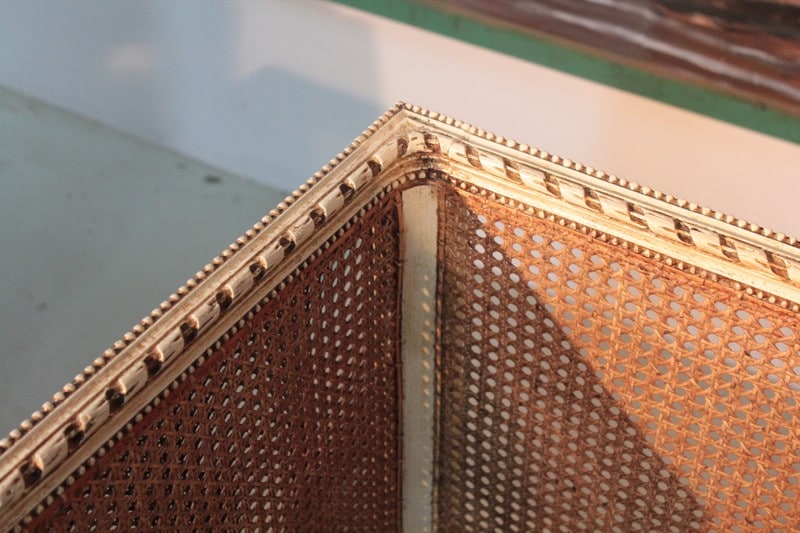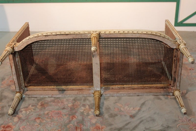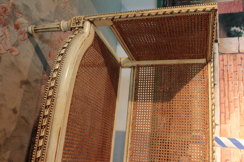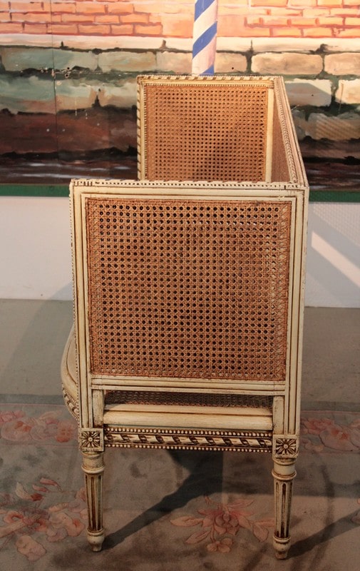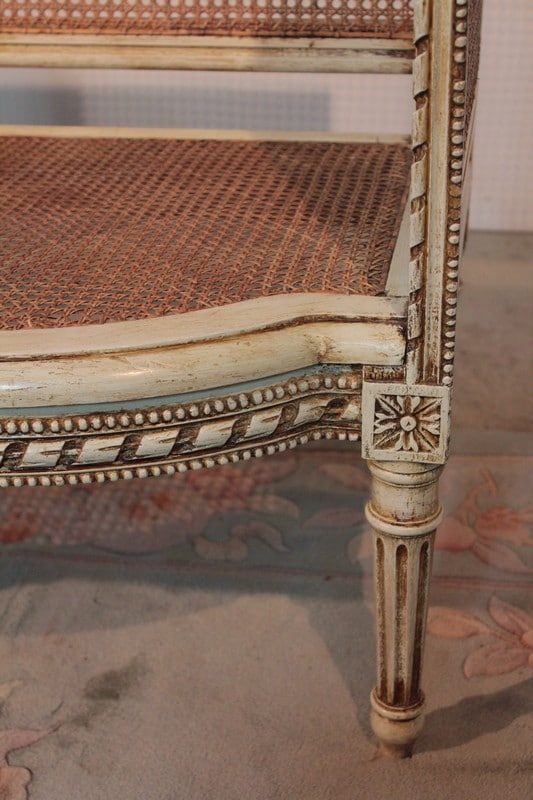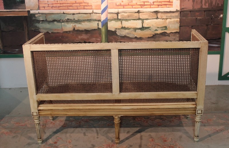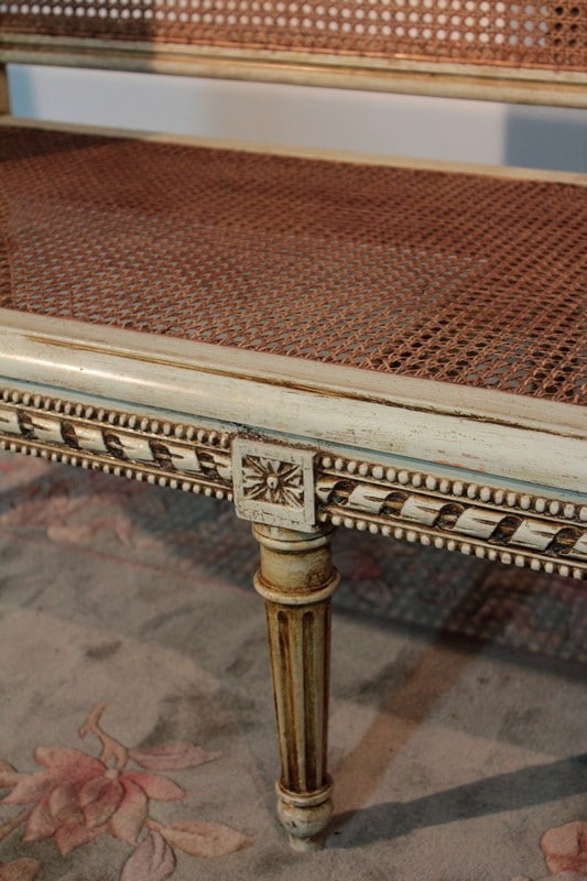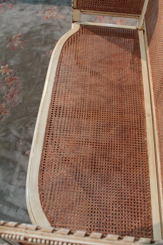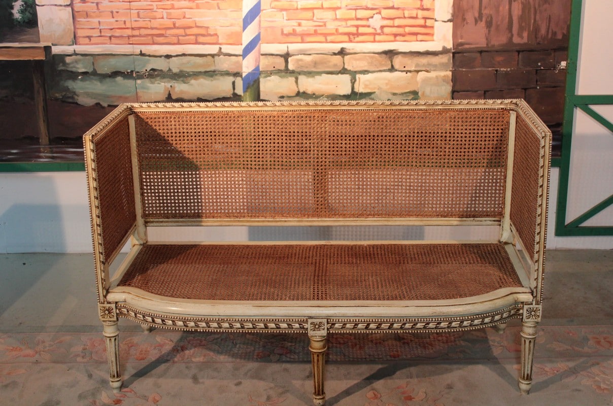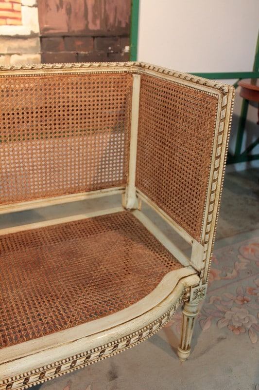 Petit canapé de style Louis XVI en bois patiné ton ivoire à décor de perles et de rubans. L’assise et le dossier sont en cannage simple tandis que les côtés sont en cannage double. Il repose sur 6 pieds à cannelures.