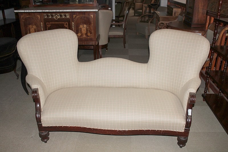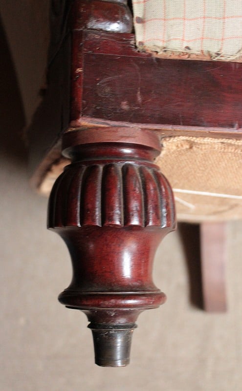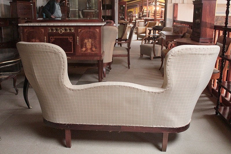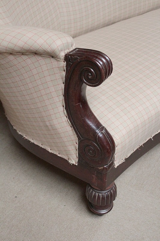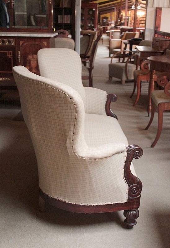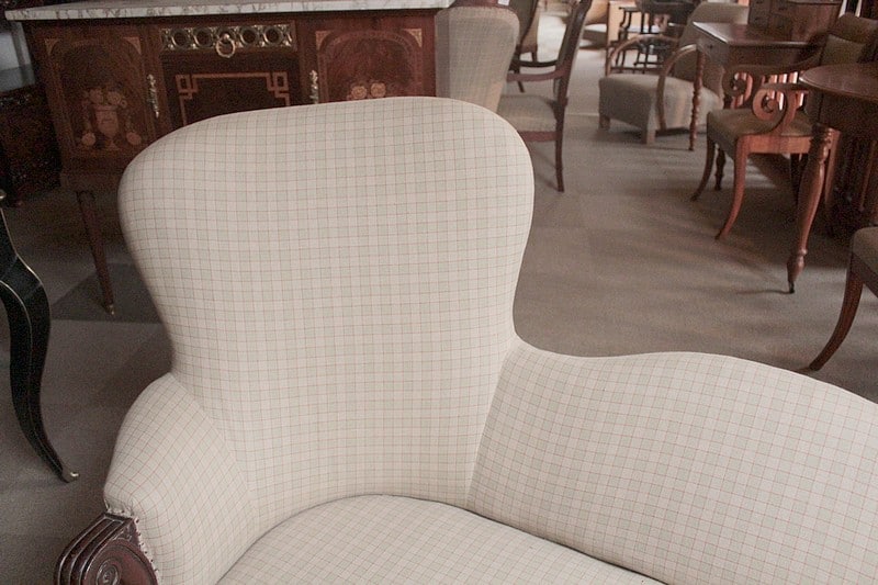 Original canapé Restauration en acajou à 2 dossiers. Sa tapisserie a été entièrement refaite à l’ancienne, avec crins et ressorts, après équerrage du fût. Reste le tissu final à poser. Époque : première moitié du XIXe