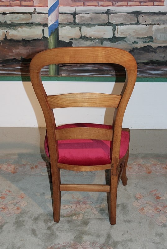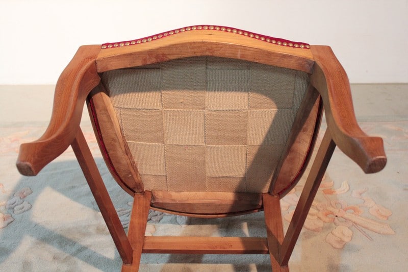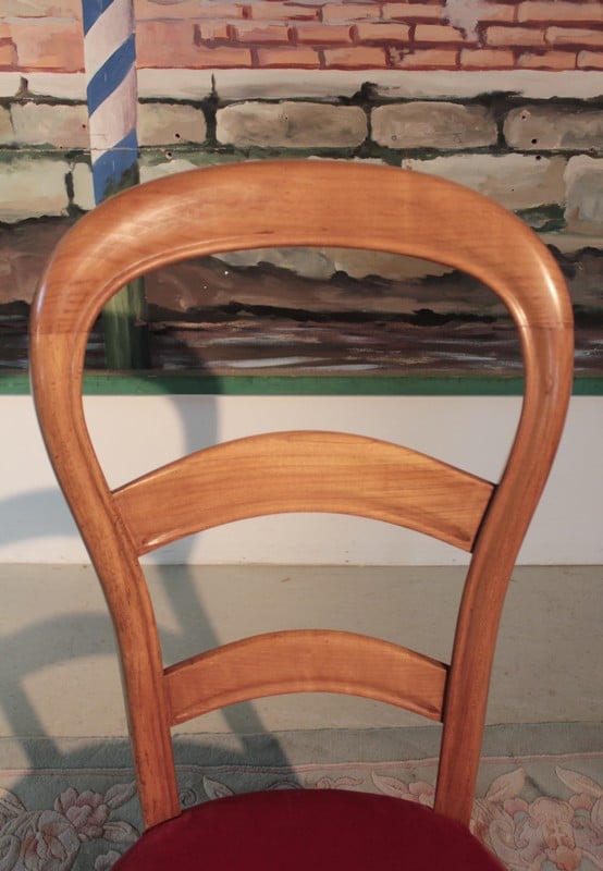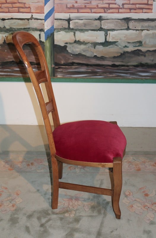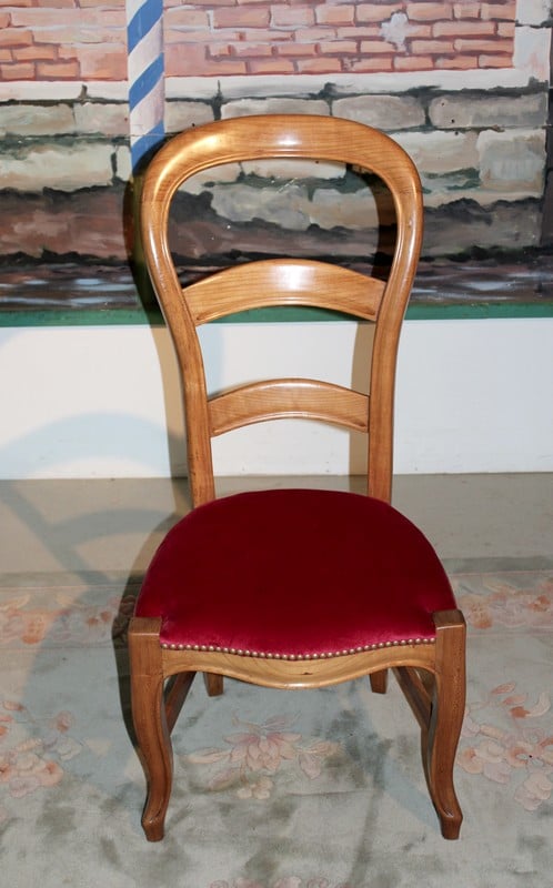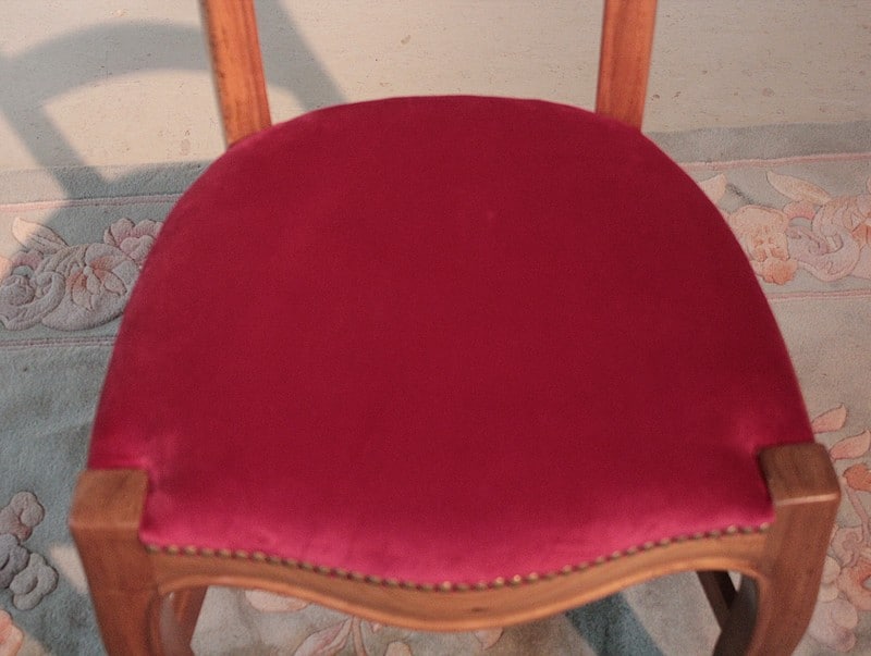 Chaise de nourrice en merisier, dossier ballon et pieds avants galbés. L’assise a été refaite, avec crins et ressorts, et recouverte d’un velours rouge ‘framboise’. Époque : fin XIXe