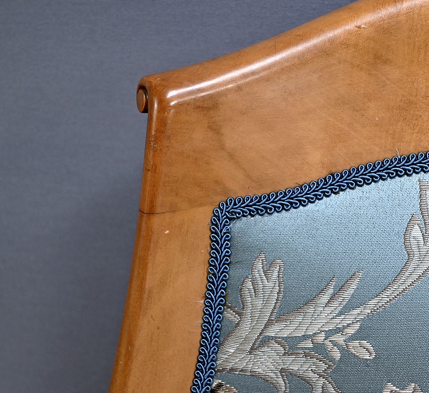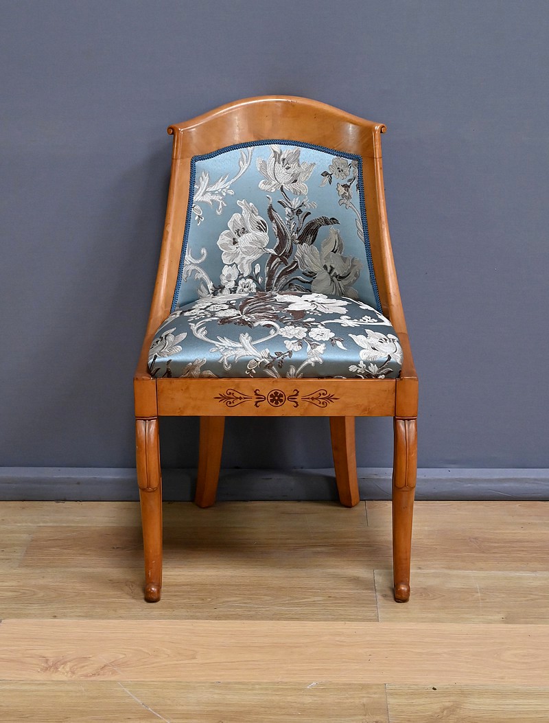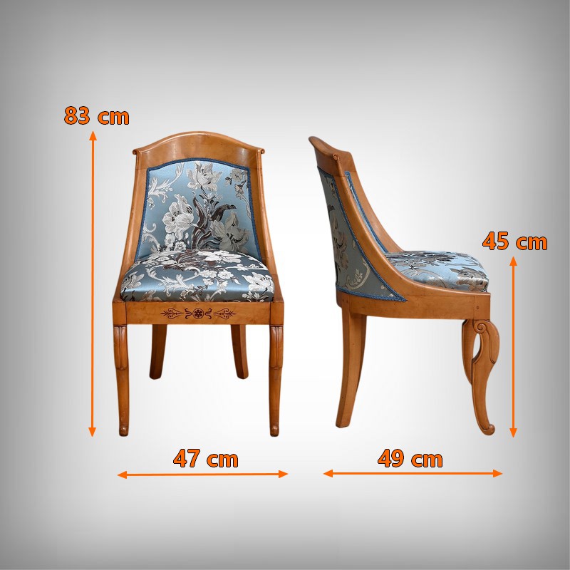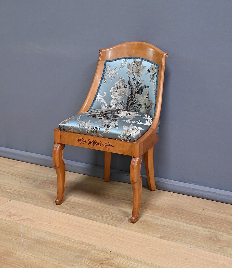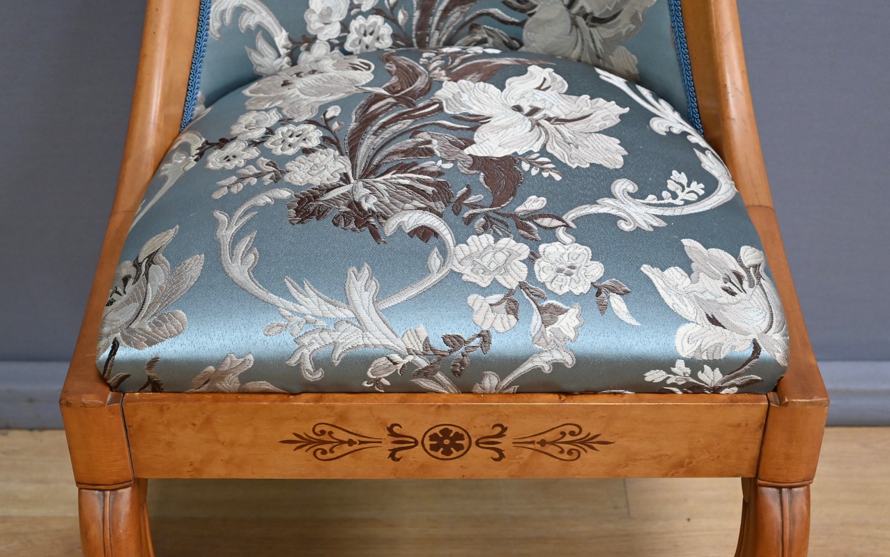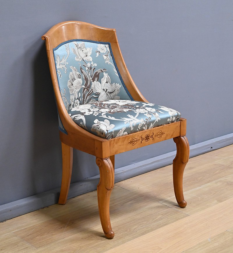 Charmante chaise de style Charles X alliant charme classique et qualité artisanale. La ceinture est plaquée d’un érable moucheté et rehaussée d’une marqueterie de rinceaux discrets qui apportent une touche de raffinement. Le dossier gondole enveloppant quant à lui se démarque par son enroulement arrière en partie supérieure. Le revêtement en soierie bleue irisée ornée de fleurs, est utilisé pour l’assise et le dossier. Il apporte contraste à l’ensemble, tout en assurant confort et allure. L’assise présente une galette amovible en excellent état. Le piétement en merisier massif se distingue par des pieds jarret élégants, tandis que les pieds arrière en sabre rappellent les lignes typiques de ce style.