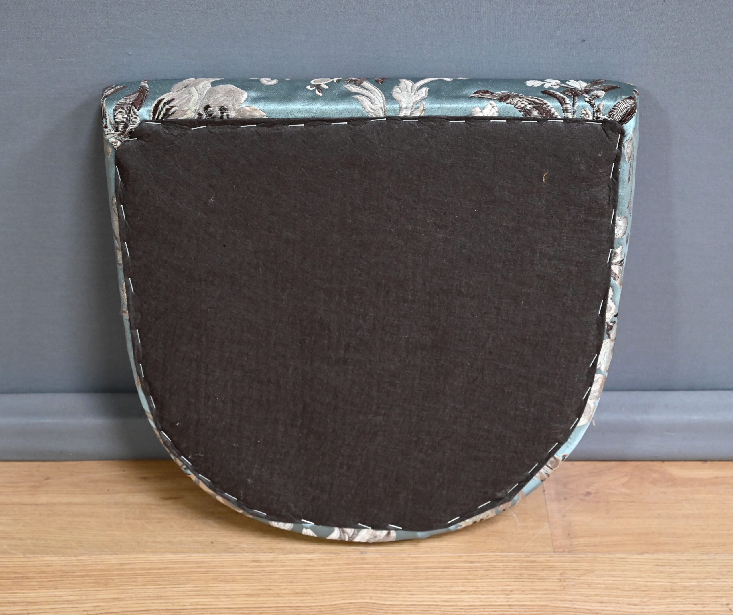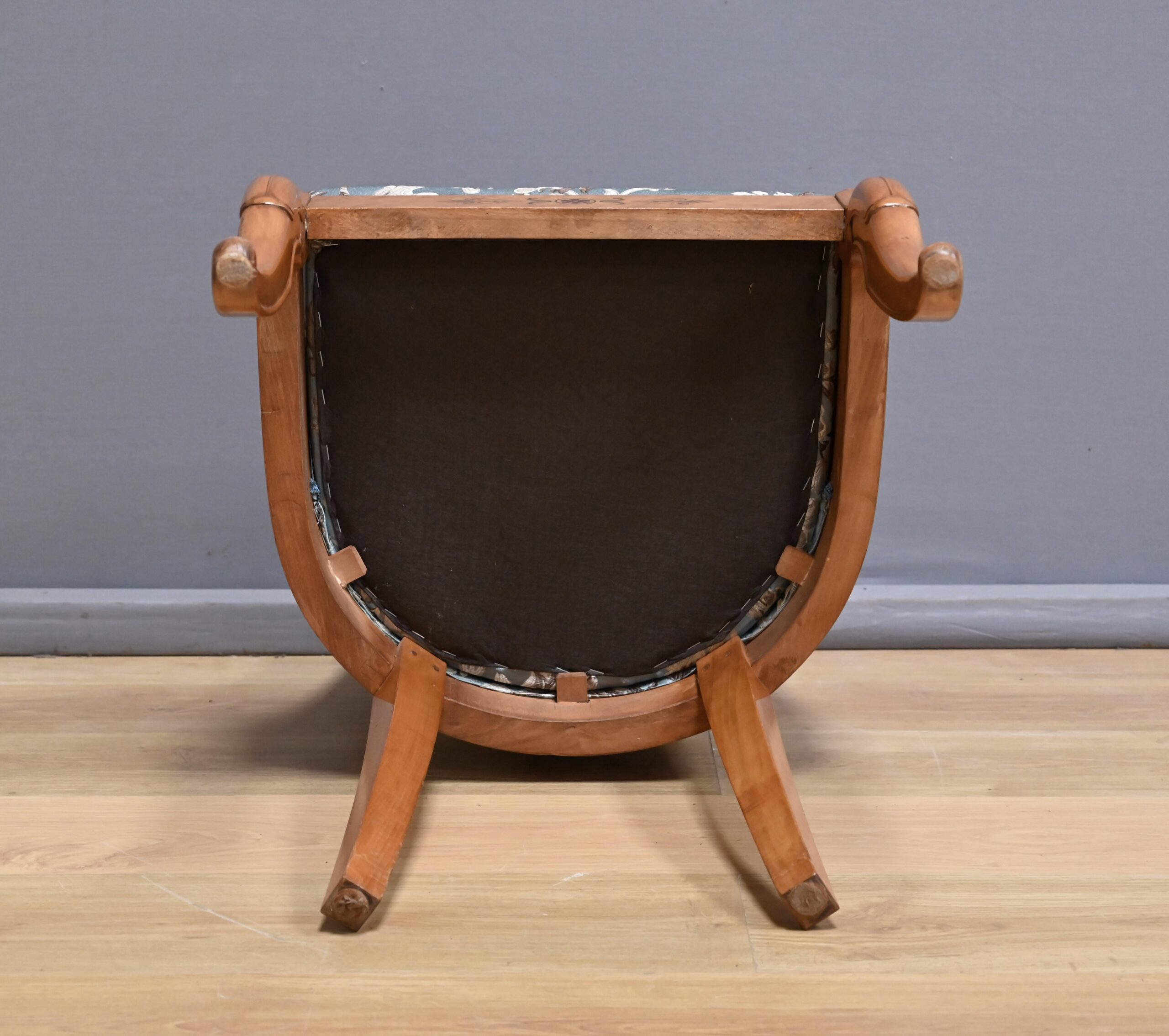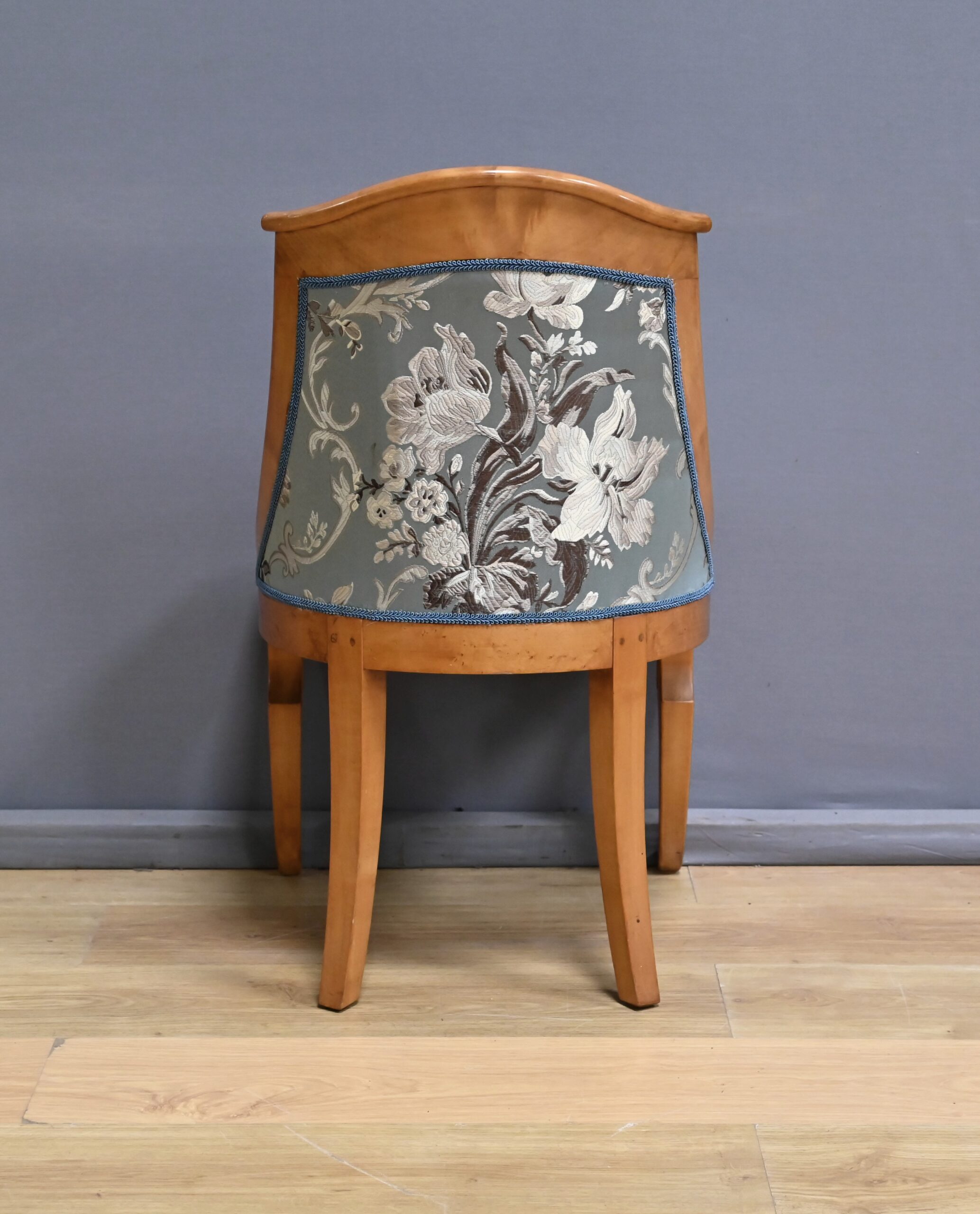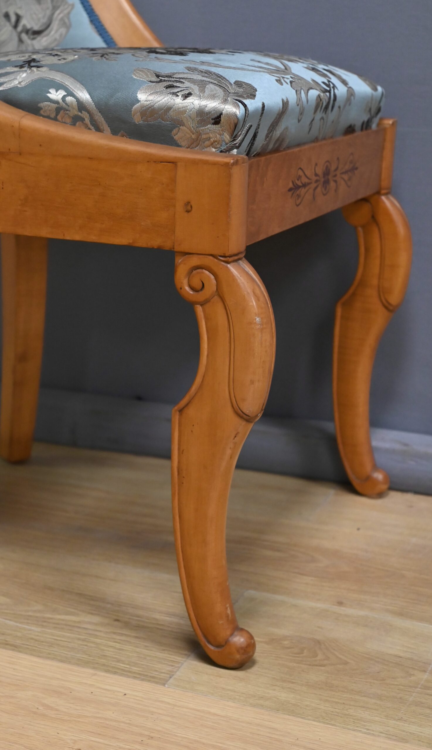Charmante chaise de style Charles X alliant charme classique et qualité artisanale. La ceinture est plaquée d’un érable moucheté et rehaussée d’une marqueterie de rinceaux discrets qui apportent une touche de raffinement. Le dossier gondole enveloppant quant à lui se démarque par son enroulement arrière en partie supérieure. Le revêtement en soierie bleue irisée ornée de fleurs, est utilisé pour l’assise et le dossier. Il apporte contraste à l’ensemble, tout en assurant confort et allure. L’assise présente une galette amovible en excellent état. Le piétement en merisier massif se distingue par des pieds jarret élégants, tandis que les pieds arrière en sabre rappellent les lignes typiques de ce style.