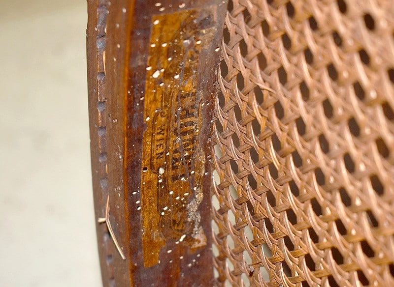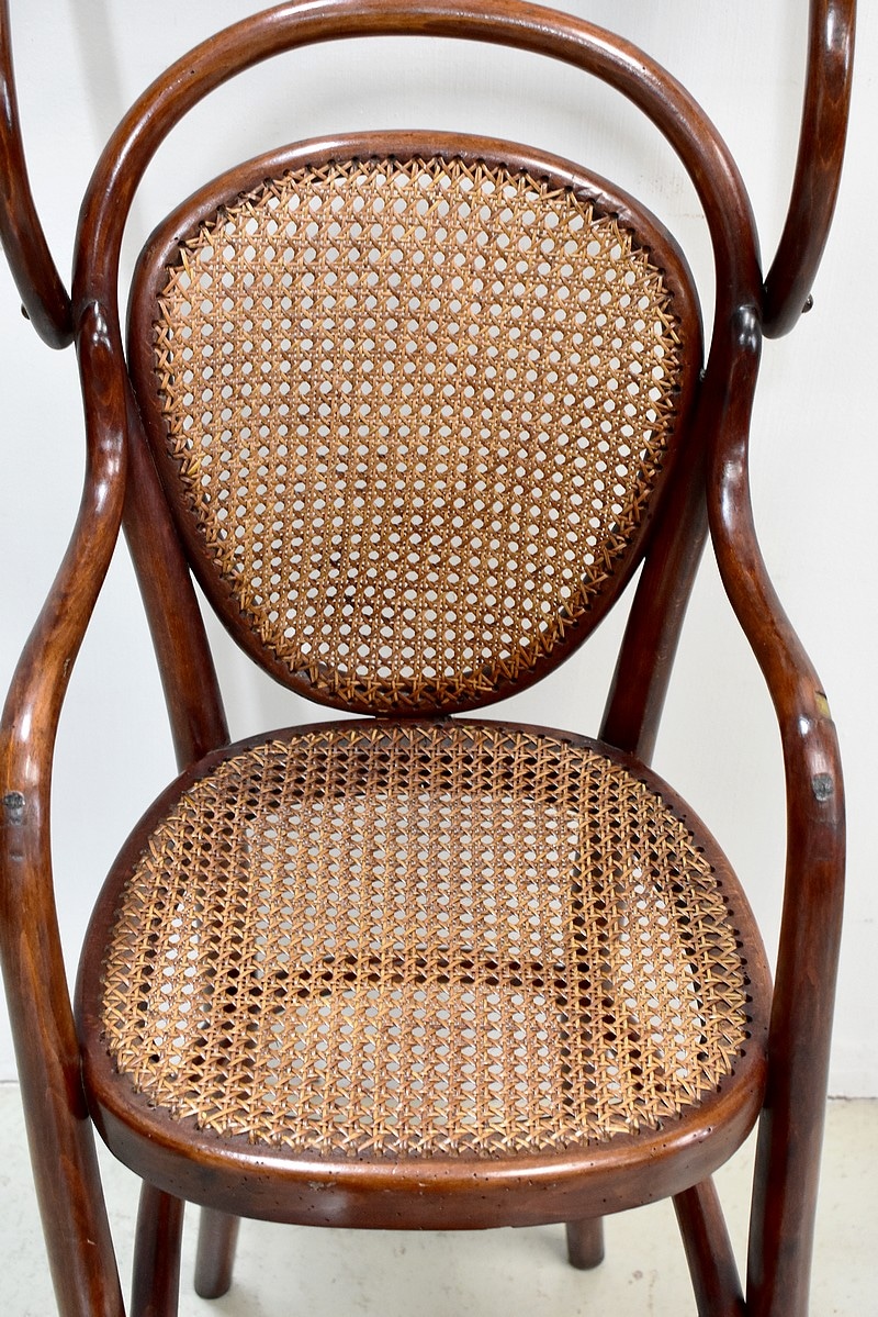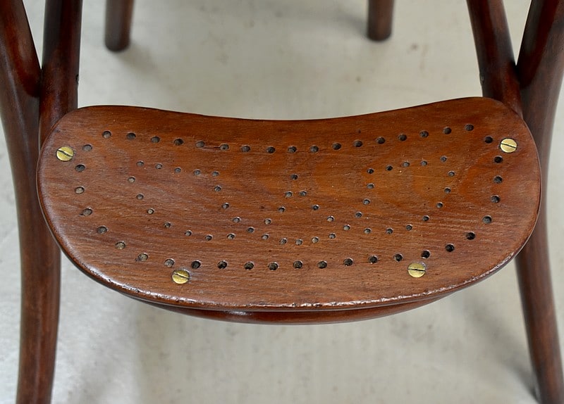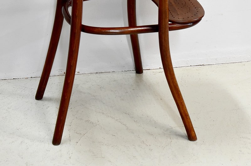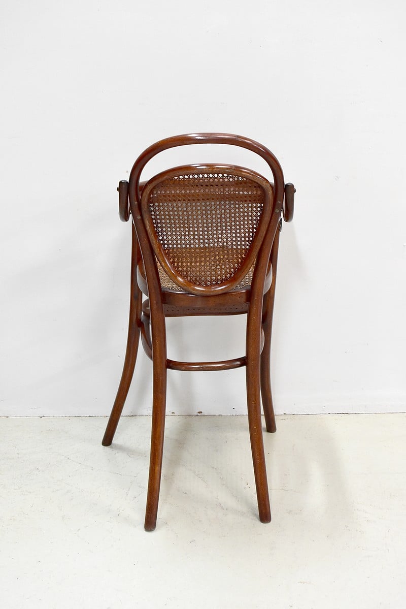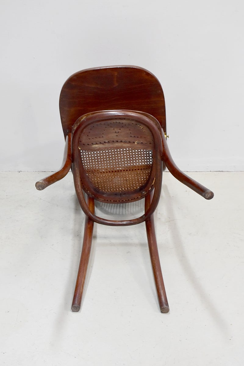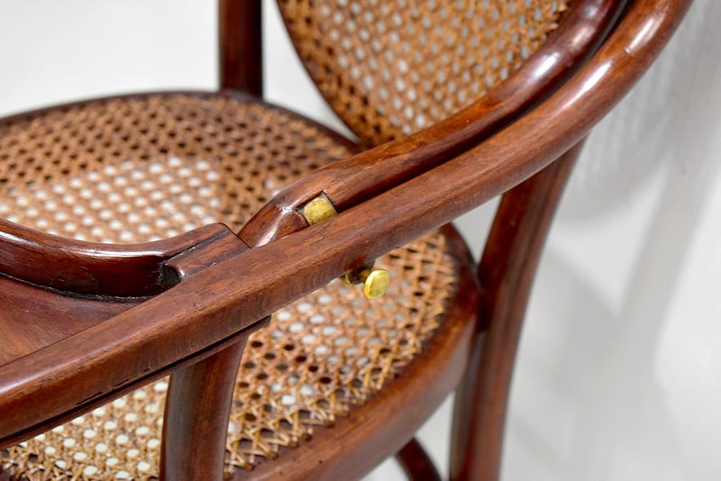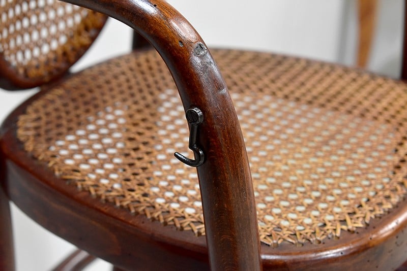 Le dossier et l’assise sont cannés. Sous l’assise, est visible l’ancienne étiquette Thonet ainsi qu’un cachet.