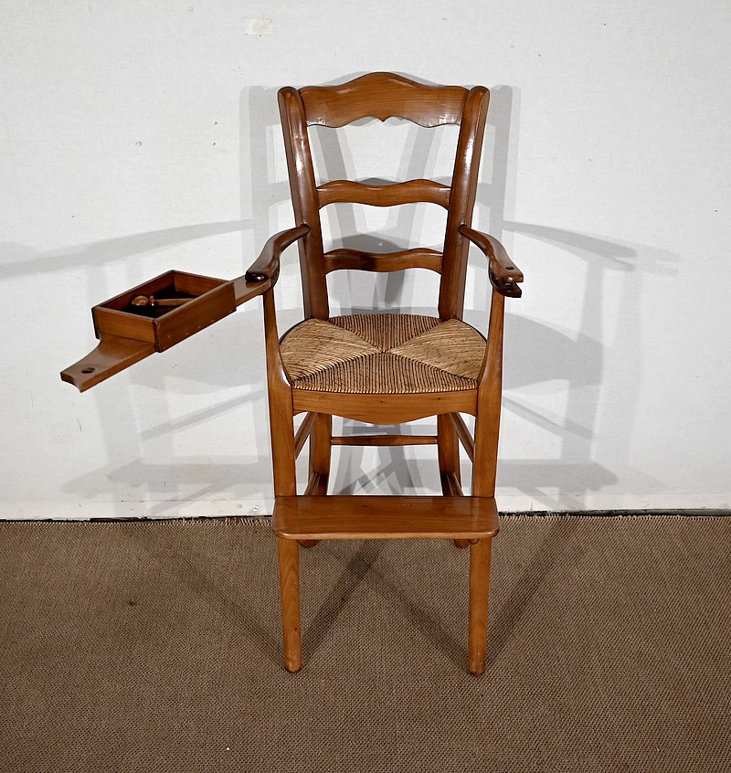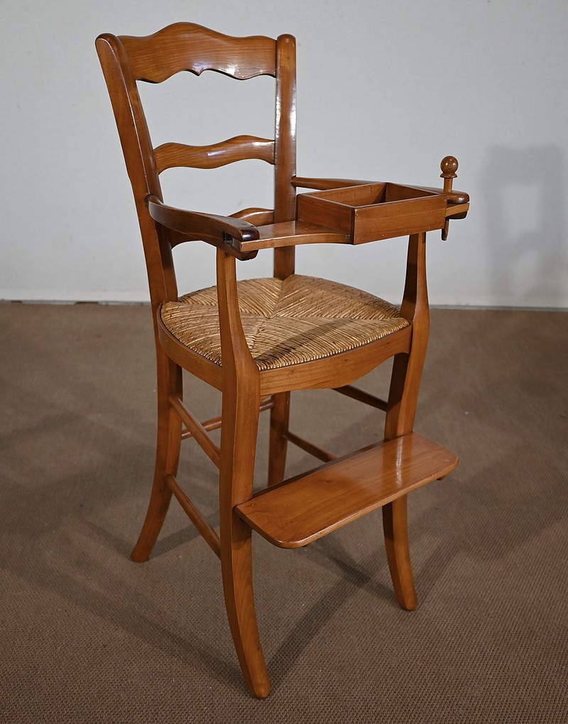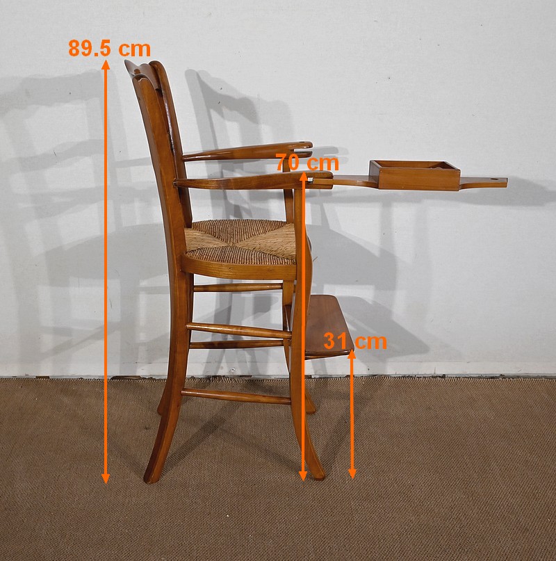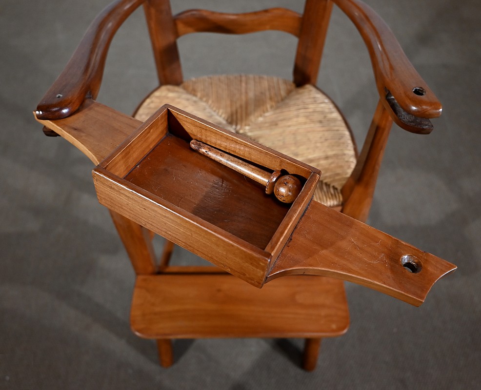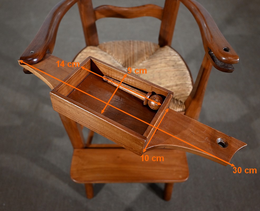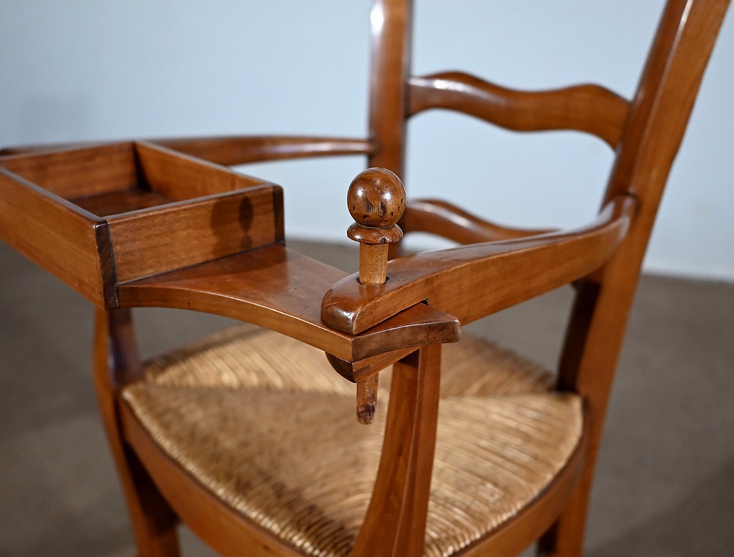 Chaise d’enfant en merisier massif dotée d’un dossier ajouré légèrement cintré complété de traverses mouvementées. De larges accotoirs sont reliés par une tablette amovible d’un côté, agrémentée d’un casier en bois.