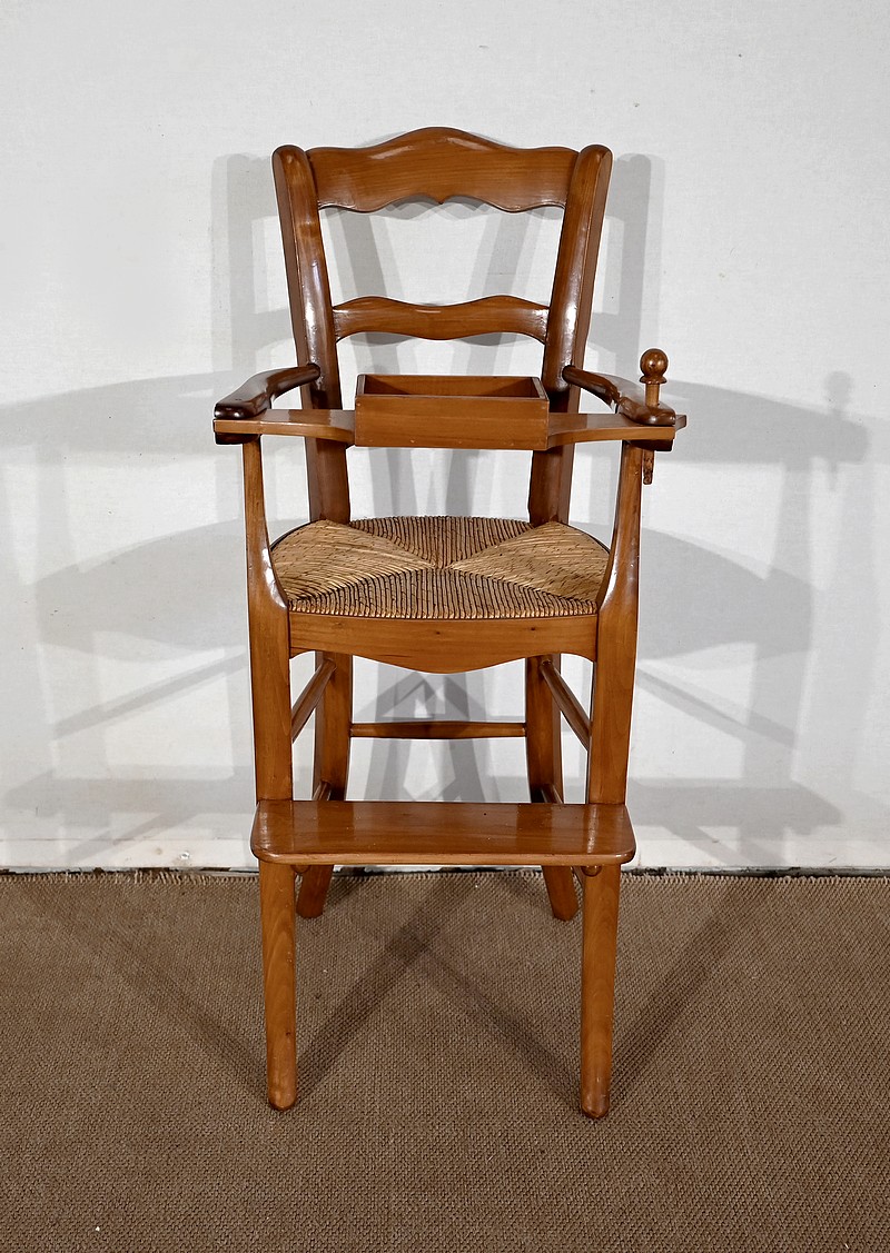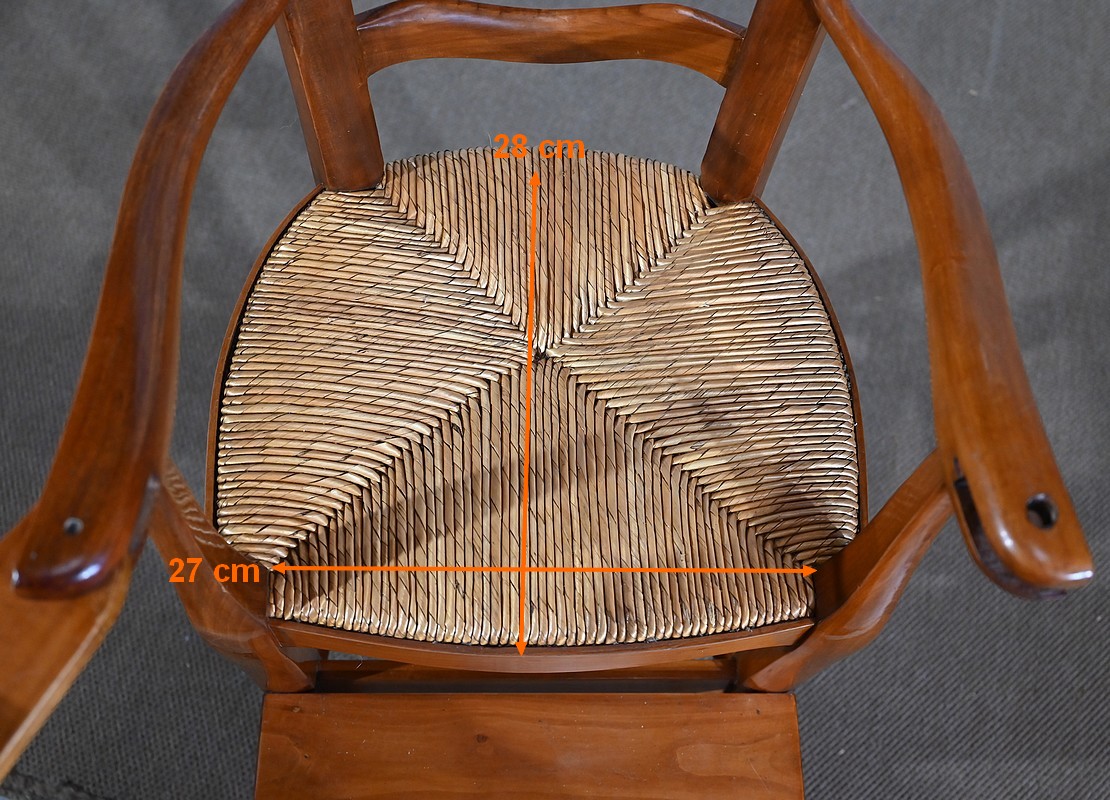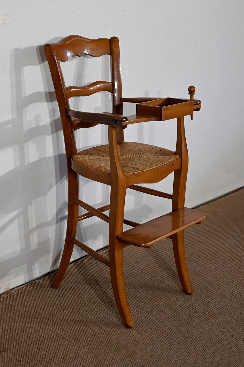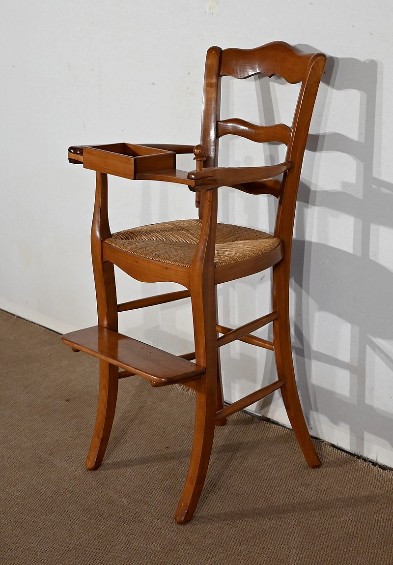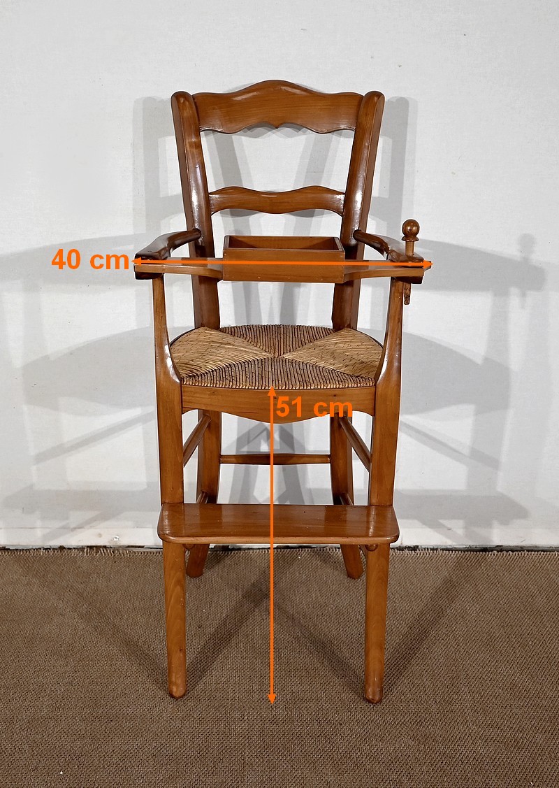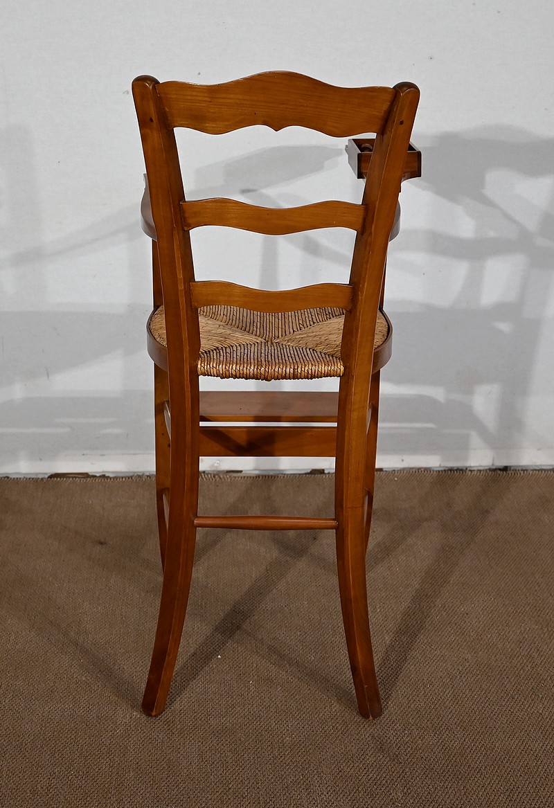 Chaise d’enfant en merisier massif dotée d’un dossier ajouré légèrement cintré complété de traverses mouvementées. De larges accotoirs sont reliés par une tablette amovible d’un côté, agrémentée d’un casier en bois.