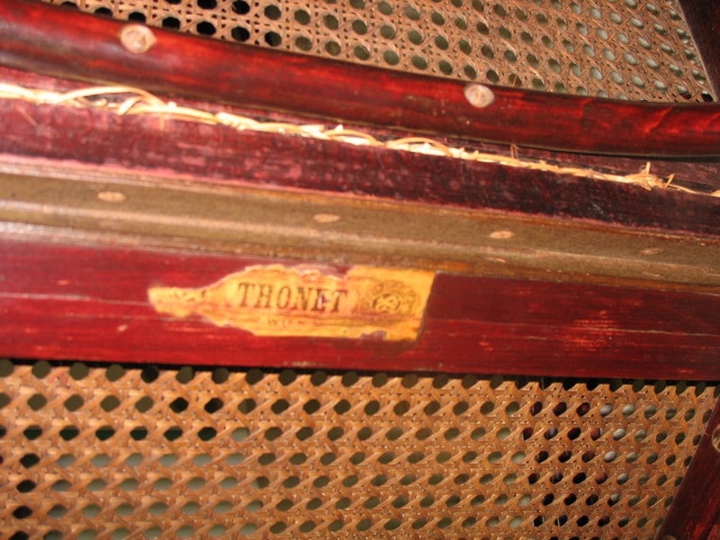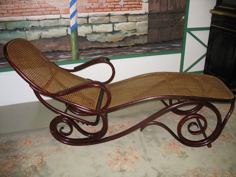 Chaise-longue en hêtre courbé, teinté acajou, et cannage. Le dossier est inclinable à 6 positions. Elle est signée ‘THONET – Wien’.