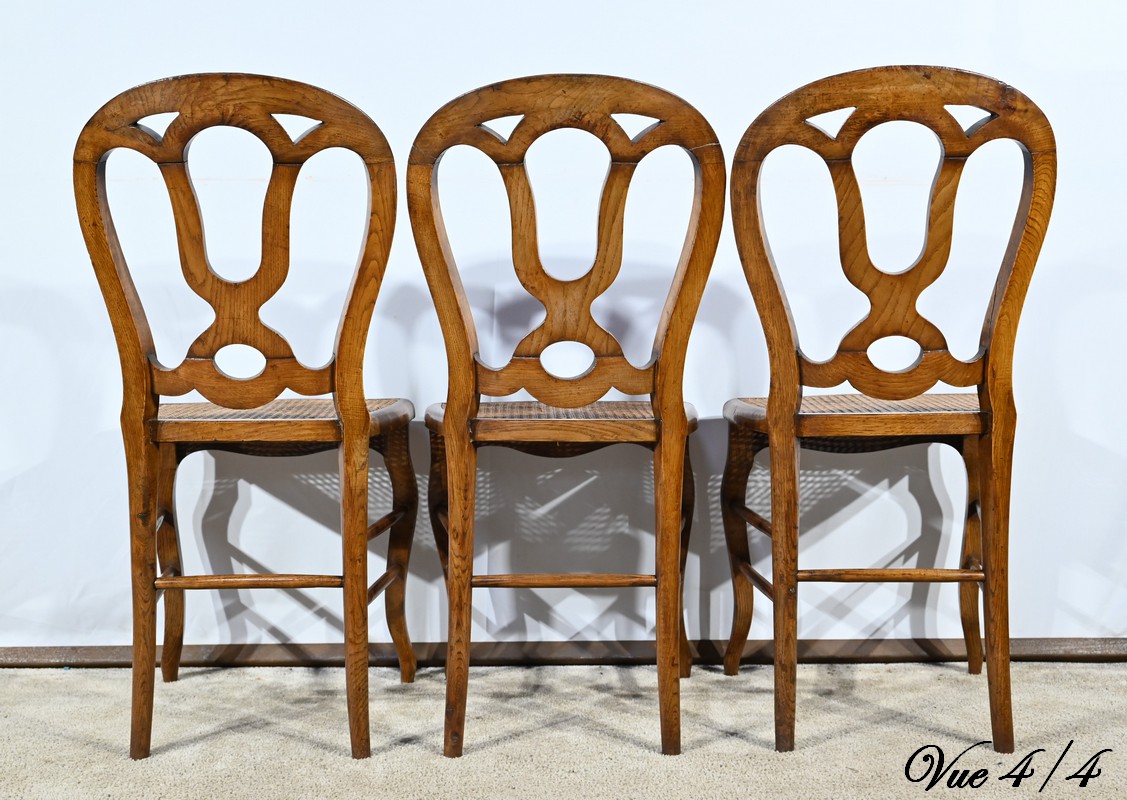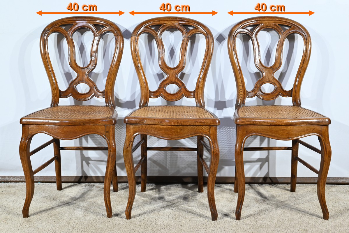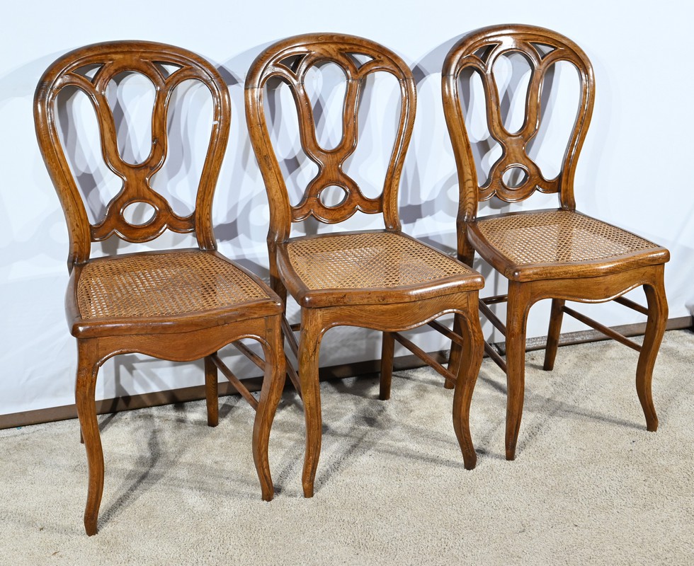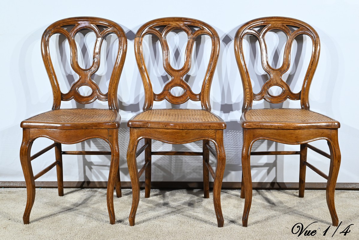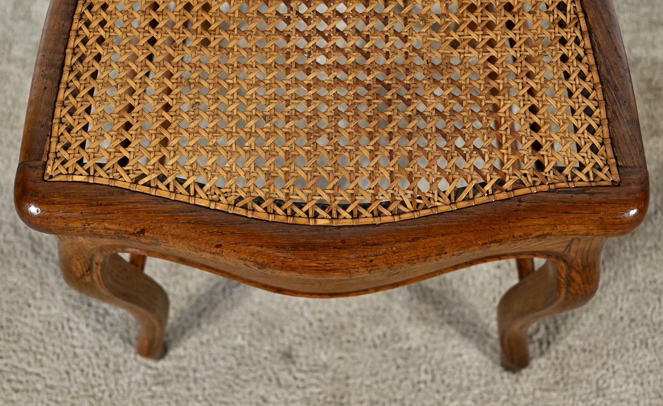 Ces chaises d’époque en chêne massif se distinguent par des pieds de biche cambrés en S soutenant des assises cannées aux ceintures chantournées.