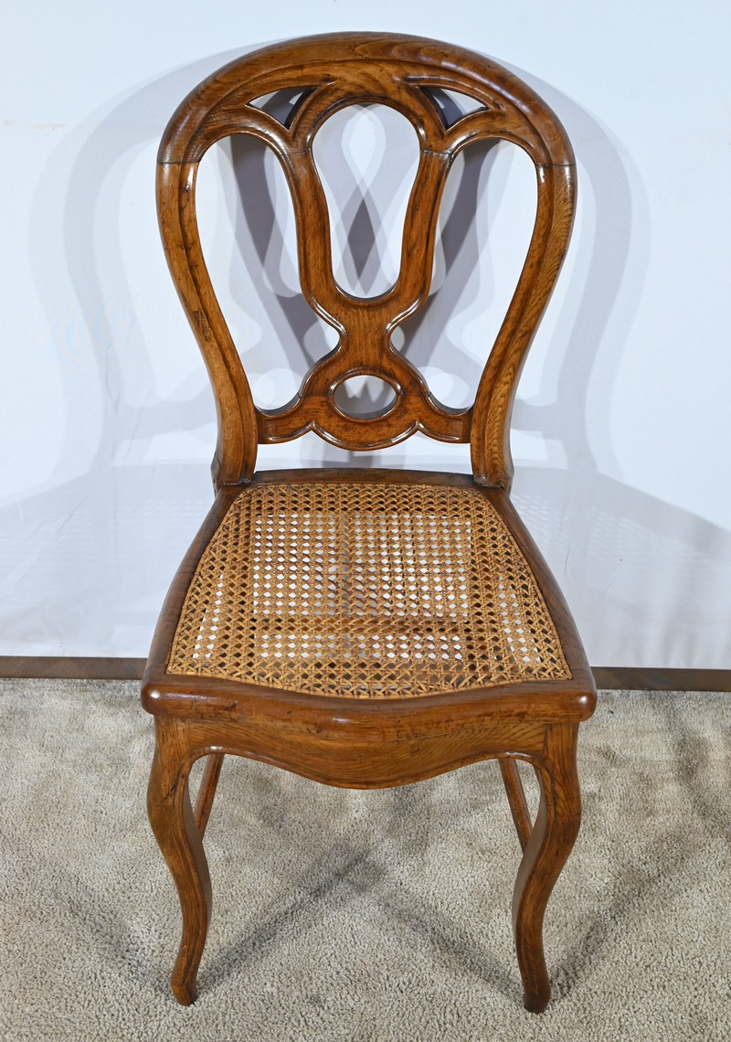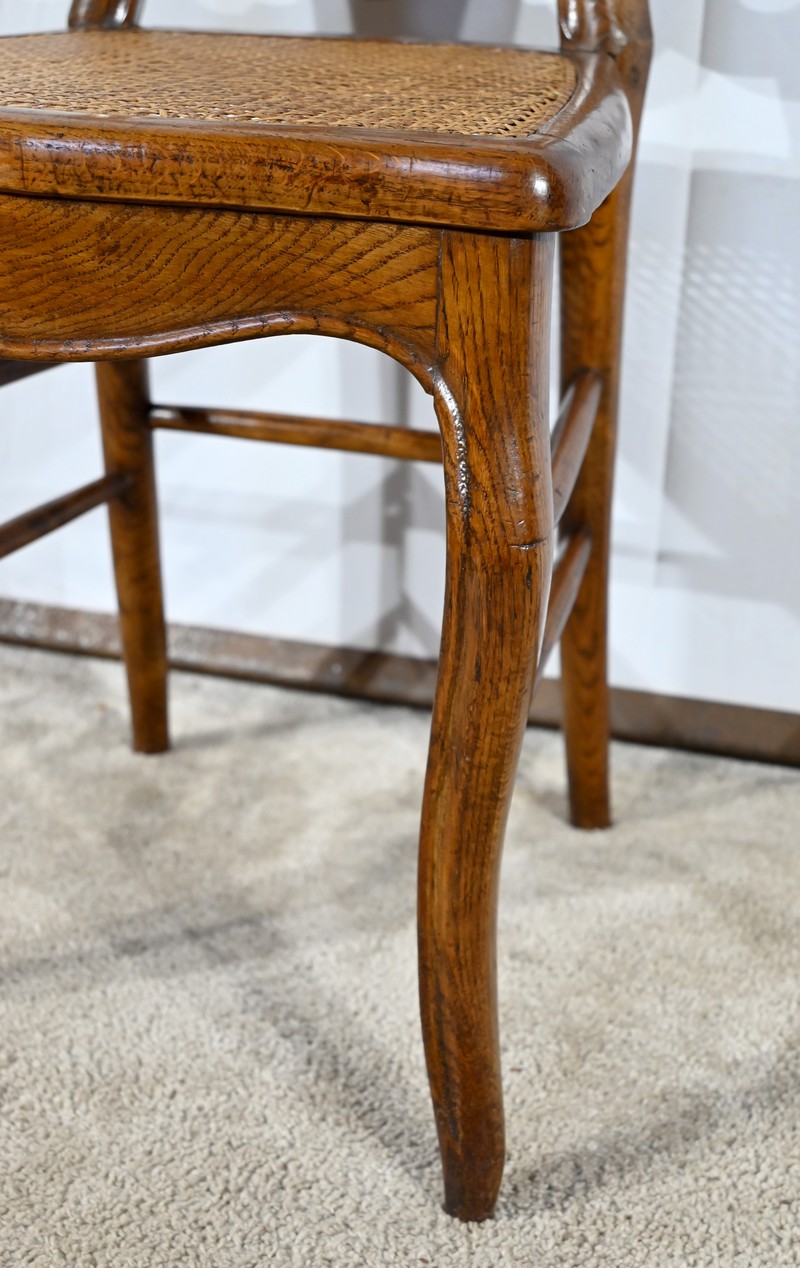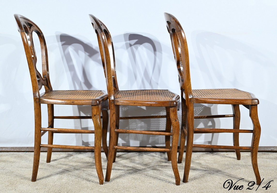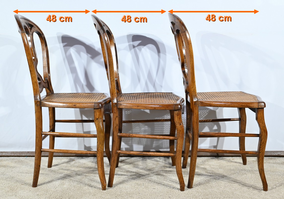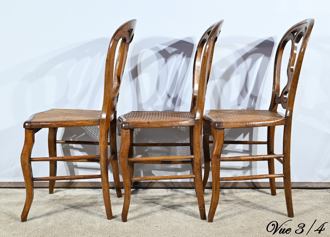 Ces chaises d’époque en chêne massif se distinguent par des pieds de biche cambrés en S soutenant des assises cannées aux ceintures chantournées.