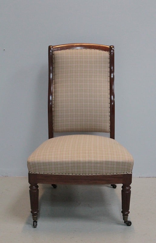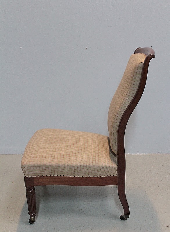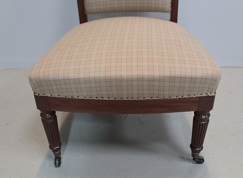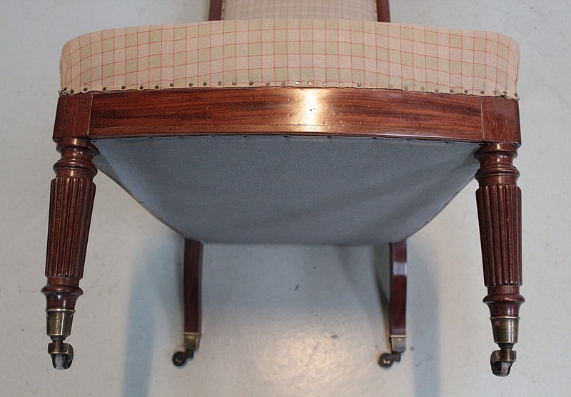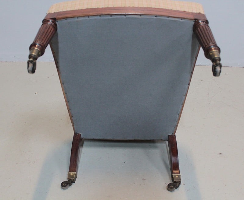 Chauffeuse Restauration en acajou de Cuba reposant sur des pieds avants fuselés à cannelures et des pieds arrières sabre, les 4 sur roulettes.
