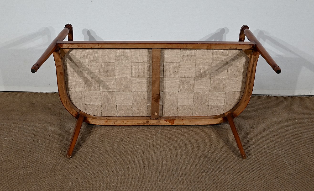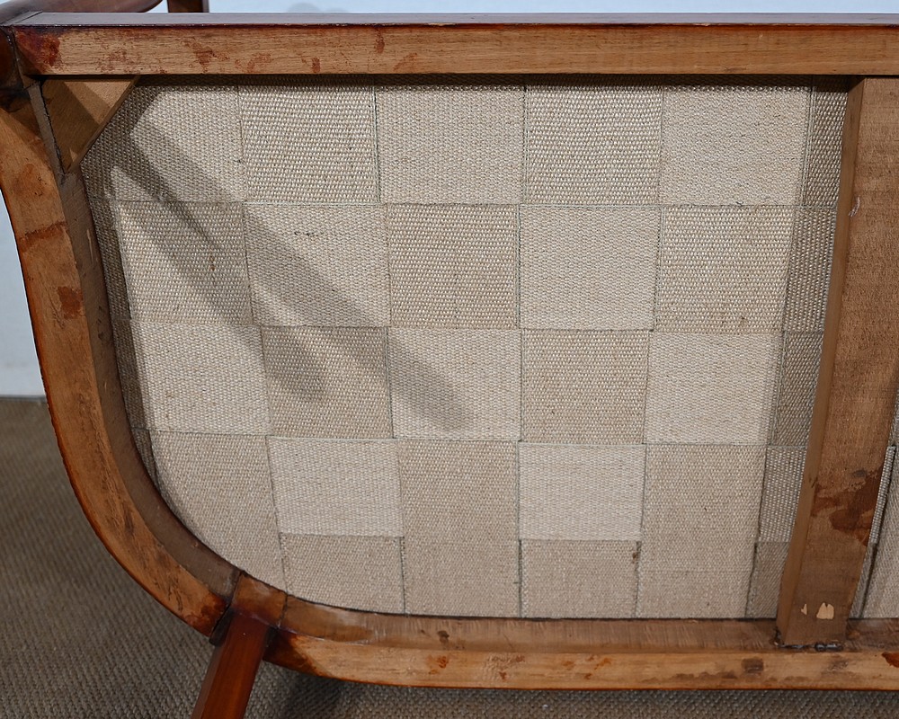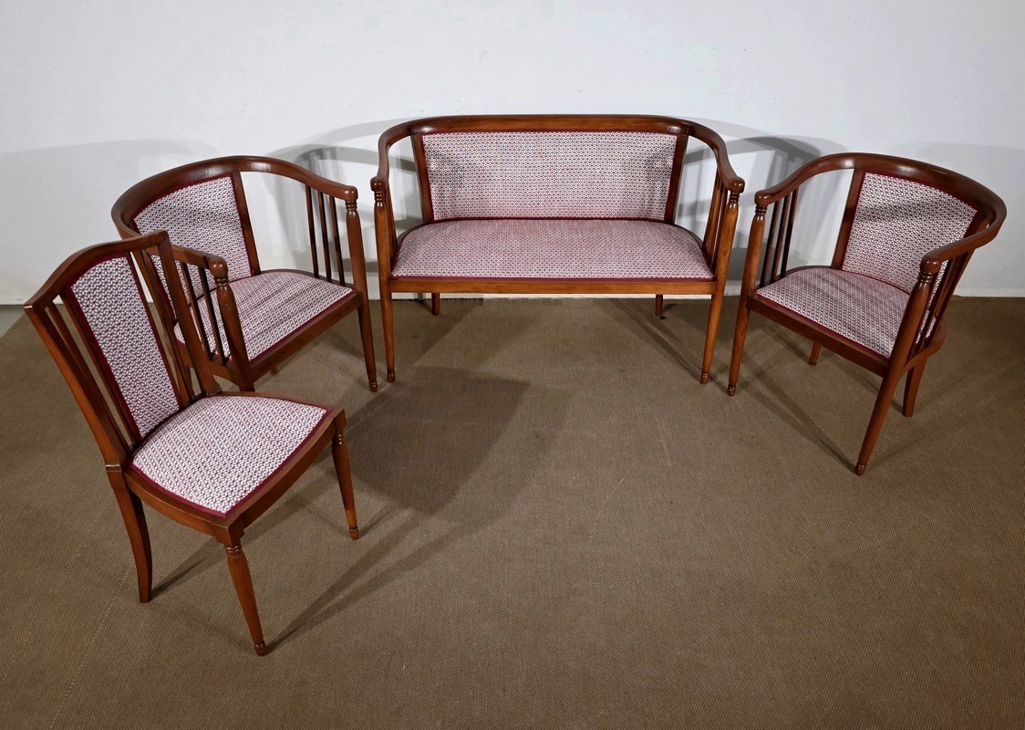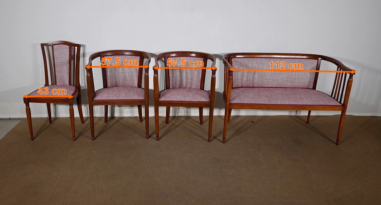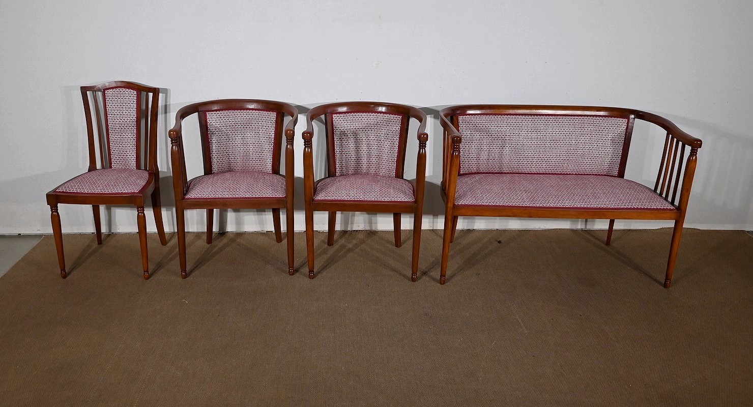 Bel ensemble de salon Art déco restauré et retapissé, constitué d’une banquette deux places, de deux fauteuils et d’une chaise. Le tout en hêtre massif.