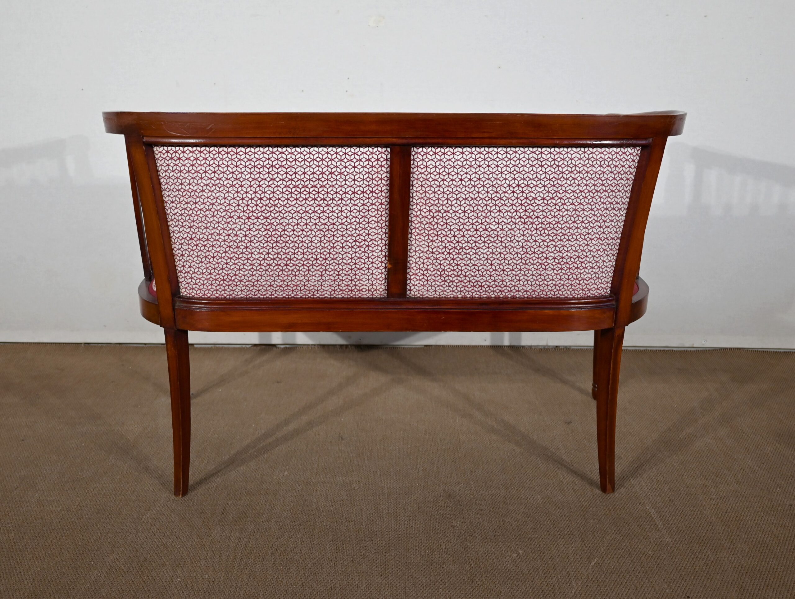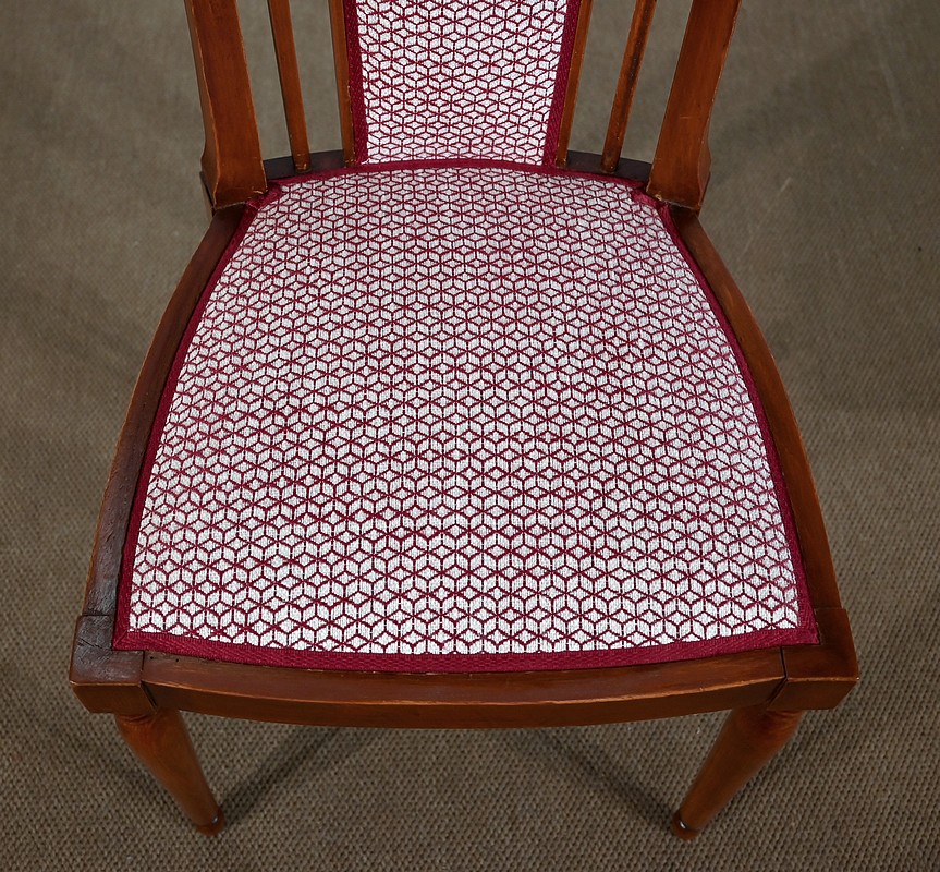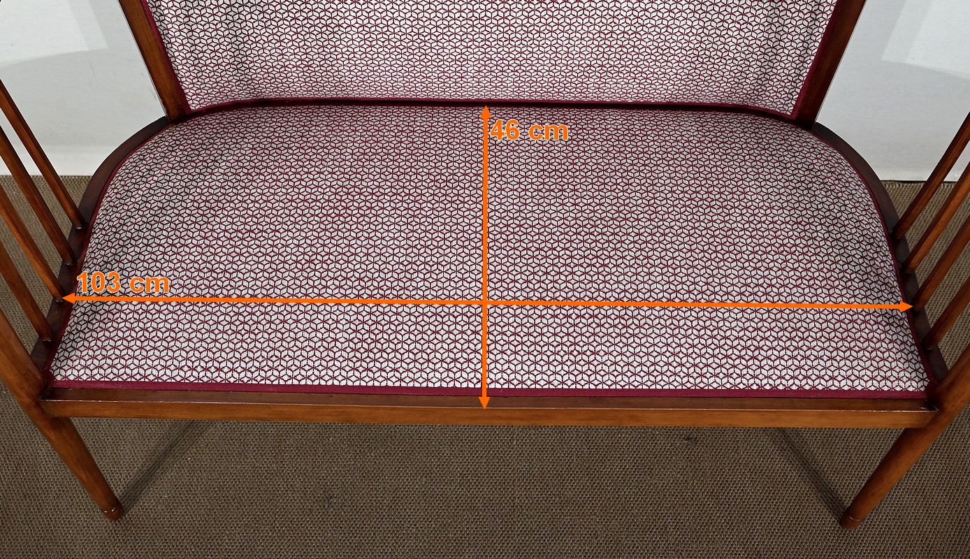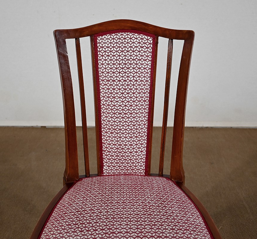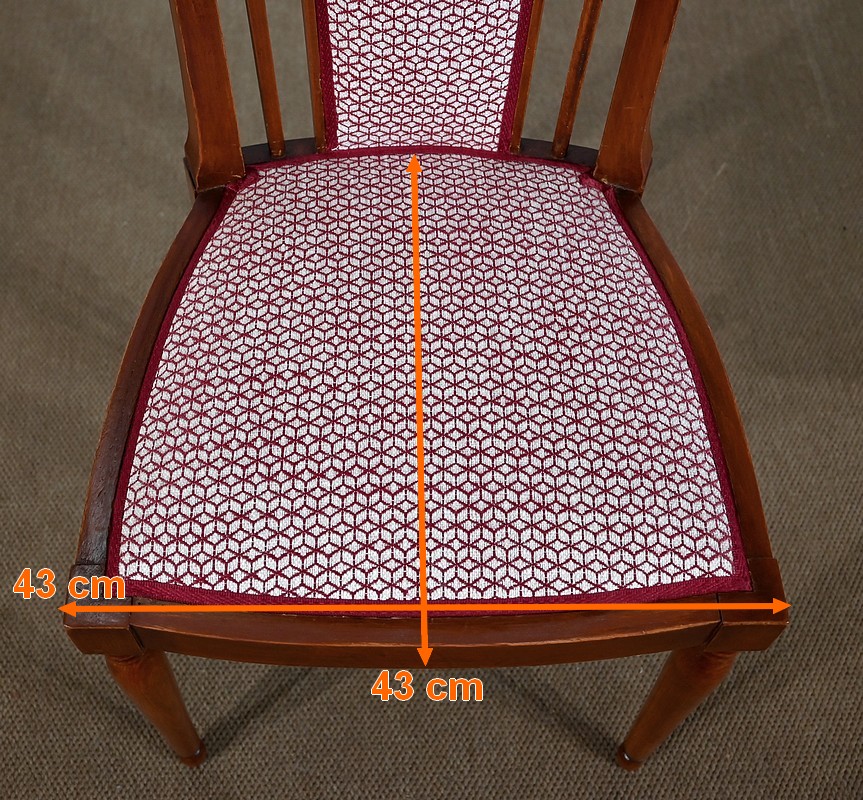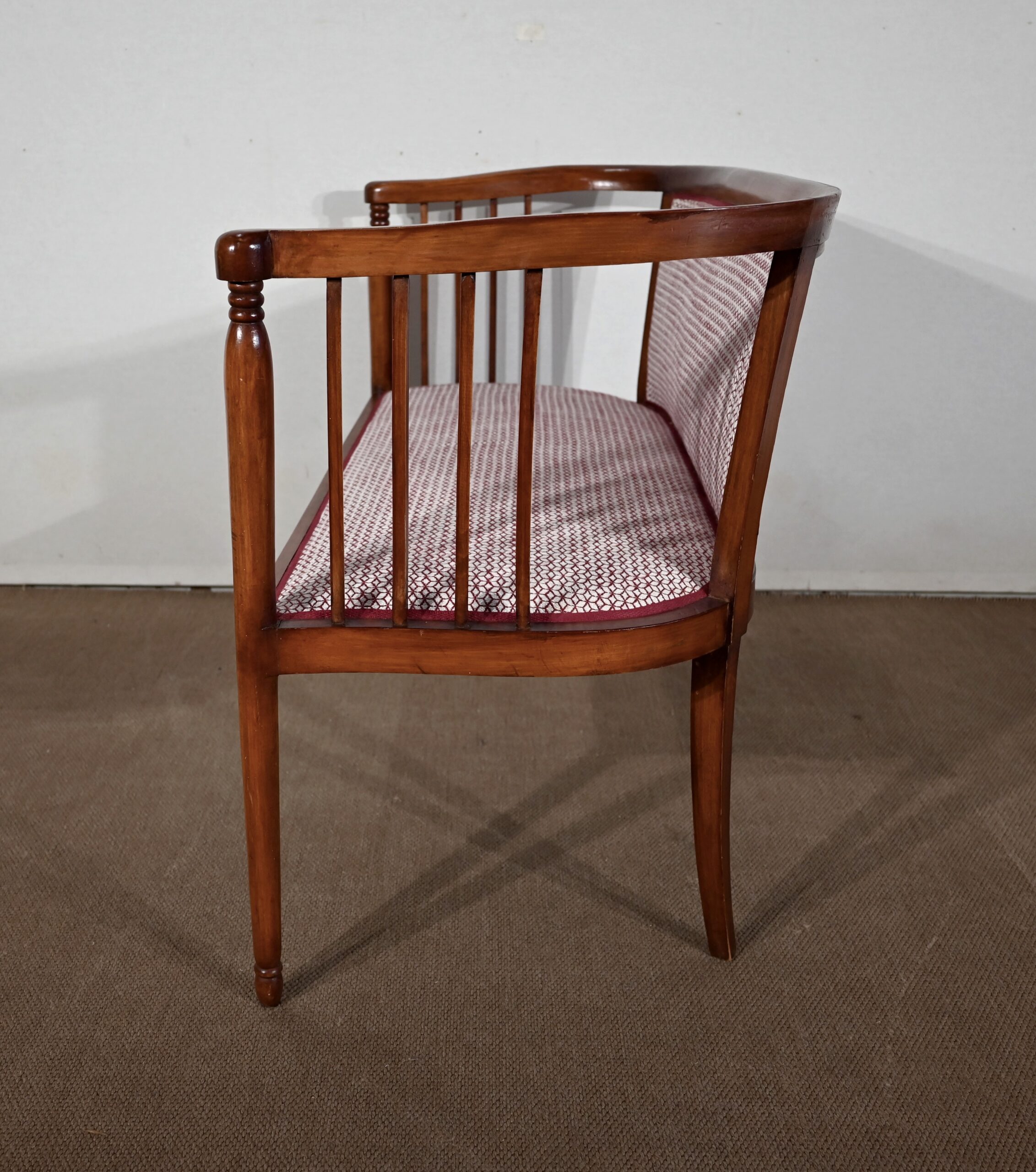 Les dossiers, par leur forme, ainsi que les assises, sont confortables. Chacun des cinq sièges de cet ensemble a bénéficié d’une restauration complète. La tapisserie refaite, avec sangles et crin, est munie d’un tissu aux motifs géométriques blancs et bordeaux, et d’un galon plat.