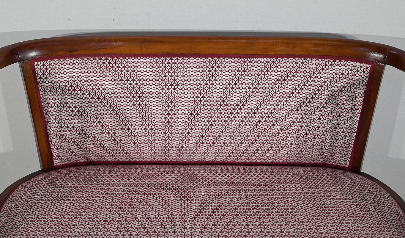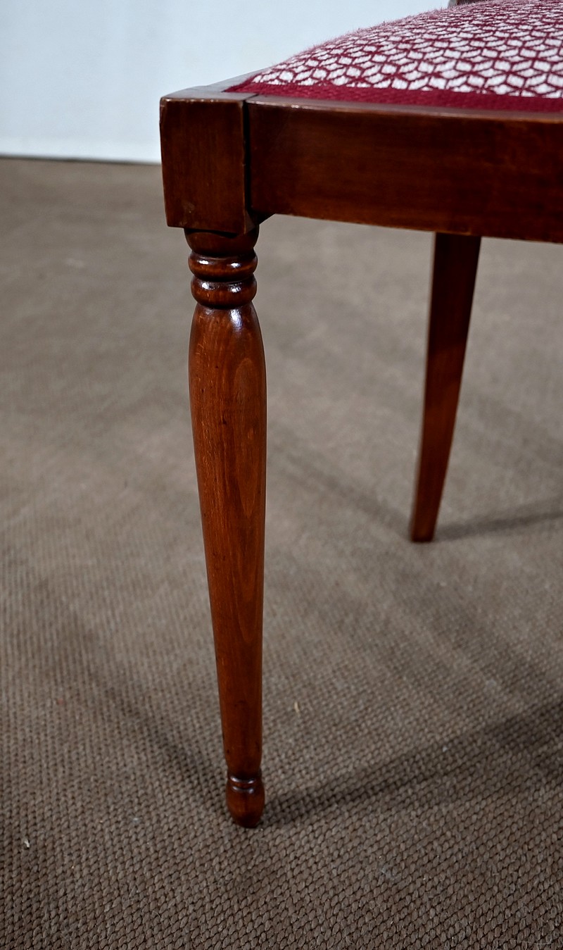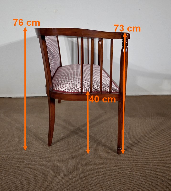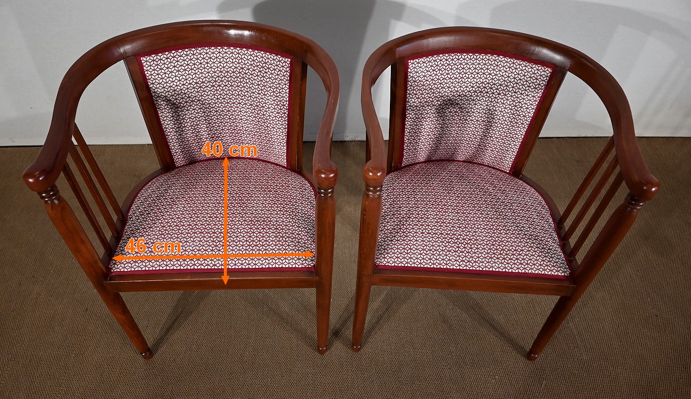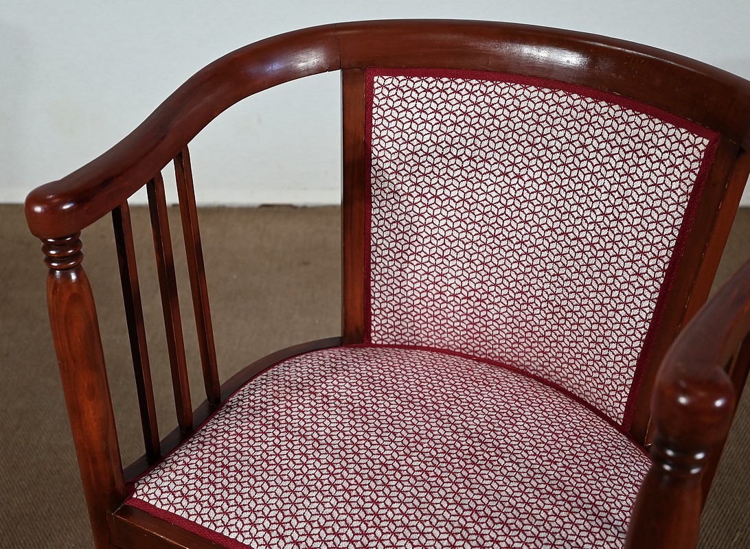 Les dossiers, par leur forme, ainsi que les assises, sont confortables. Chacun des cinq sièges de cet ensemble a bénéficié d’une restauration complète. La tapisserie refaite, avec sangles et crin, est munie d’un tissu aux motifs géométriques blancs et bordeaux, et d’un galon plat.